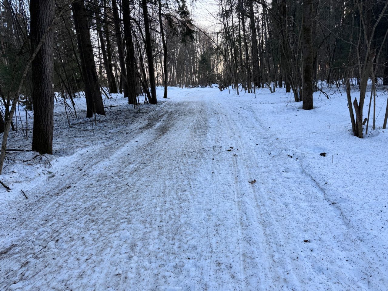 Техника не выходила ни с вечера, ни утром. В результате сначала было очень плохо по окаменевшим следам. После 9 начало отпускать и стало лучше. В лесу грязно, круг 2 км терпимо. В полях чисто, снег нсть