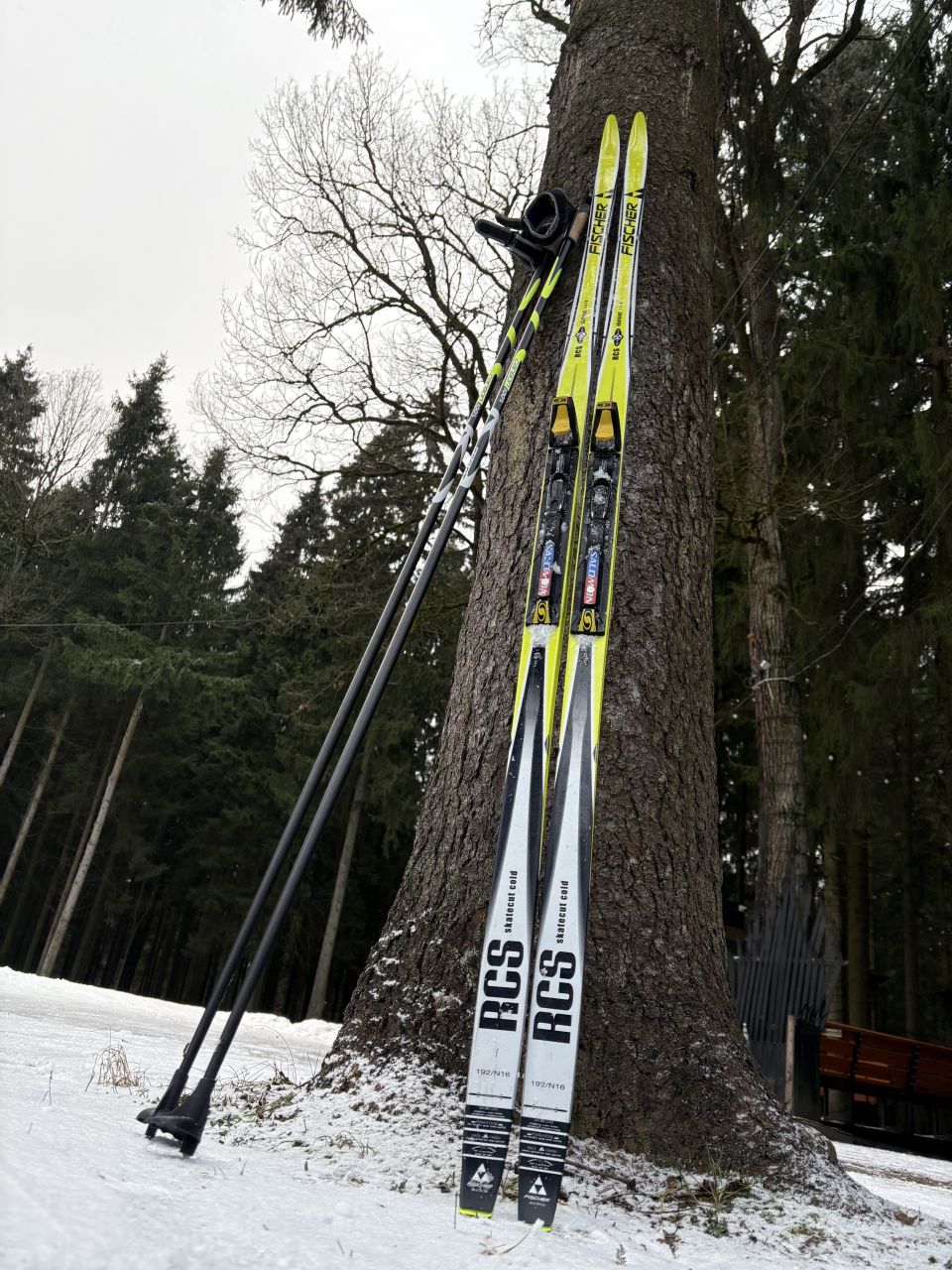 Эко тропа не укатана пока. На основной роллерке самотоп, но снег плотно лежит на асфальте. Подъемы хорошо прикатали, а на спусках еще узковато было. Лыжи асфальт нигде не достают, только наконечники палок.