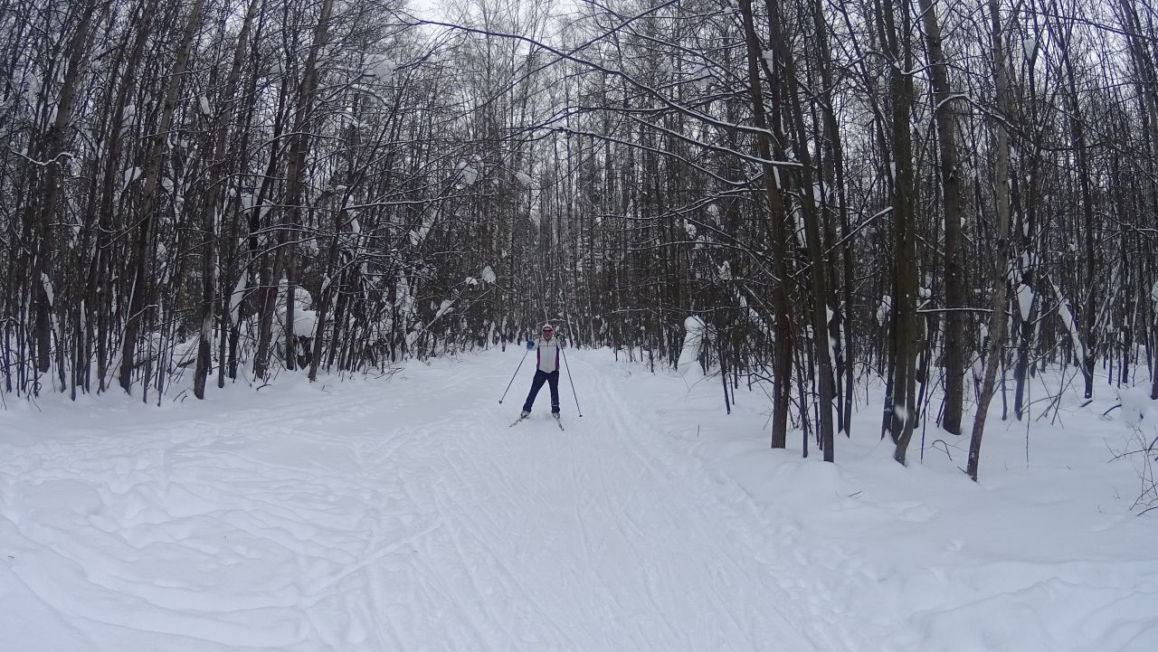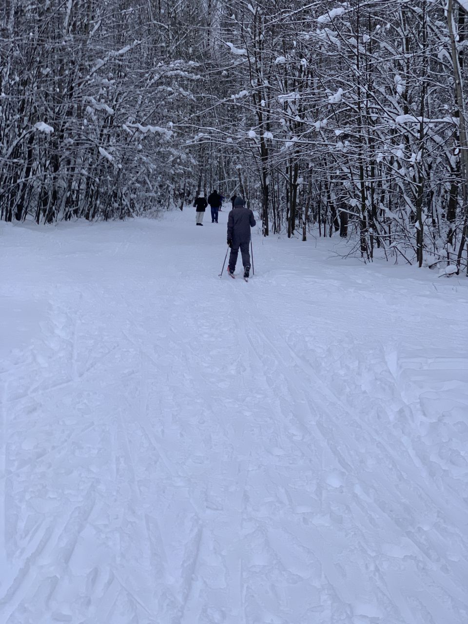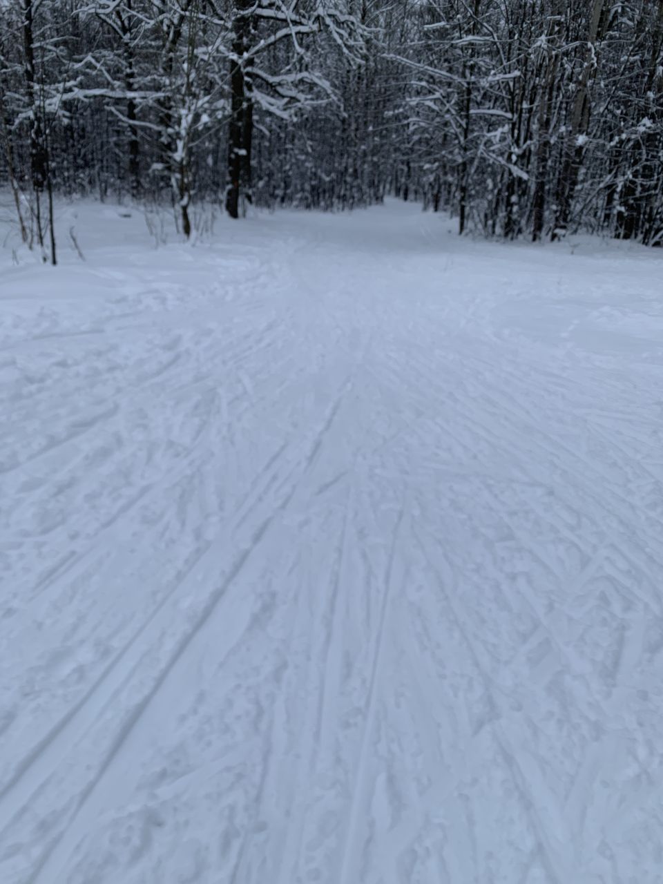 Благодаря народу и лёгкому снегопаду вчерашеие упавшие ветки канули в прошлое, ухабы и неровности подровнялись, для конька узко но катабельно только в одном месте(спуск) метров 200 нет укатанной ширины. Но в целом круг по лесу 1.5 км. И коньком, и классикой можно пройти. Трасска твёрдая в основании припорошена свежим снегом, для моих лыж россики дельта ком вполне катучая. Народа не много, человек десять. Каши, раздевалки, туалета как на московских трассах, нет. Только , лес, лёгкий морозец, белый натуральный снег и масса позитива.
