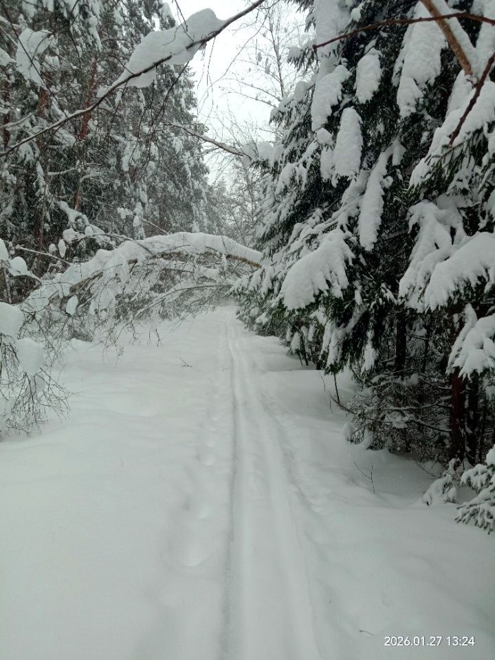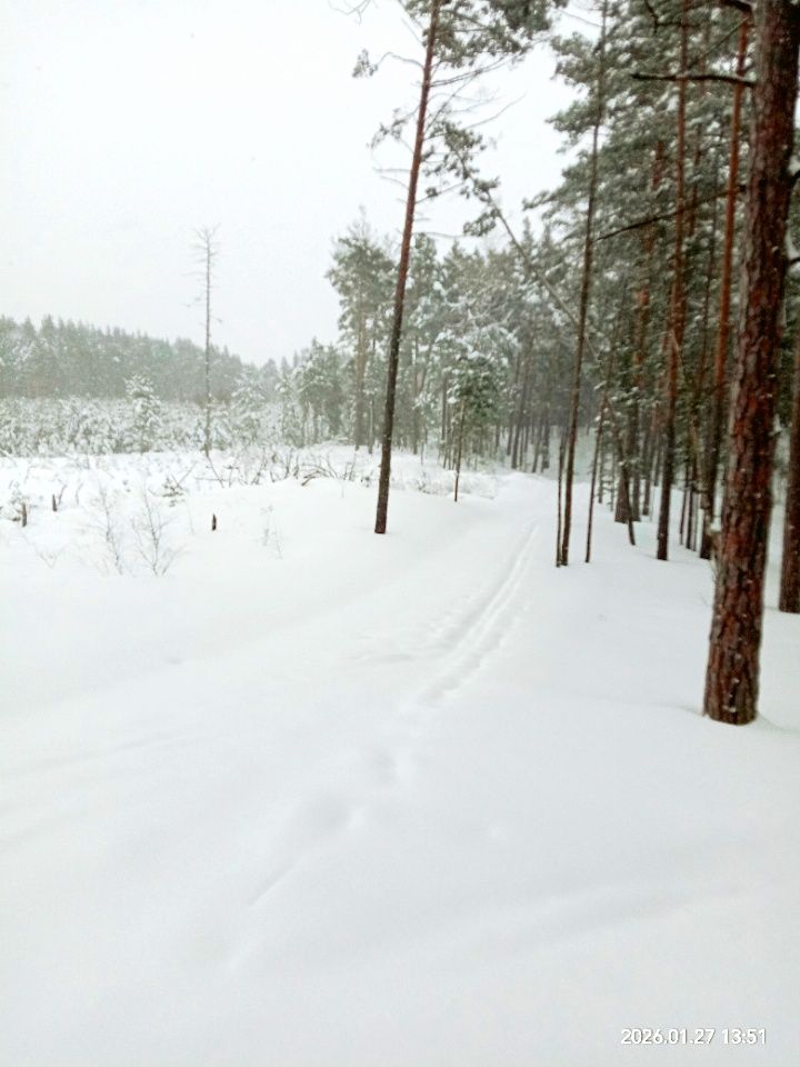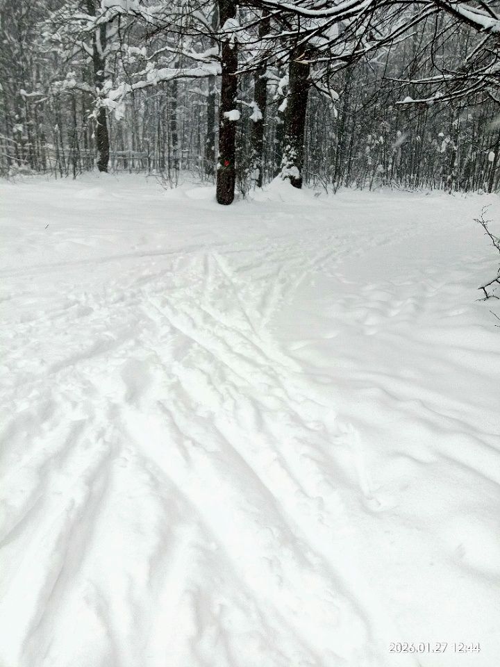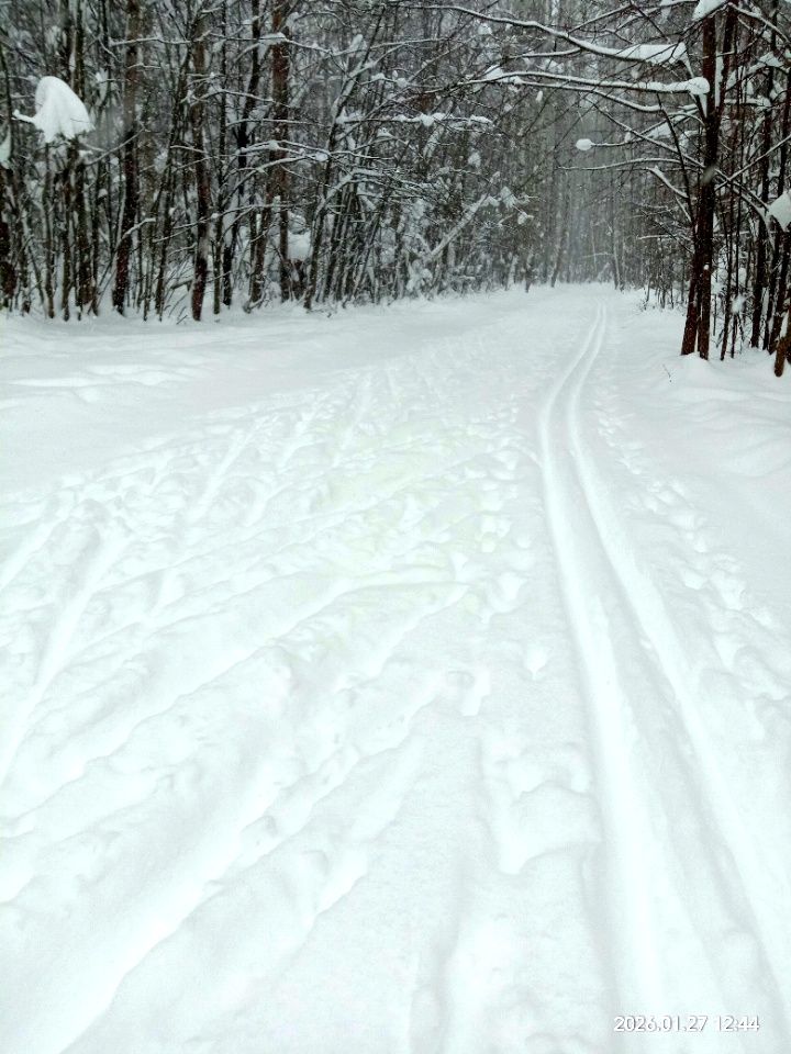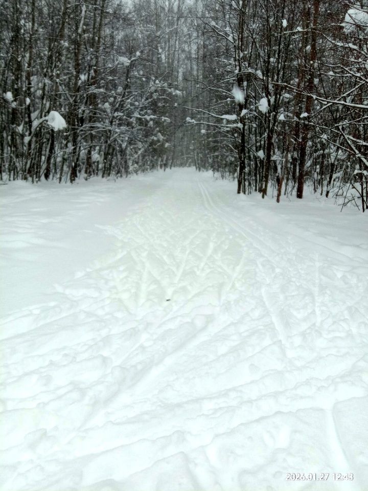 12.00. 27.01.26г. Трасса живёт несмотря на продолжение снегопада. На территории СШ юнные спортсмены лыжню топчат (1км. ) , и по лесу (1.5км.) неплохая лыжня классикой была укатана самотопом. . Ребята пробовали коньком но быстро отказались от этой затеи, очень много рыхлого снега. Как минимум три человека пробили лыжню под классику в сторону котлована (5.500+5.500км.).