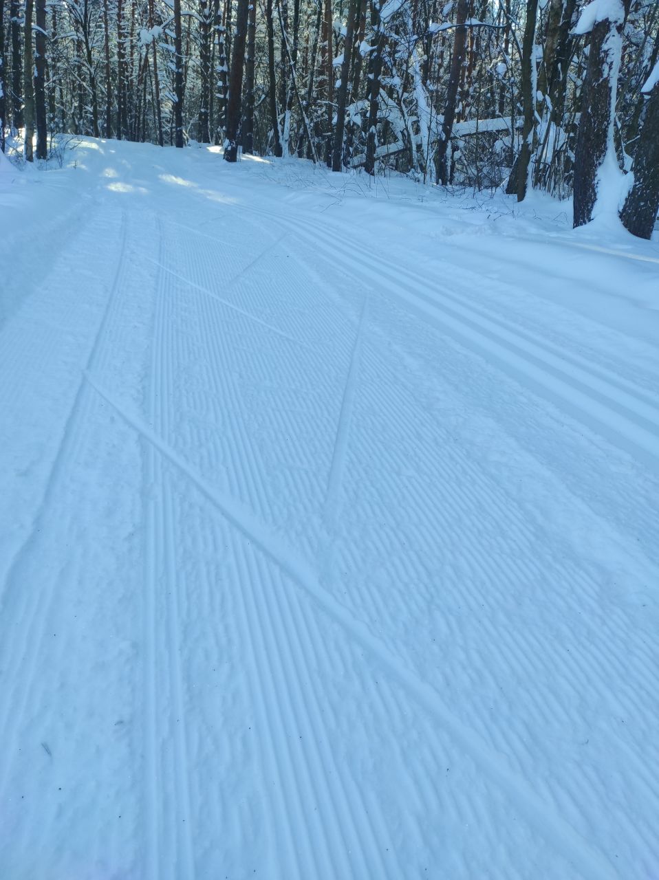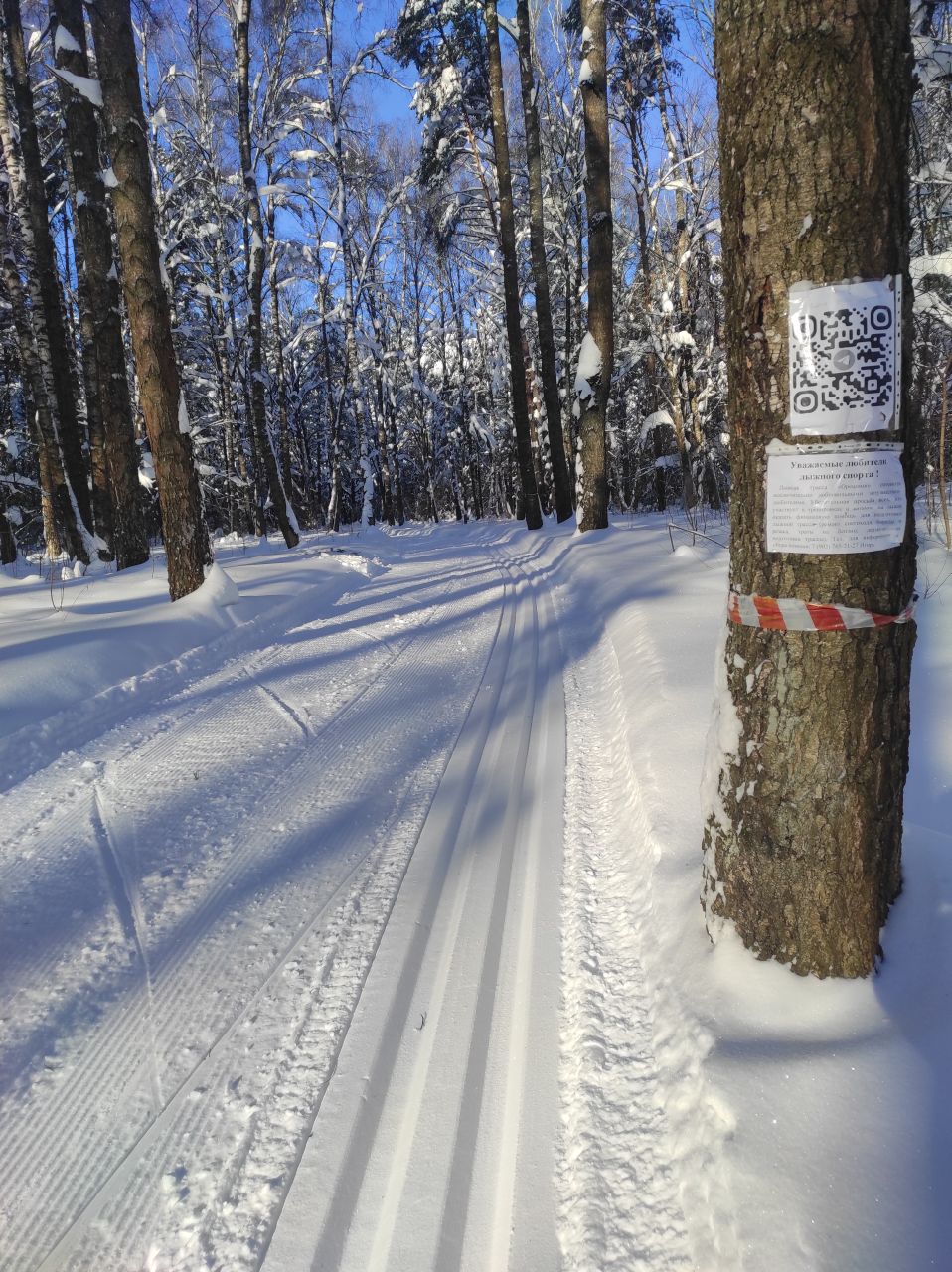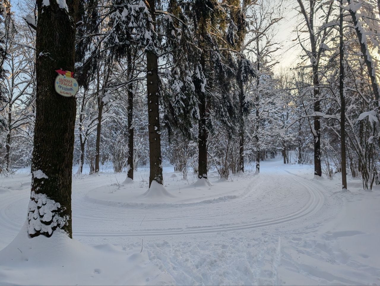 Ногинск, лесопарк Орешник. Полный круг примерно 7700. По всему кругу нарезана идеальная лыжня, ширина трассы позволяет раскалывать коньком