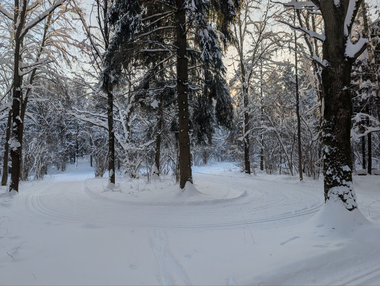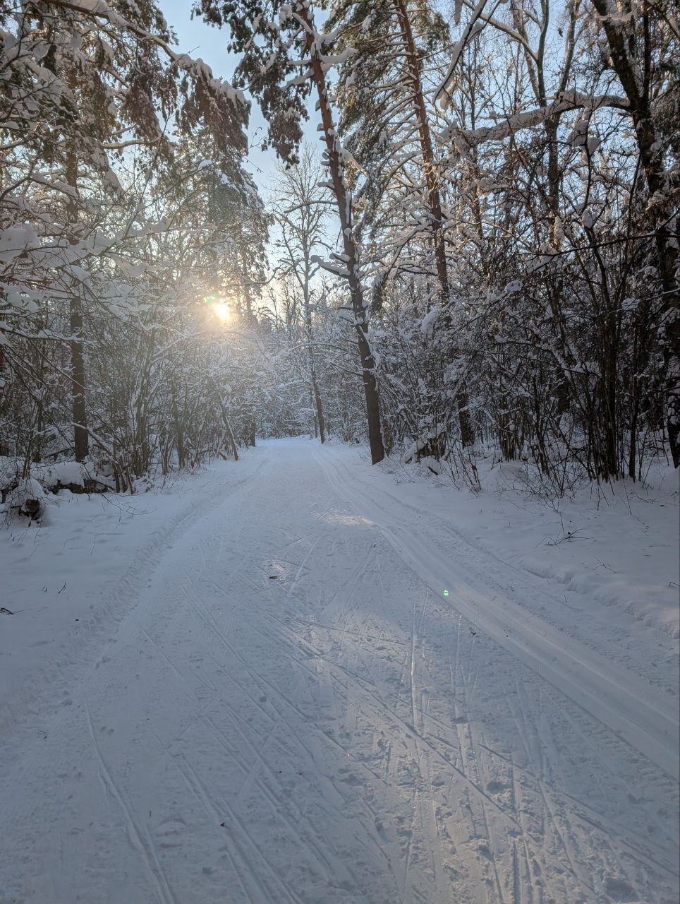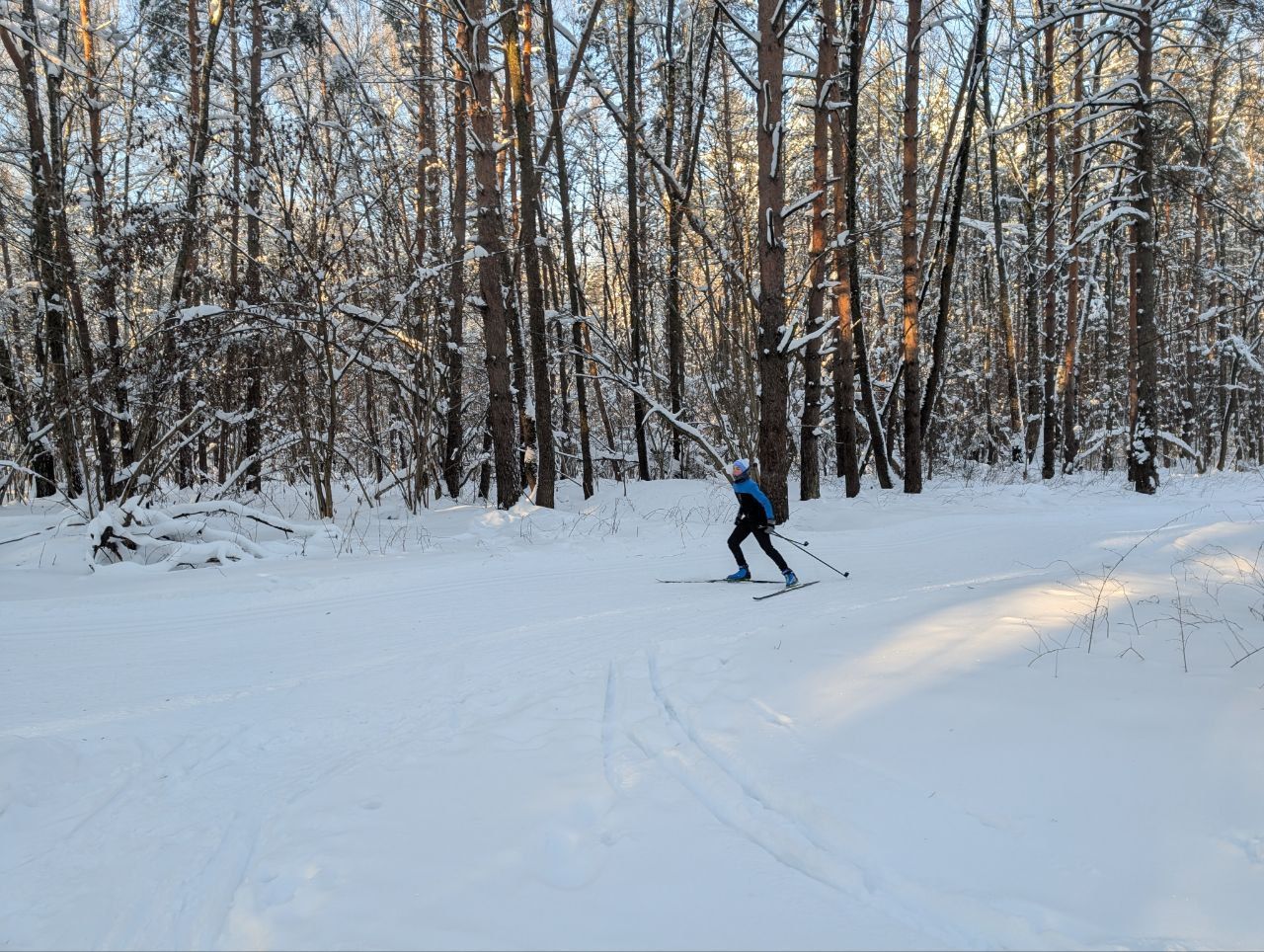 Ногинск, лесопарк Орешник. Полный круг примерно 7700. По всему кругу нарезана идеальная лыжня, ширина трассы позволяет раскалывать коньком