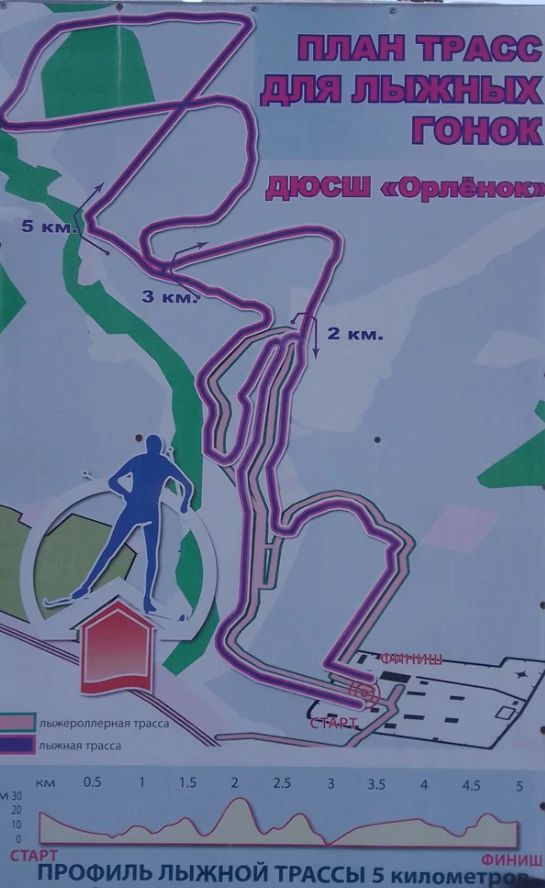Спортивная трасса с большим перепадом высот длиной 5 км и любительская трасса для умеренного катания длиной 5 км. Расположены в сосновом лесу. Трассы регулярно подготавливаются ратраком. Есть асфальтовая лыжероллерная трасса 2,5км. Есть освещенный участок 2,5км (работает до 21:00). Есть общедоступная раздевалка. Приезжают спортсмены на сборы, есть размещение, но условия спартанские (комнаты на 10чел), есть питание. На трассе проводятся соревнования по лыжным гонкам. Трассы на территории спортивного центра, вход 50р в светлое время и 100р в темное время суток. Работает прокат с 10:00 до 18:00, комплект лыж 300р/час. Трасса доступна на общественном транспорте.