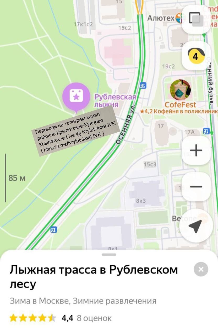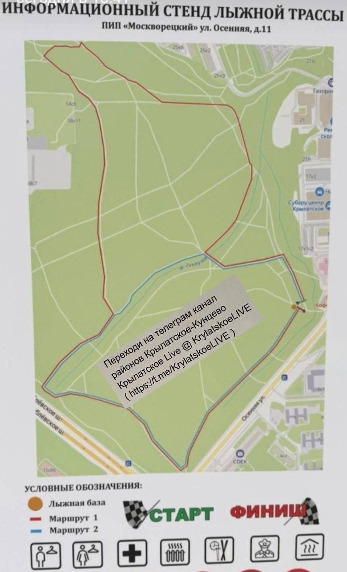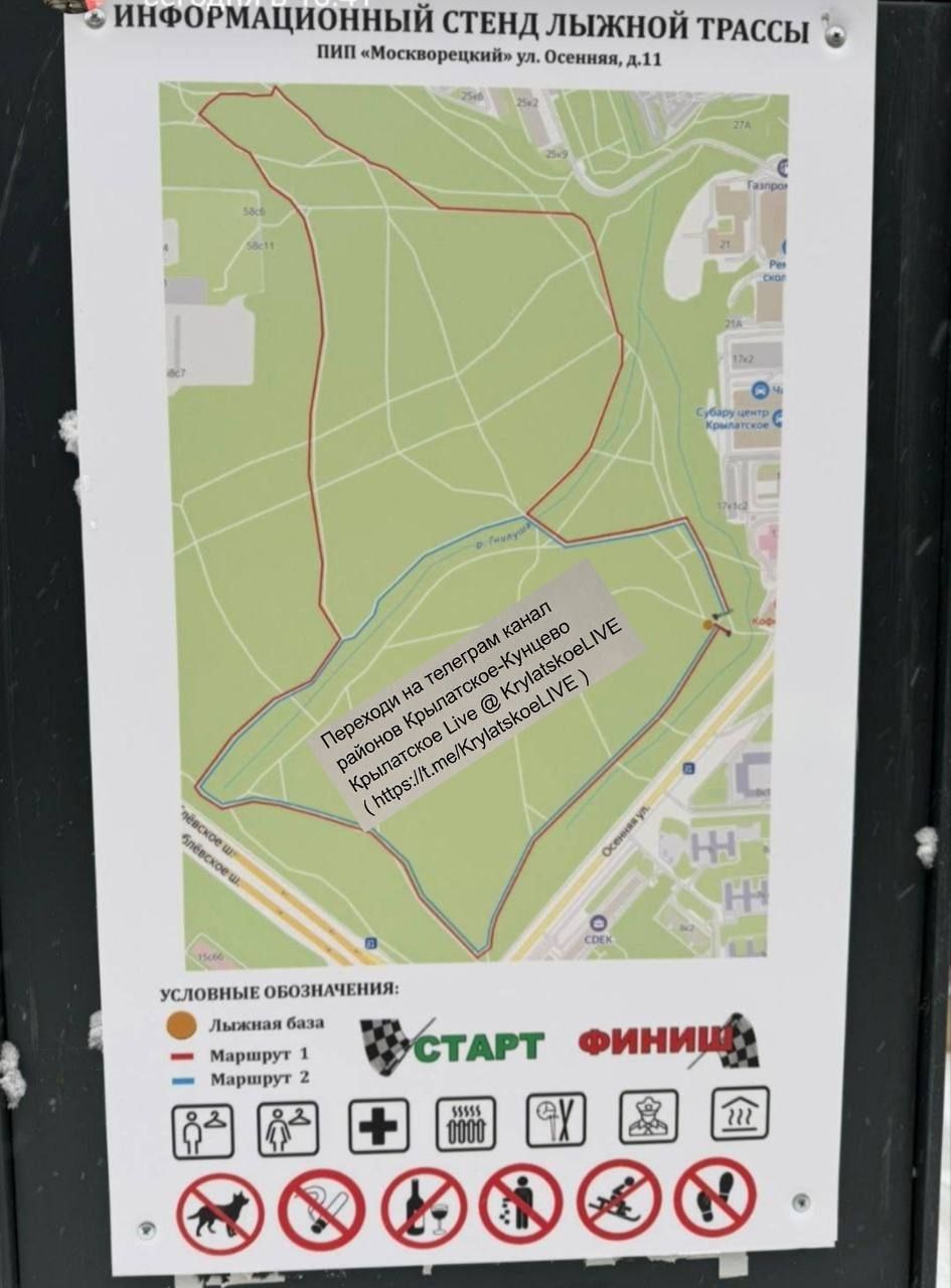 В районе Крылатское вход в лес на ул. Осенняя, д.11 открыта лыжная трасса. Есть прокат лыж ботинок и палок (отдельное строение в лесу). Трасса предназначена для классического хода. (См. Фото и схему)