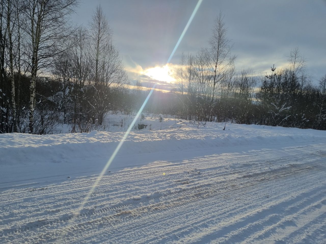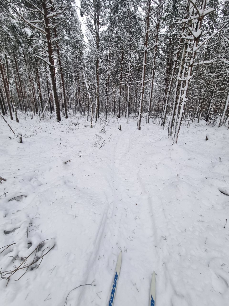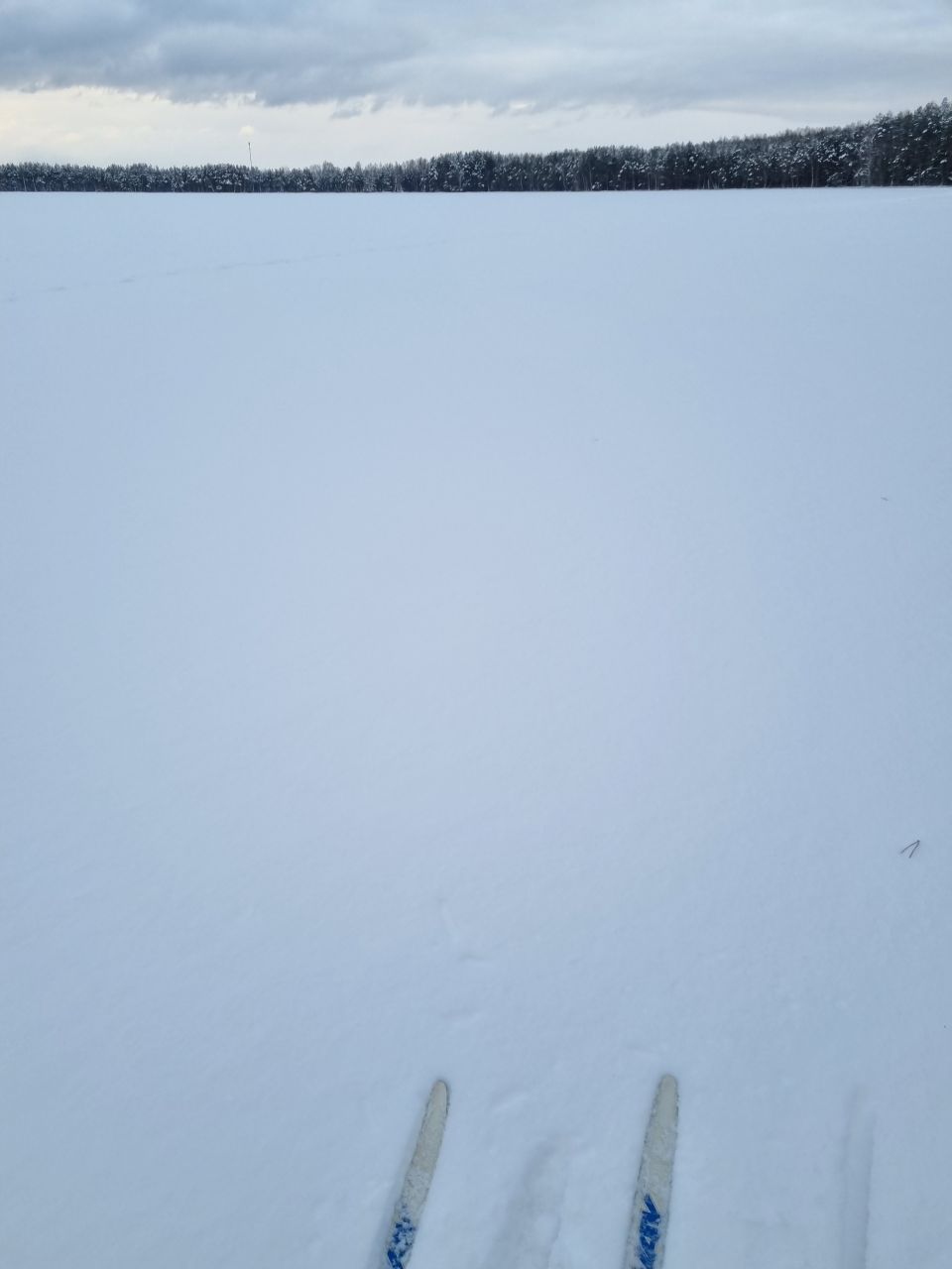 Снежно-водяная дрестня под снегом замёрзла. Снега немного. Я довольно много проехал коньком, даже по целине. Скольжение было очень хорошее.