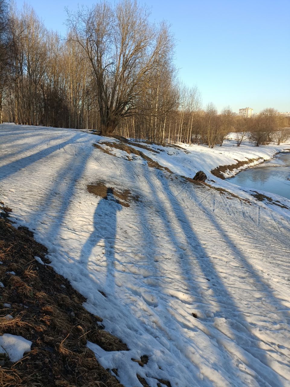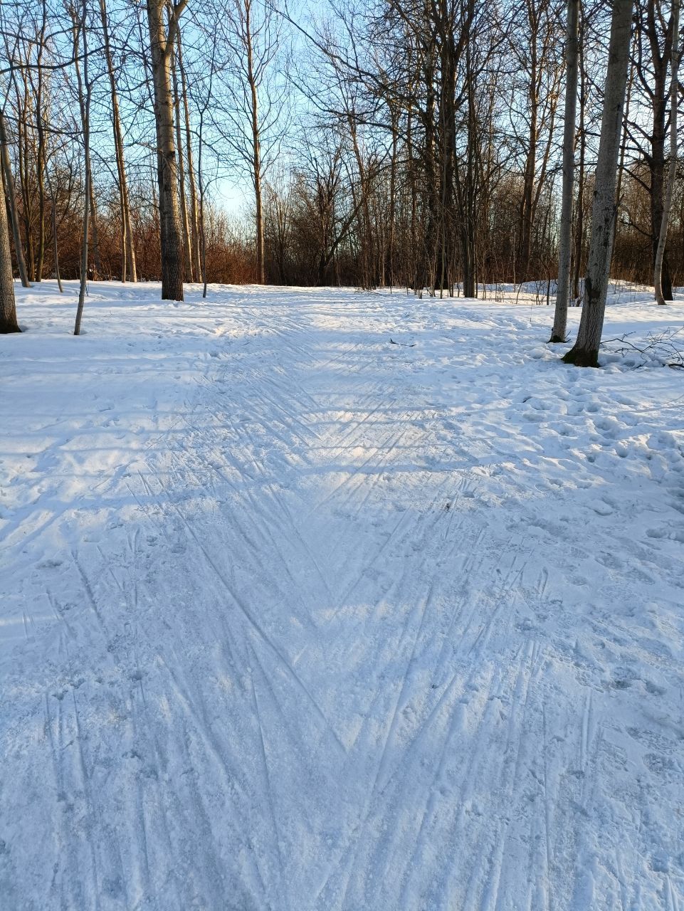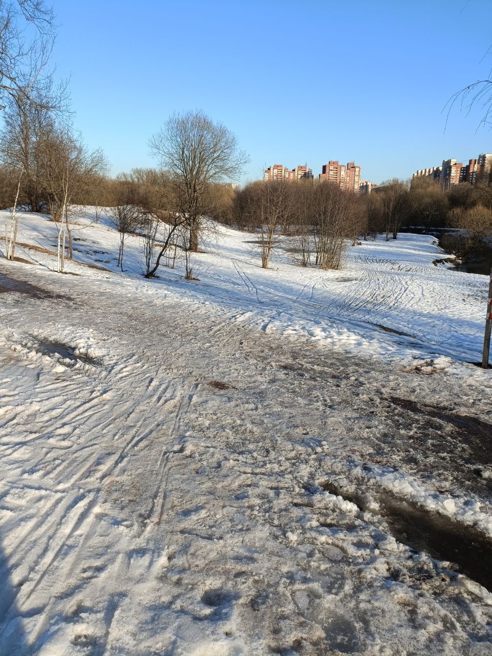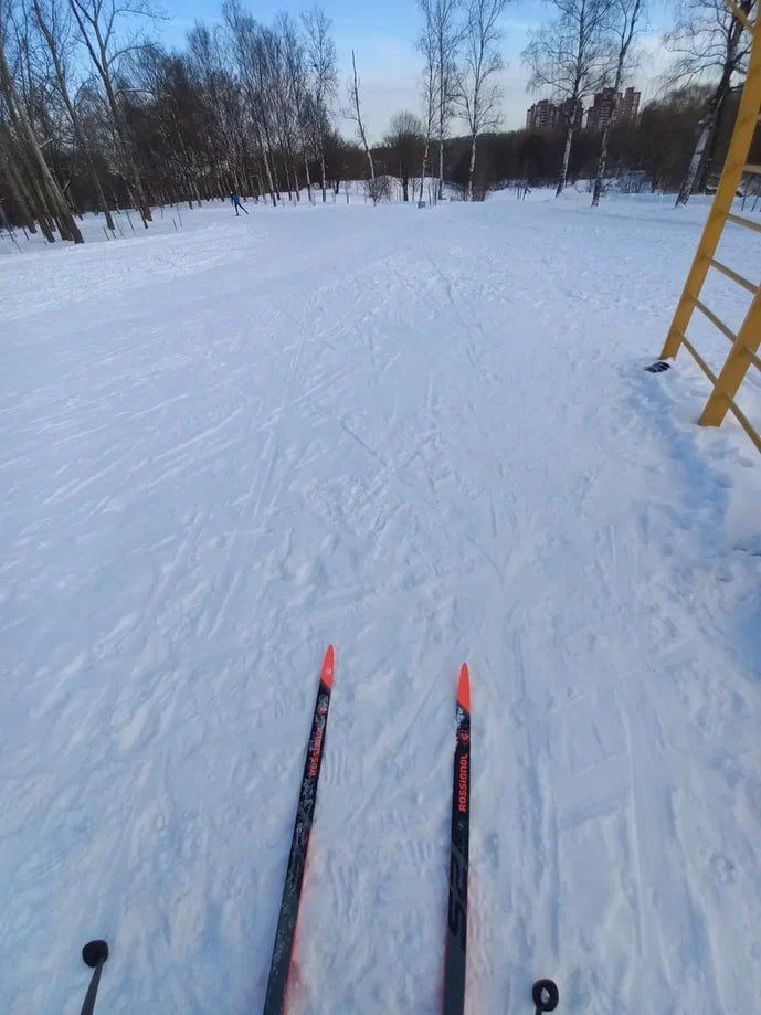 Полежаевский ещё очень рано. Подложки из льда нет, поэтому камни и листья тормозят лыжи. Только пешком на асфальтовых. Была только на стадионе...