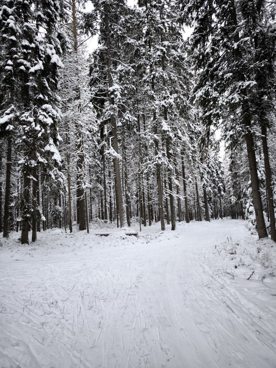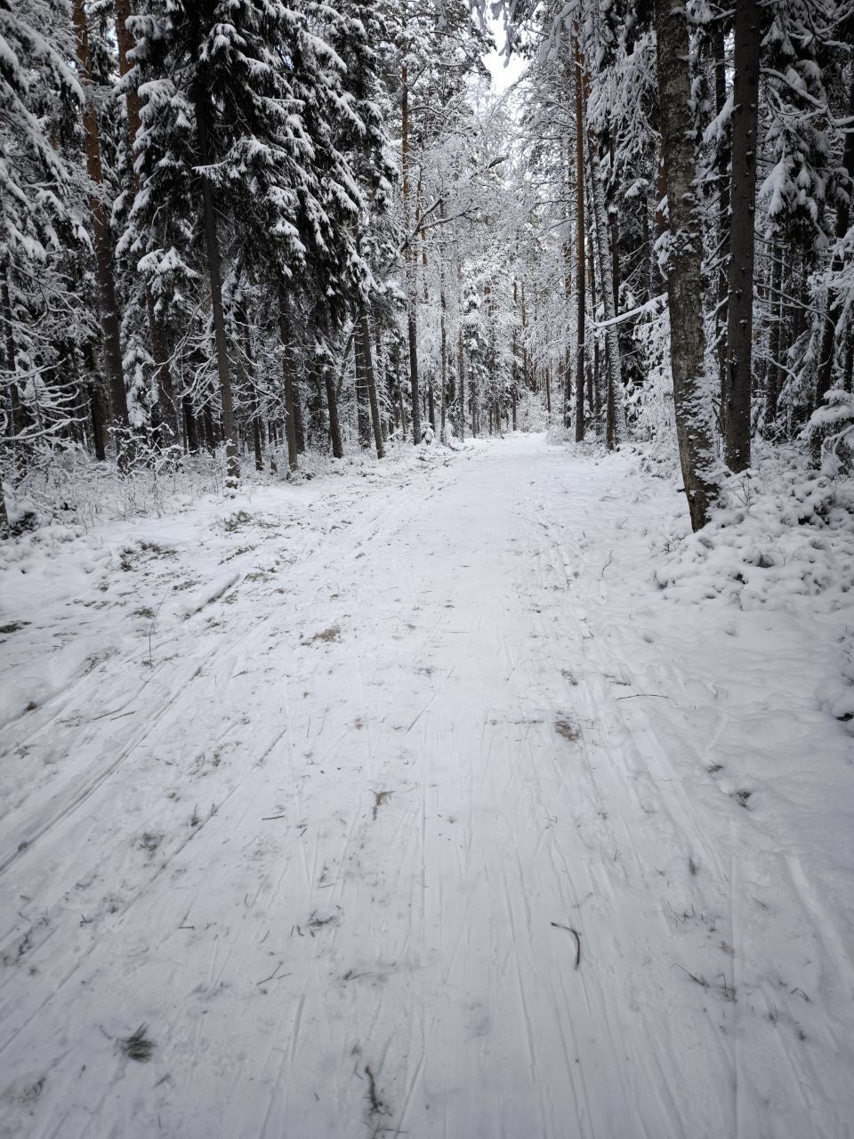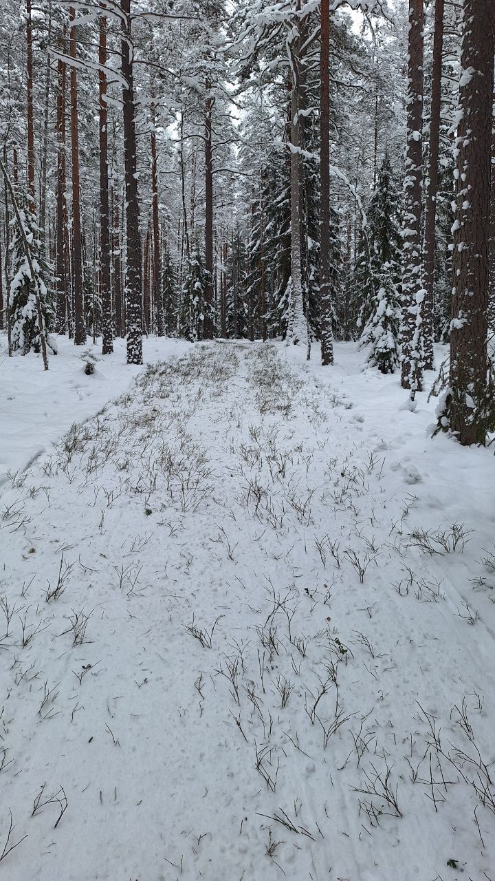 Снег наконец-то выпал, но пока не так много, как хотелось бы. Сейчас сквозь снег всё ещё кое-где торчат трава, черника, корни и щебёнка.