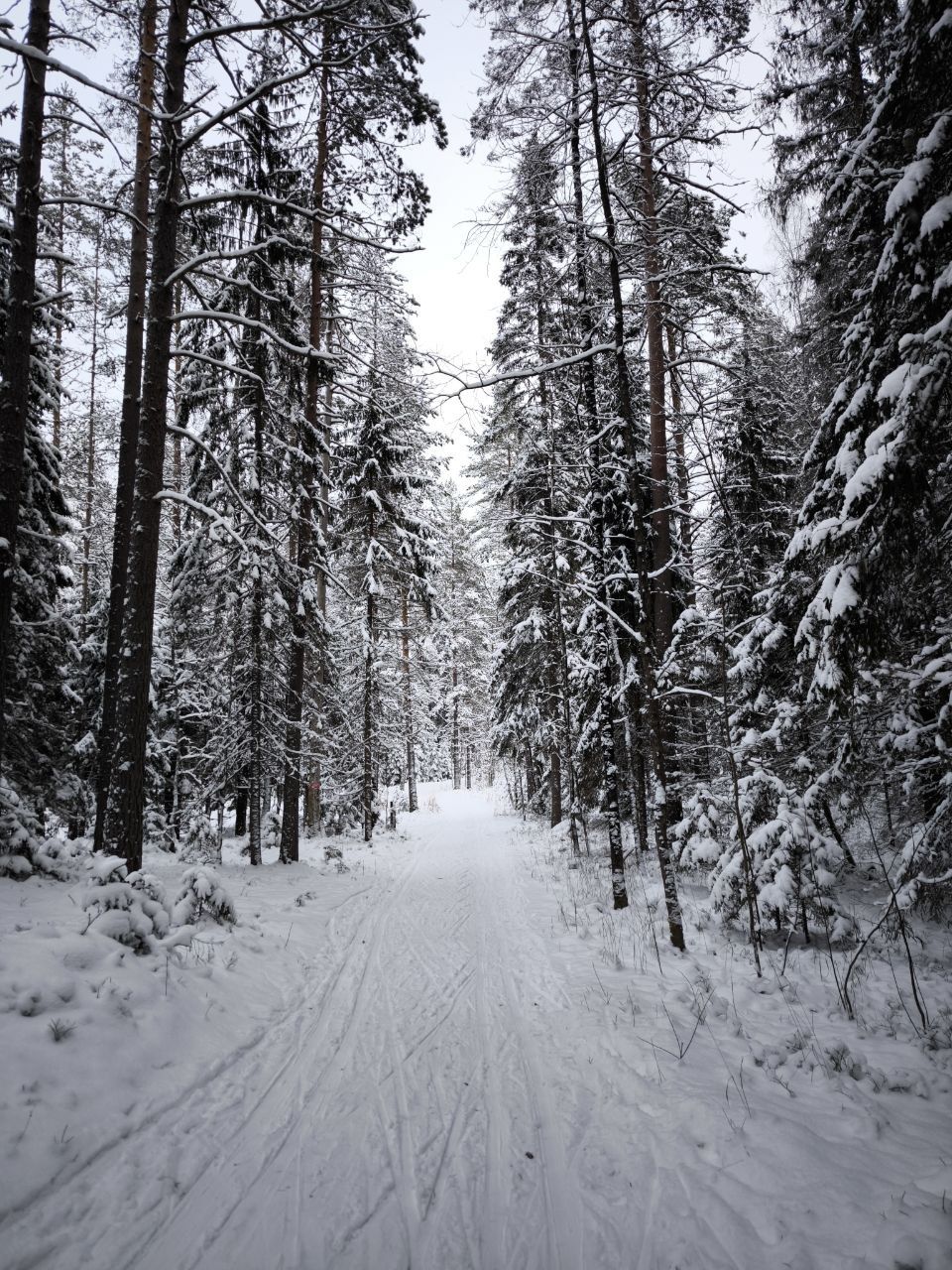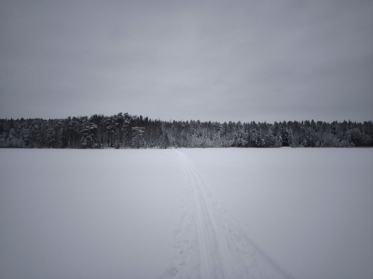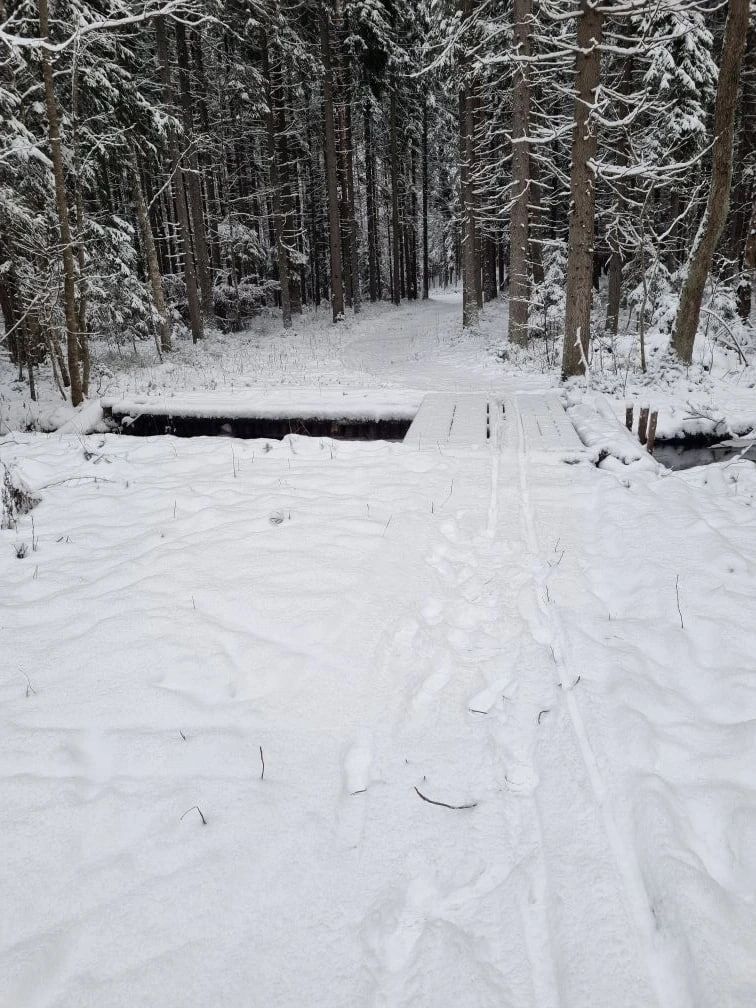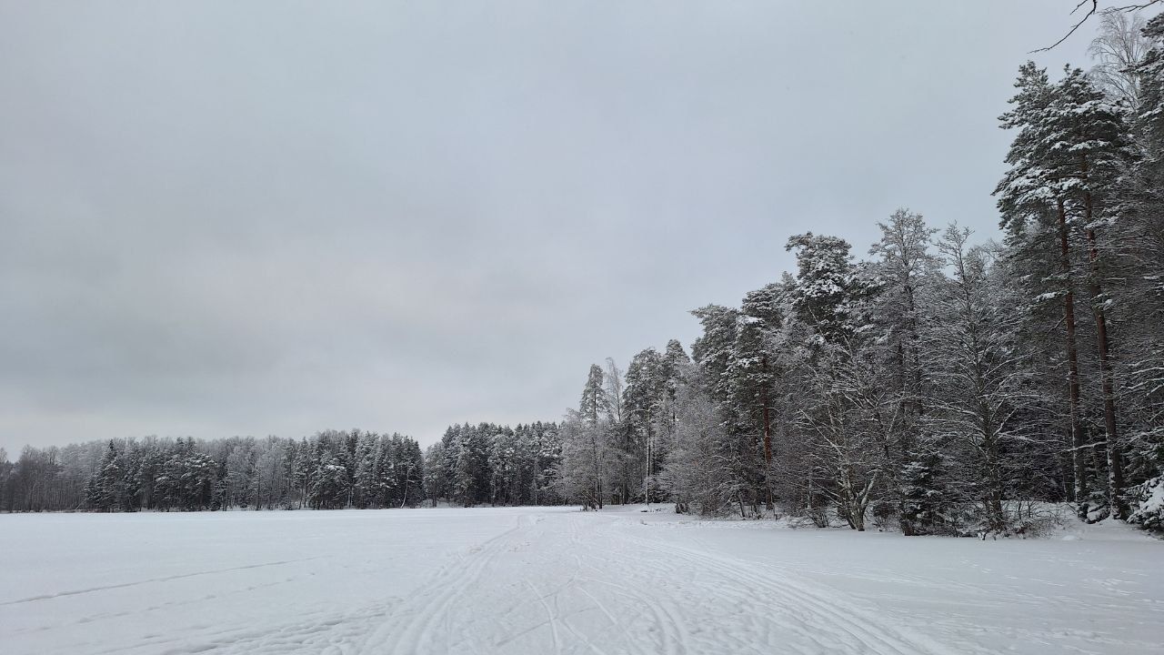 Снег наконец-то выпал, но пока не так много, как хотелось бы. Сейчас сквозь снег всё ещё кое-где торчат трава, черника, корни и щебёнка.
