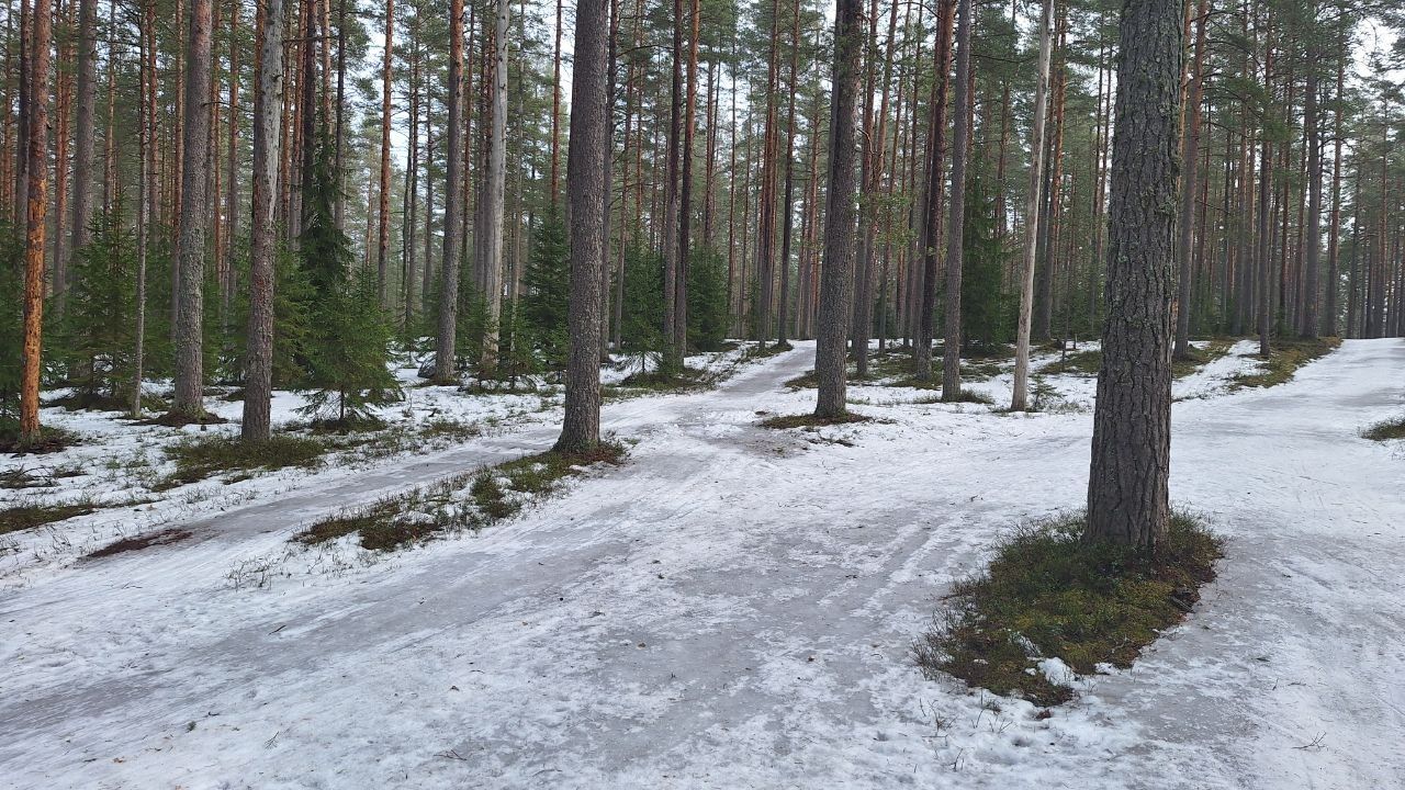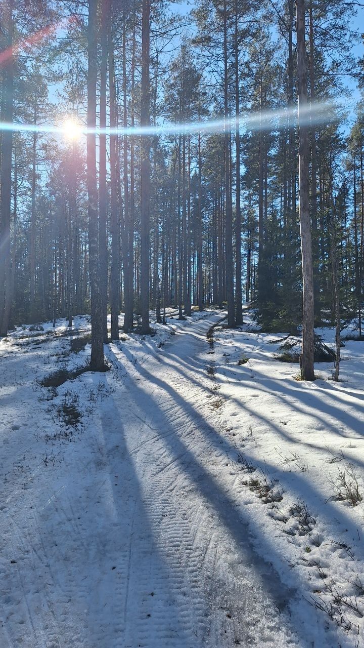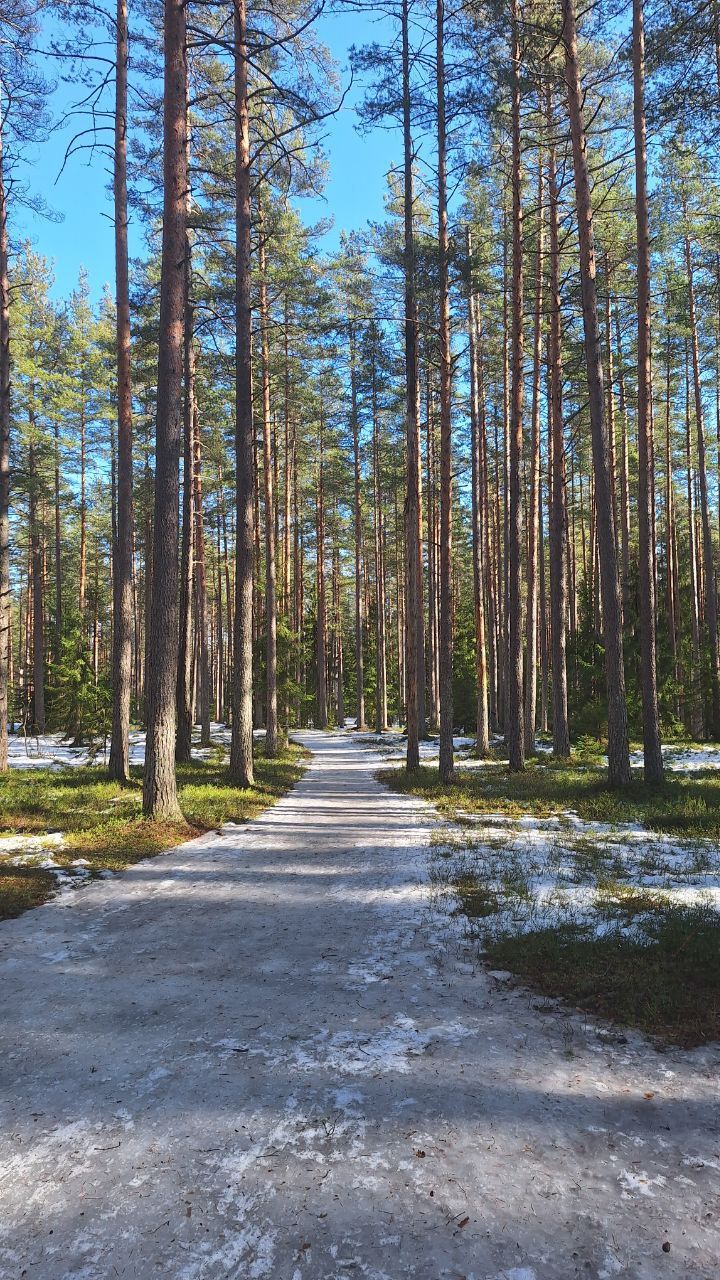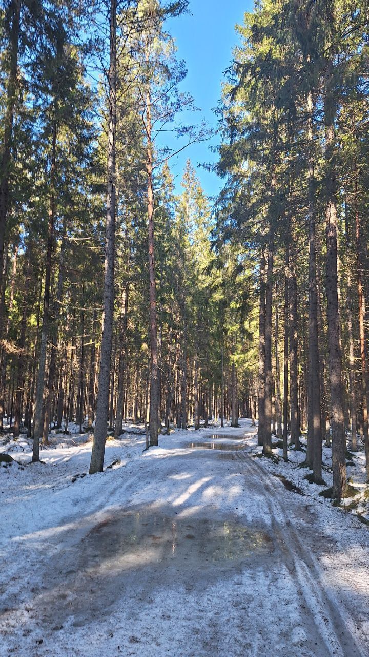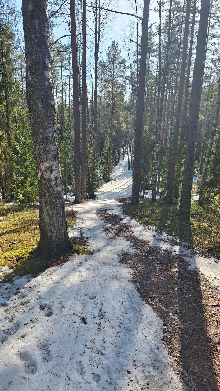 #прибой ещё жив)☃️ но уже появляются разрывы. Стартовый км в очень хорошем состоянии, есть пару мест с корешками, но пока не критично. 10-ка лёгкая - есть и мусор (самый худший участок - начало петли 2,8 км от просеки, его лучше объехать по встречке), и лед, и лужи, но есть очень хорошие участки, перед озером кусок совсем растаял (пока можно объехать мимо мусорных бачков), первый спуск после щебёнки вначале совсем растаял, следующие пока проезжаемы, но корни уже торчат почти на всех. На некоторых участках остались совсем узкие полоски снега😔 Но покататься пока можно😁 лес красивый🌲