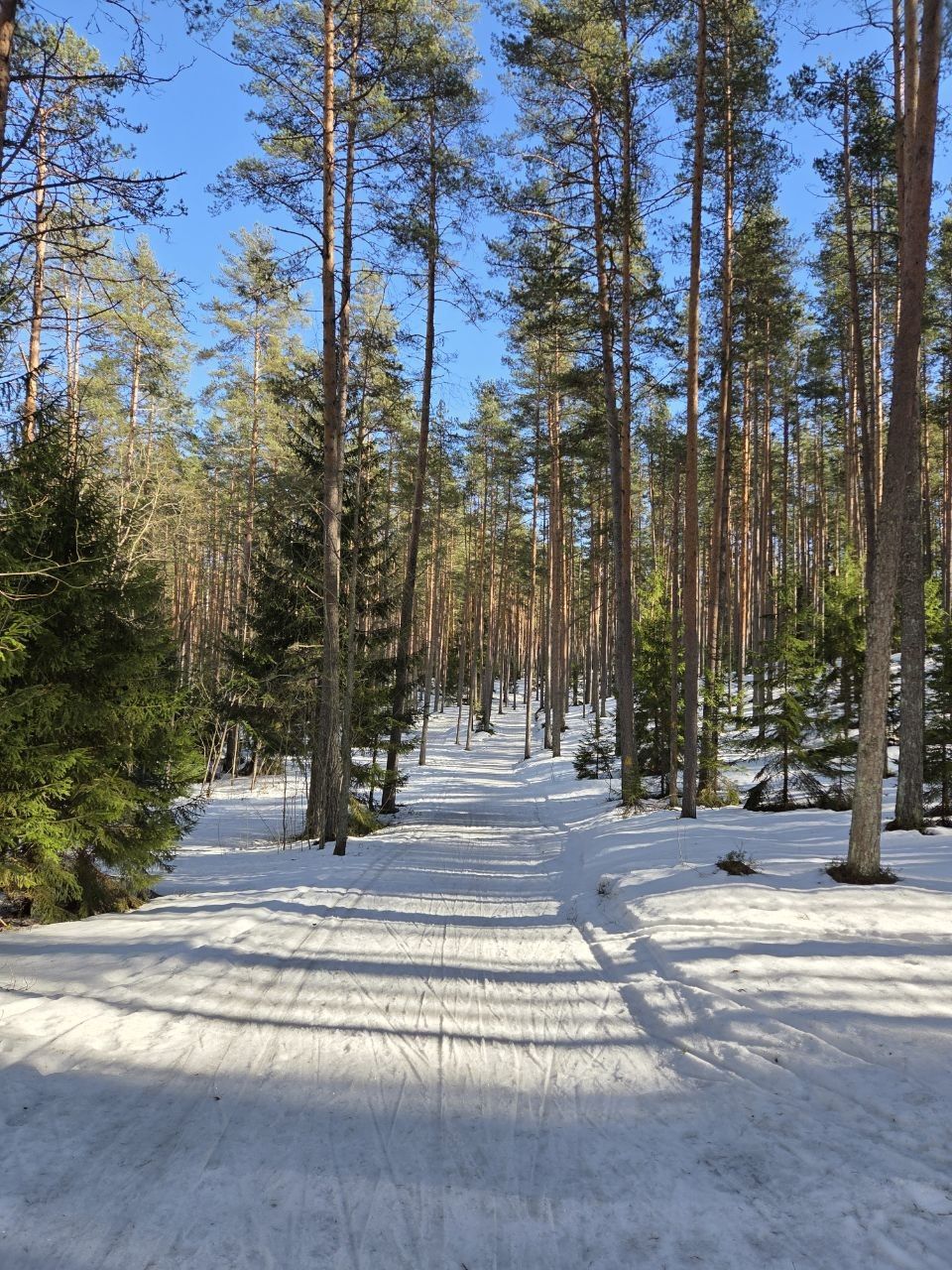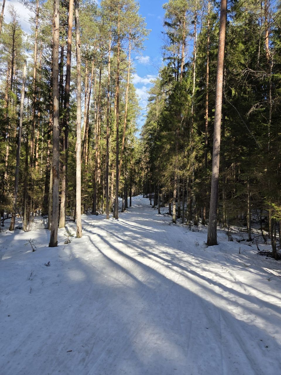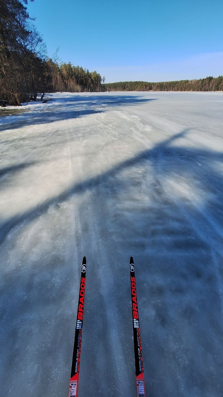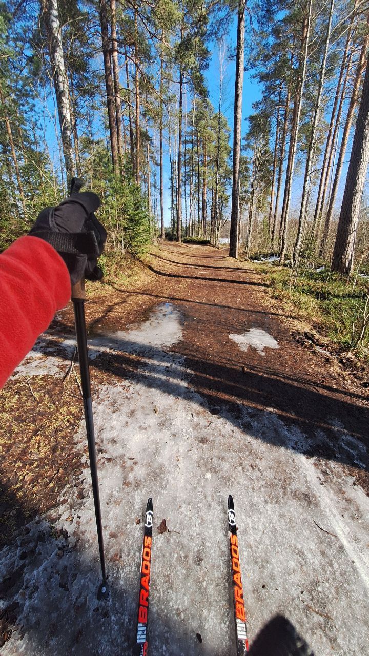 Весенний слеш. Частенько со снегом с веток и стволов отвалилась кора и прочий мусор. Покрытие от рыхлого до корки. Парафин 0-10 (желтый хоменколь) катит хорошо. На озере конька нет, немного классики.