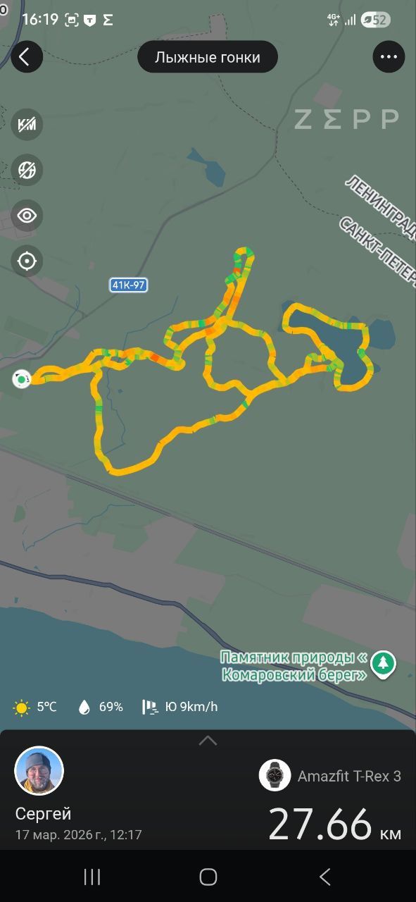 #Прибой в принципе все ожидаемо, оттепель дала о себе знать, по ровнине катится хорошо, лыжи летят, горки без корней и ям, но сложно управлять на такой скорости, на серенадах упал на каждой)) На 10ке попроще, но разбитые замерзжие лыжни дают о себе знать. Местами встречаются замерзжие лужи, отворот 300м разбит лесовозкой, но справедливости ради - там где она пересекает трассу заботливо прикопанно снегом.