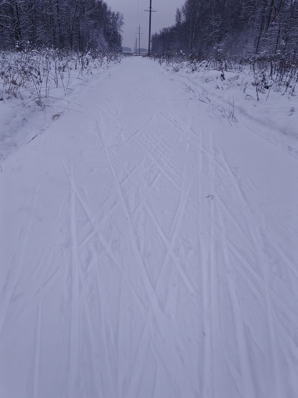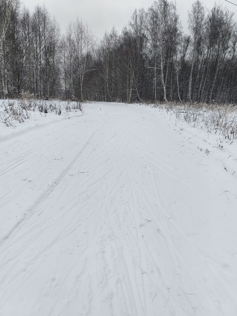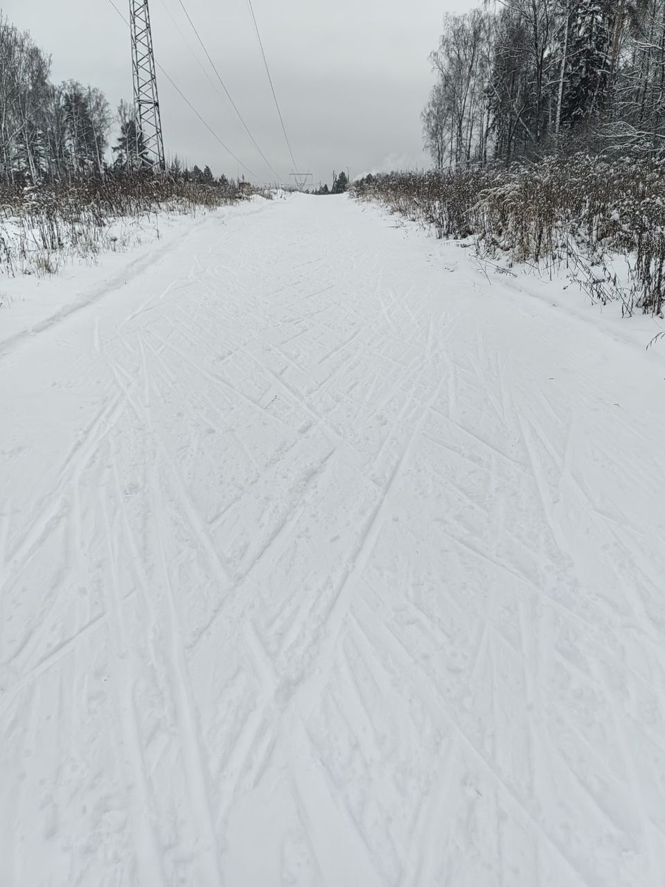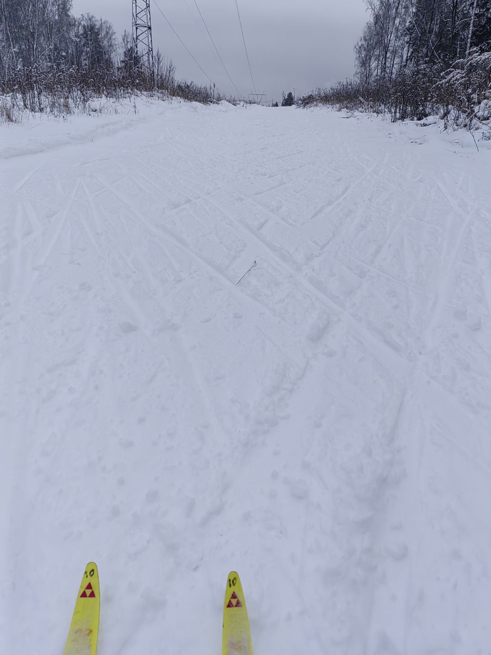 Снега пока мало. В лесной части ветки, шишки, грязно, ратрак дёрнул землю. На асфальтовых лыжах аккуратно можно