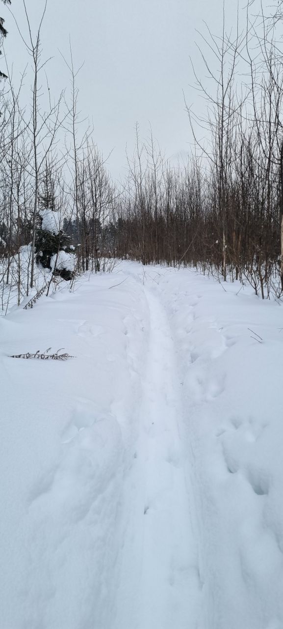 От пл 50 км до перекрестка лыжня популярная, люди ходят. Имеет место мордохлыст, кусты и орешник под тяжестью снега опустились низко, часто приходится наклоняться.
