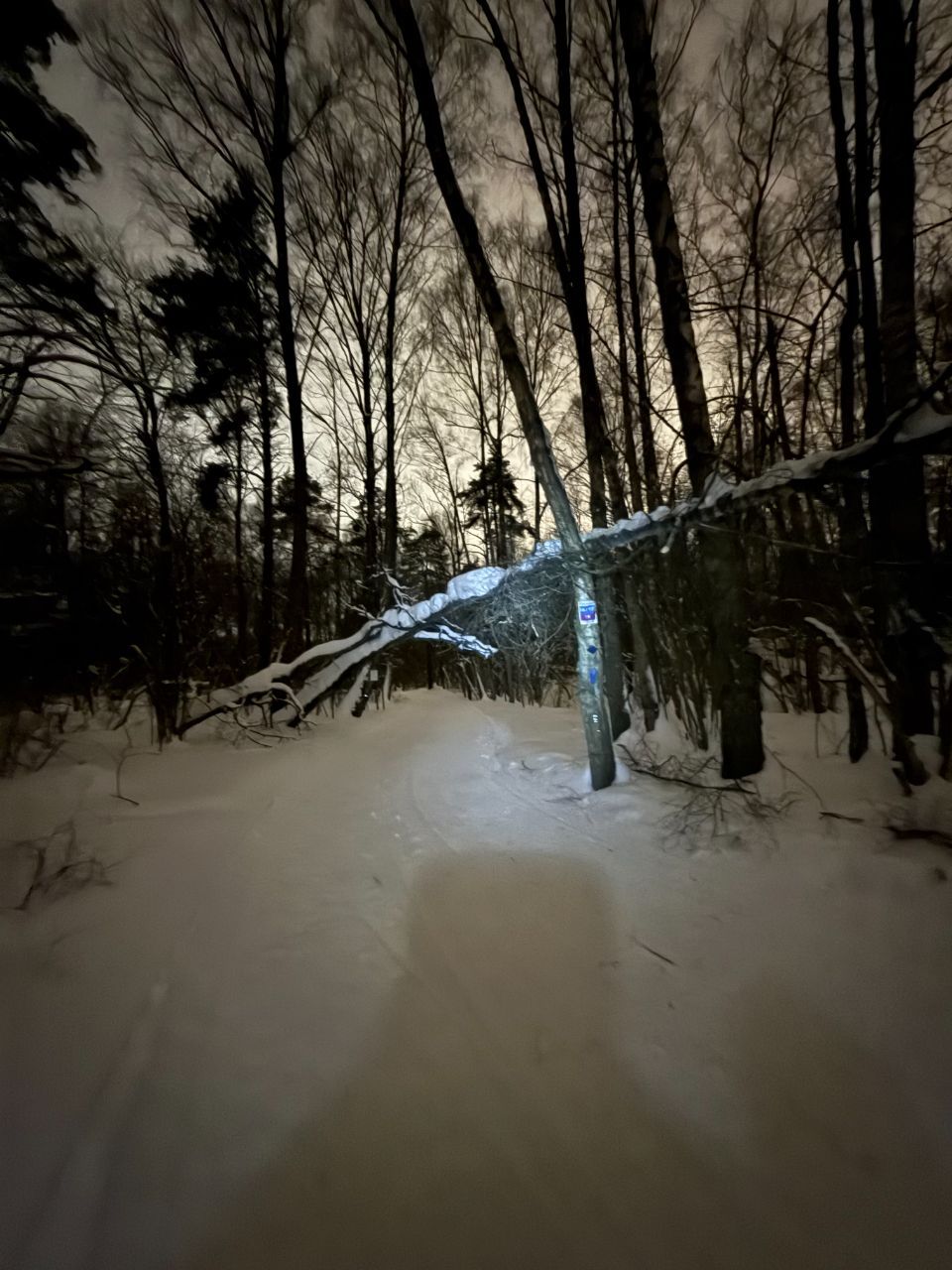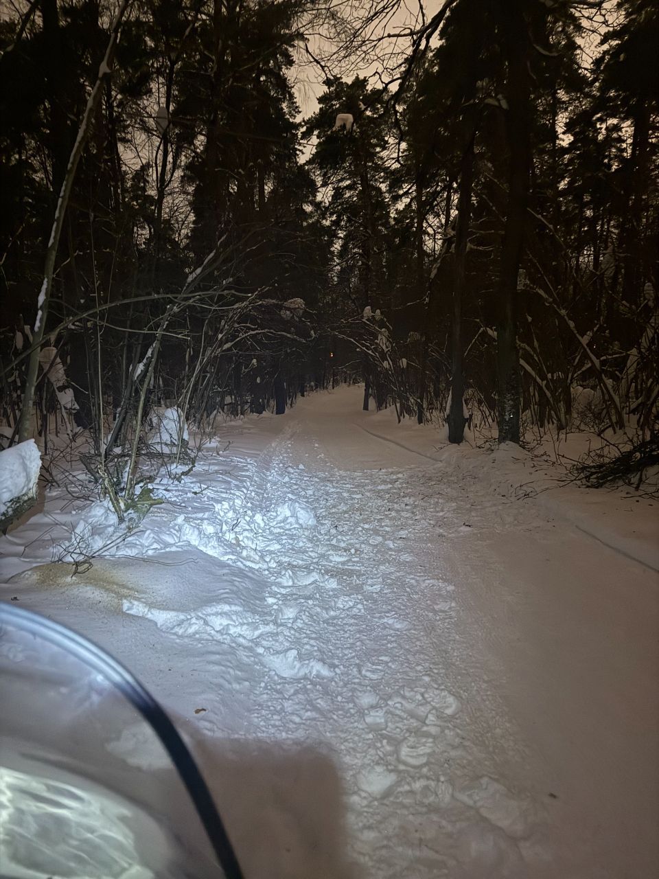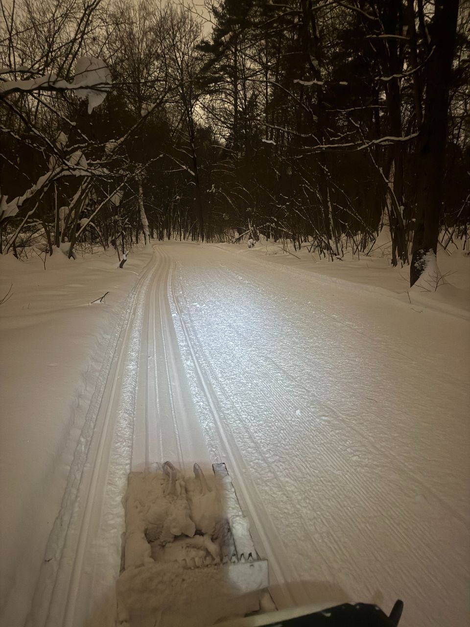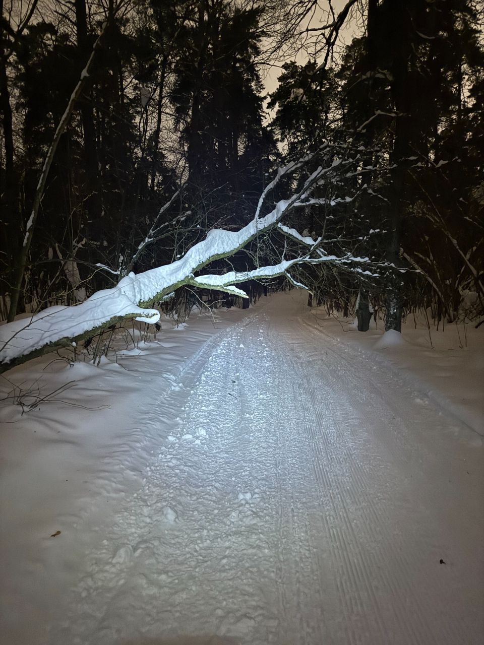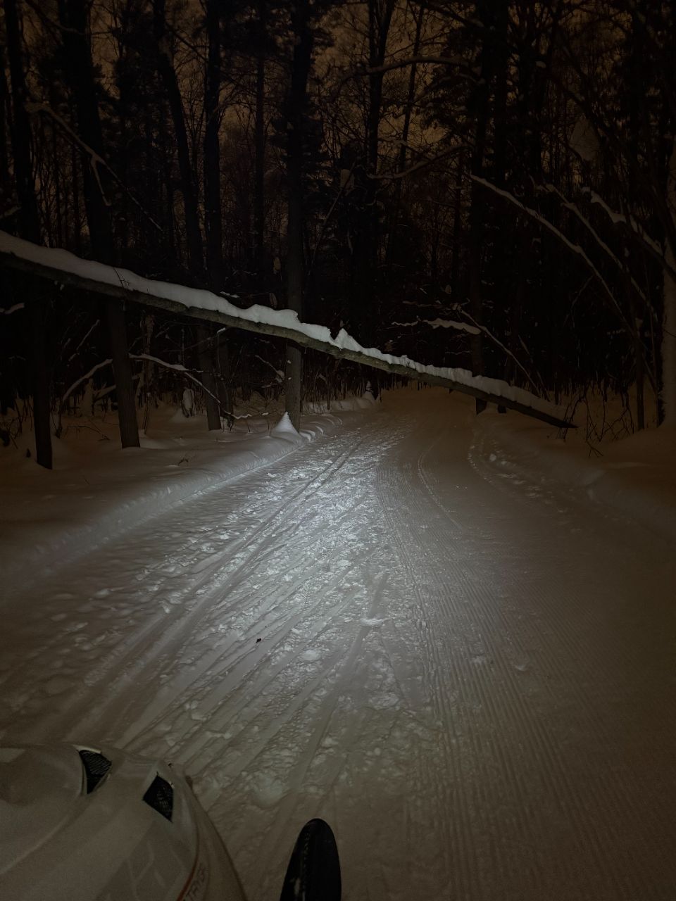 Был днём, трасса отлично подготовлена, немного засыпало снежной крупой. Лыжи летят. Спасибо за подготовку!