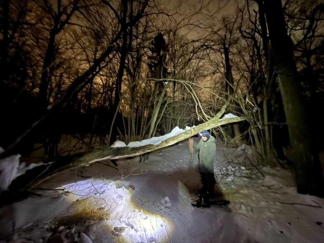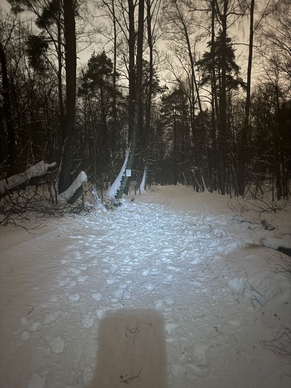 Закатали Болотную петлю + стартовую поляну + Толкинисткую и Сосисочную, плюс срезку Лысой горы под Гонку на выживание, которая пройдет 15 марта. Далее прошли с двумя Габошами всю 17-у несколько раз, пилили деревья, трасса схватилась и даже Габоша тяжело брала следы, срезали и закатали максимально на сколько это возможно, трасса грязновата, убирали крупные ветки + пилили опасные деревья, лыжню не нарезали, старую оставили (так как резак не брал эту корку ледяную).