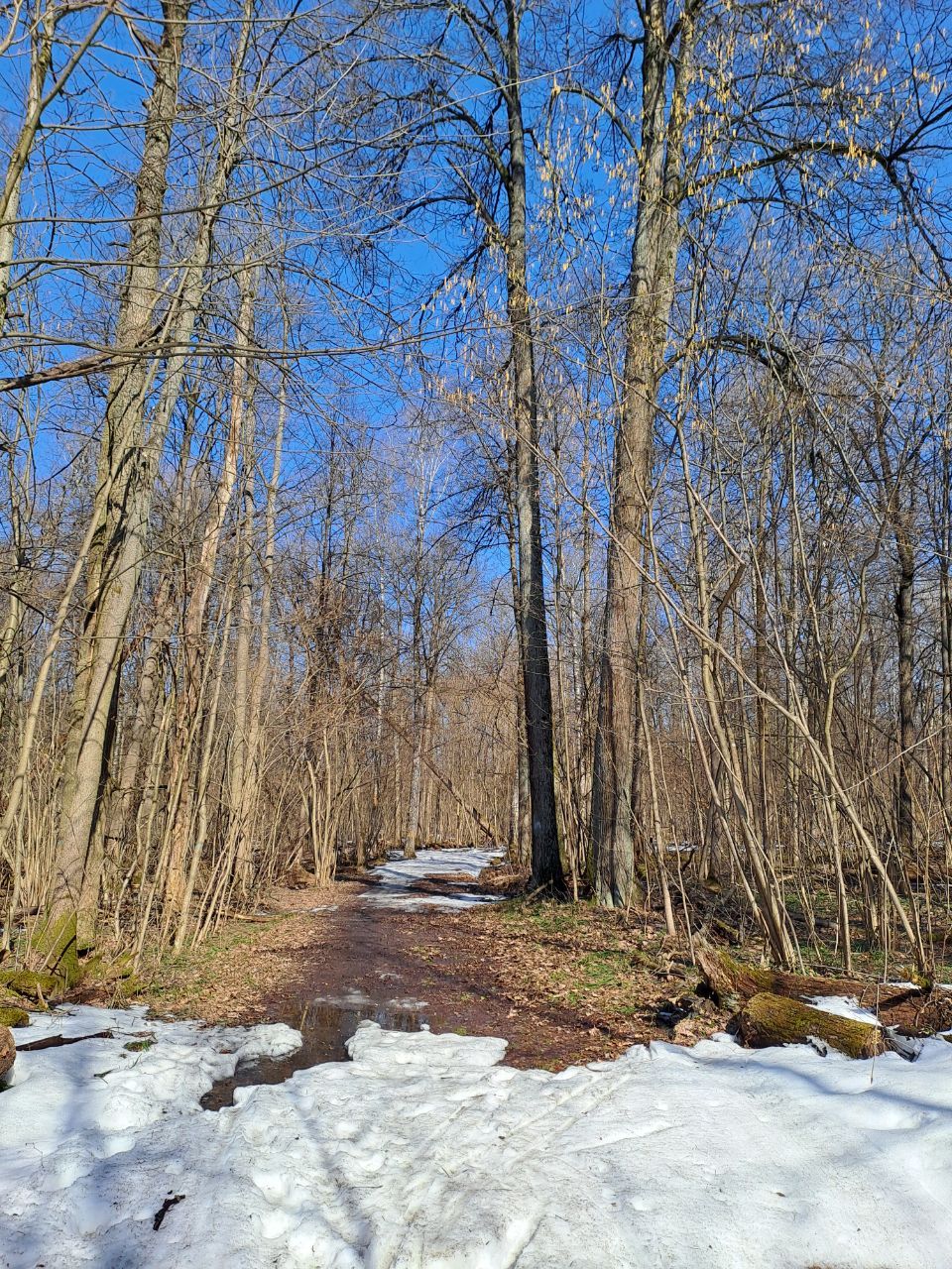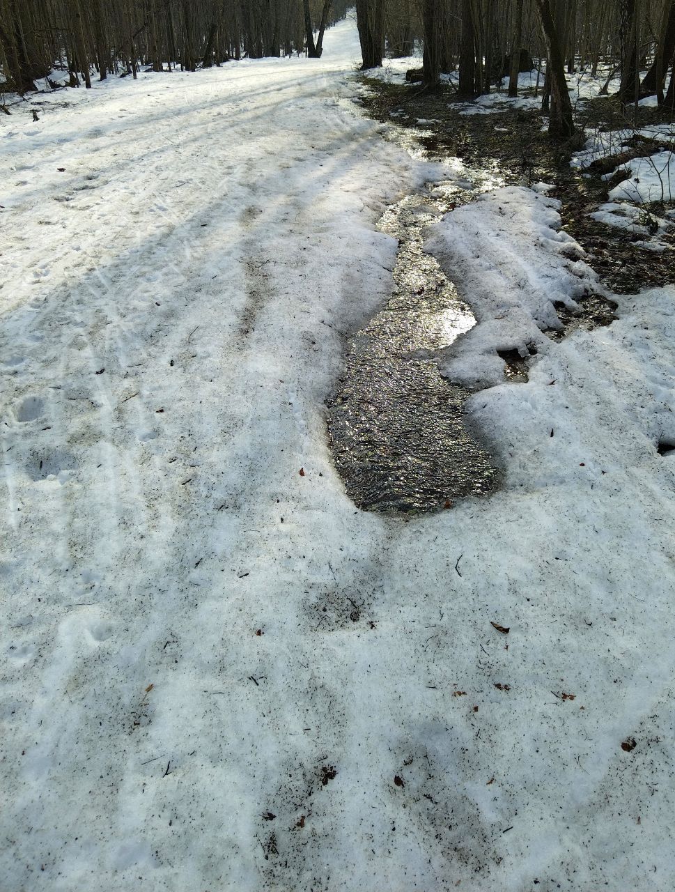 Снег есть, но рыхлый. Местами проваливаются палки и лыжи. Много ручейков и проталин.