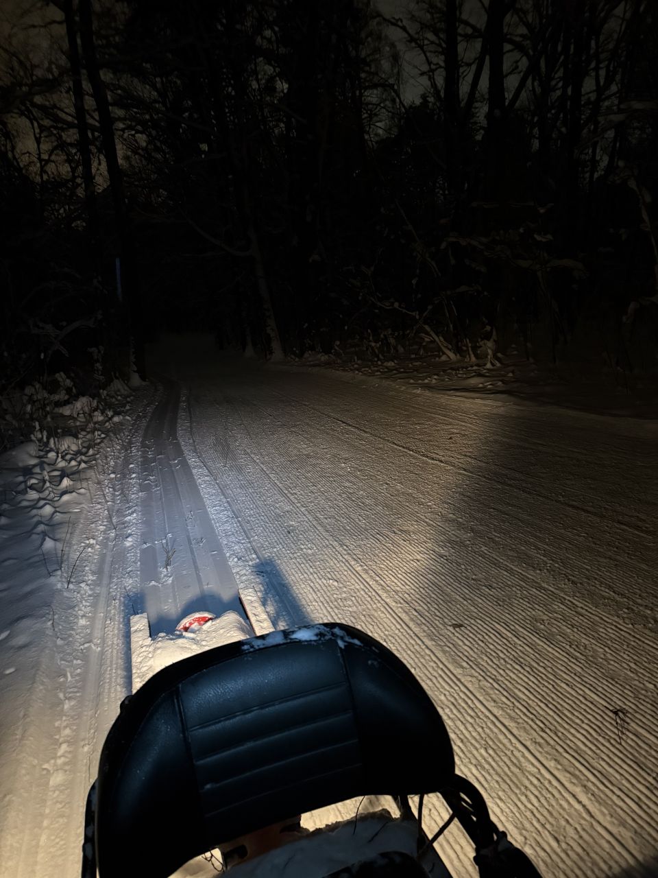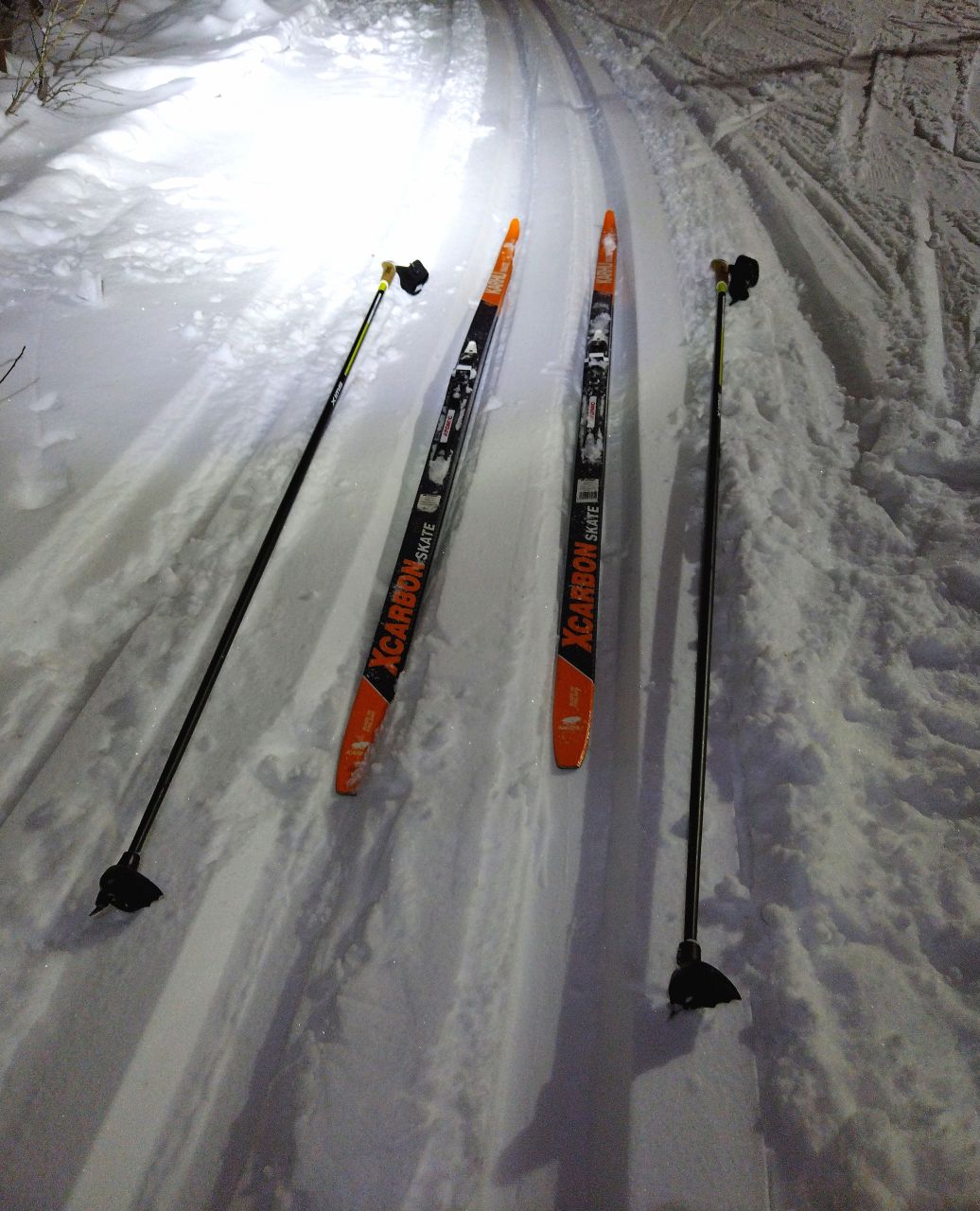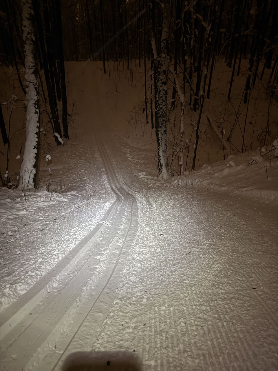 Трасса подготовлена на "отлично" - ровно, широко, практически без мусоря и следов пешеходов. Даже легкий снегопад не смог помешать насладиться гонкой по ночному зимнему лесу. Классика нарезана и она тоже на все 5