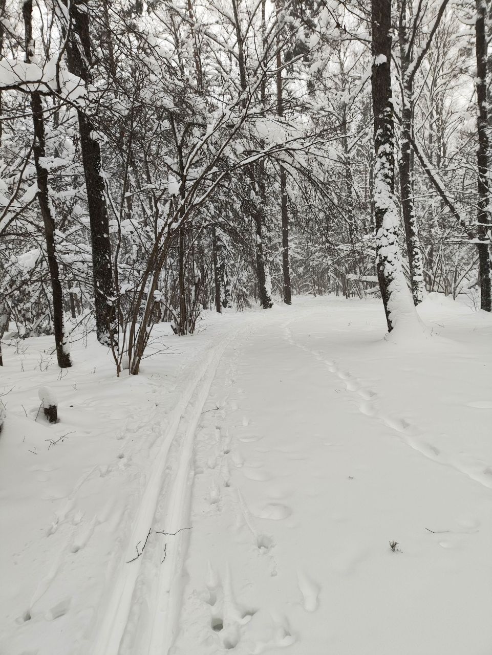 Петли на 15-ке и 17-ке рыхловатые, прокатывали прицепом до небольшого снега, потом только ногами натаптывали. Местами жёлоб на подъём. Иногда низко висят ветки, надо смотреть в оба, особенно на спусках, чтобы остаться с этими самыми оба. Но неравнодушные, кто уже в курсе, пилят, спасибо им. Фото с равнинных участков дальних петель. На 10-ке и мельче всё укатано. Много отдыхающих на прокатных, что ли. Никогда не видела такого наплыва пальтошных, шкрябают шеренгами. И при этом не застала пчеловода с мёдом.