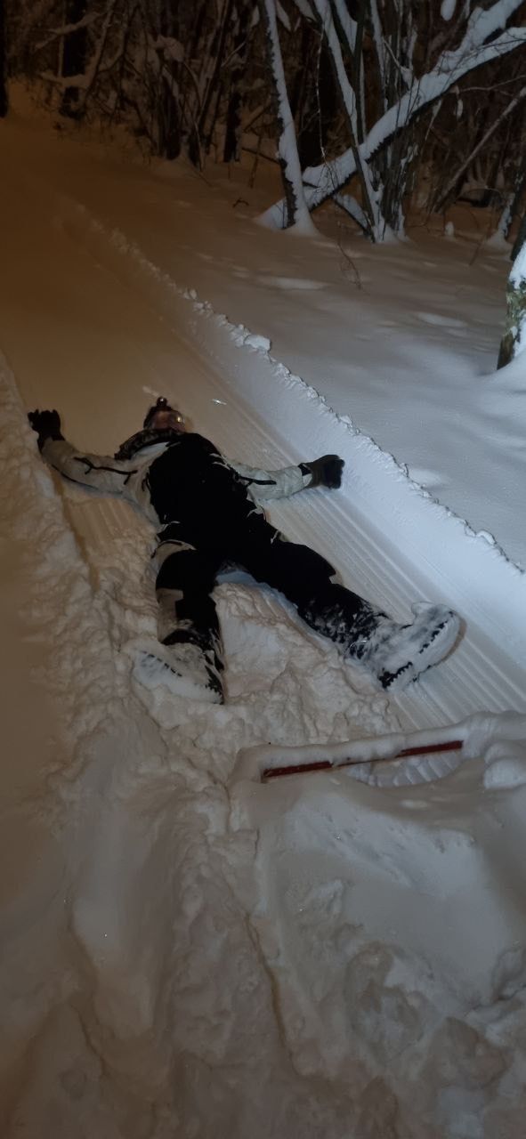 Большое спасибо Диме за дневную помощь. Он на лыжах с мачете прошел весь круг 17 км, рубил критические места, стряхивал ветки. Отдельное спасибо Феде Николаеву - он колесами тоже закатал до нас весь круг, это сильно облегчило работу.