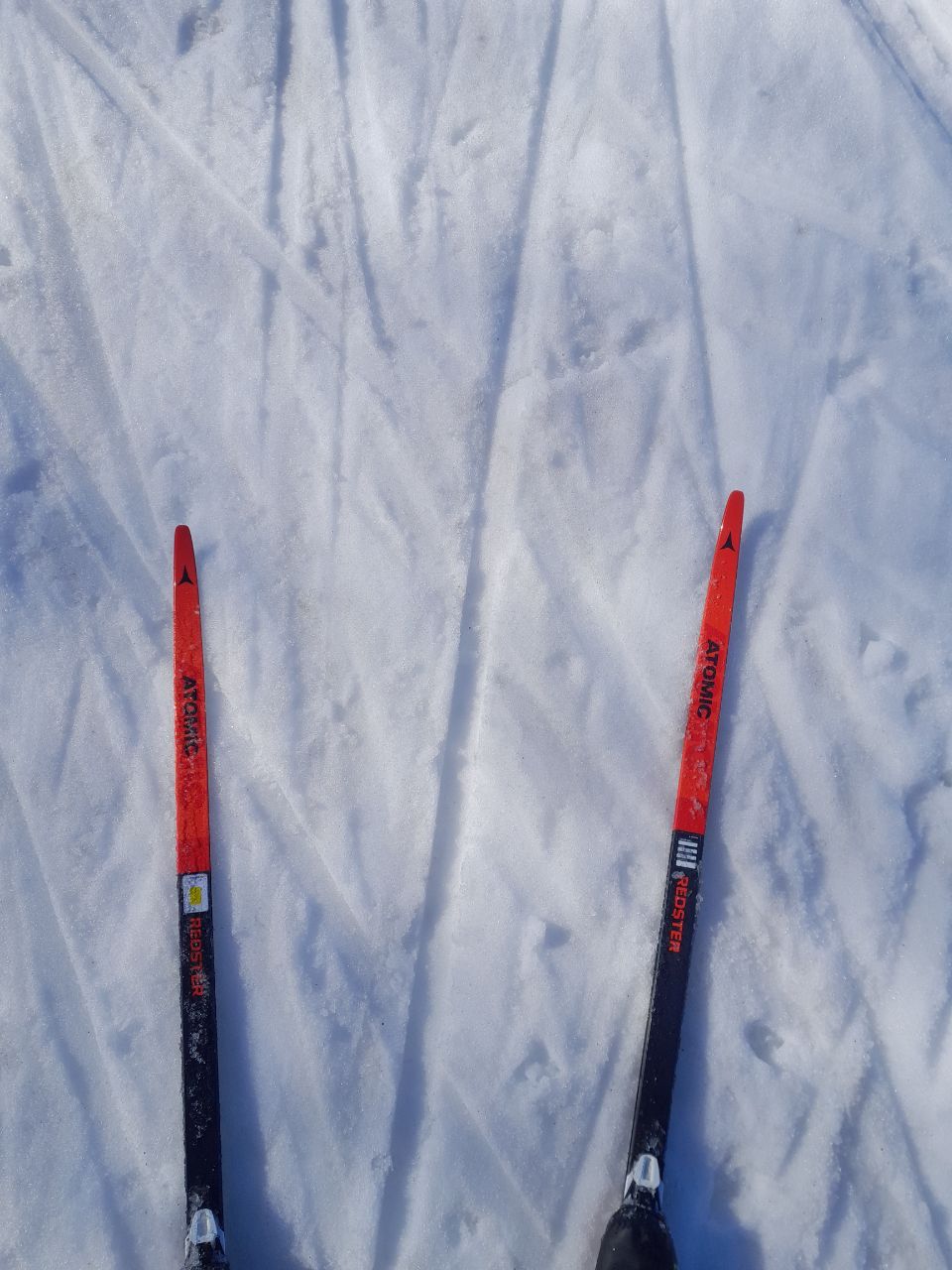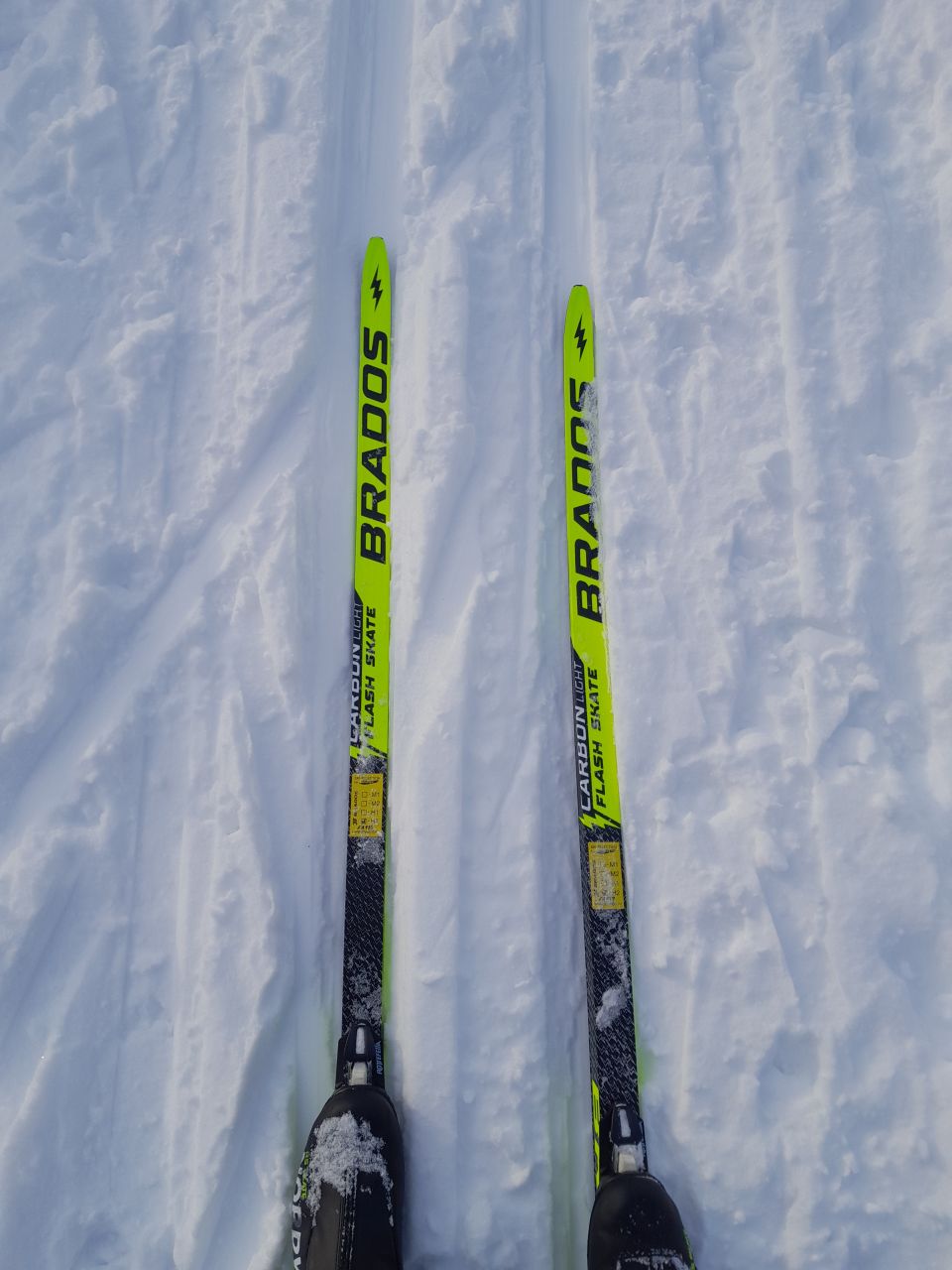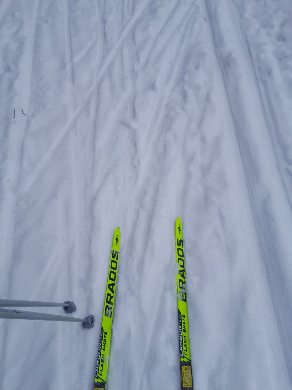 Хорошо покатался коньком, хоть трасса и очень жесткая из-за снегольда, после перехода с оттепели на мороз. Всё покрыто снеголедовой хрустящей коркой. После обеда стало получше, люди потихоньку укатали. Классика по всей трассе хорошая.