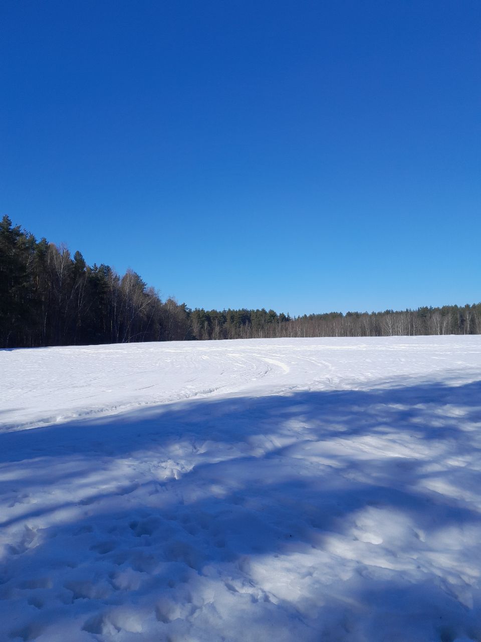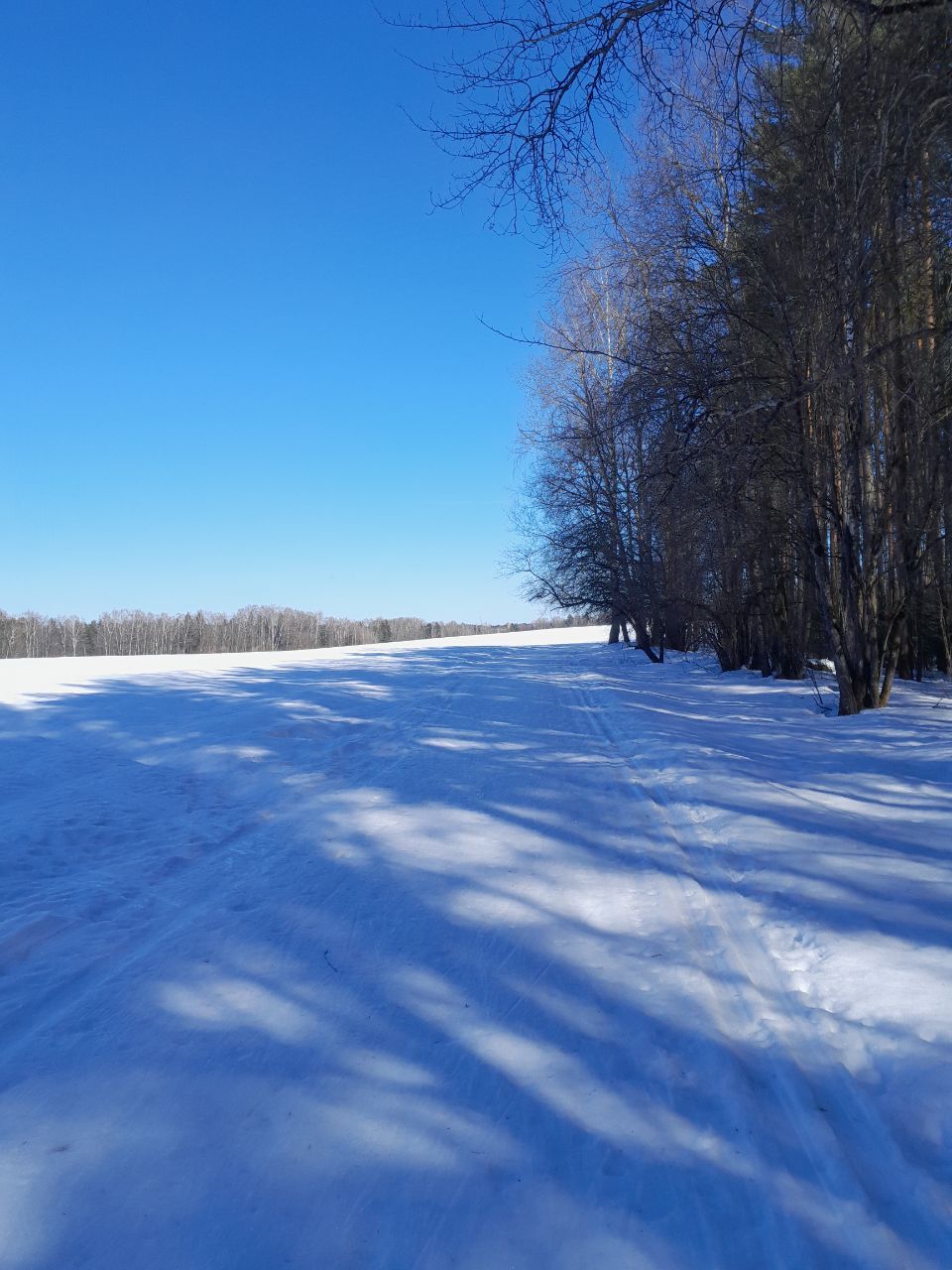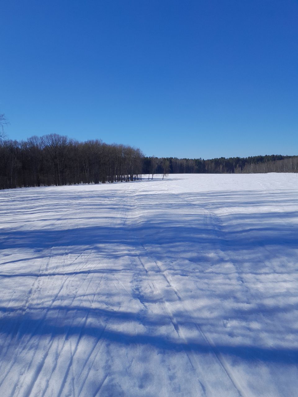 Катался днём до обеда. Солнышко пригревает, красотень. Трасса разная где-то жестко, где-то мягко, и ровно и горбы, но в целом хорошо. Что интересно поле-целина держит, снег не проваливается, можно прям по нему катить, есть конечно места порыхлее, но мой центнер не проваливается.