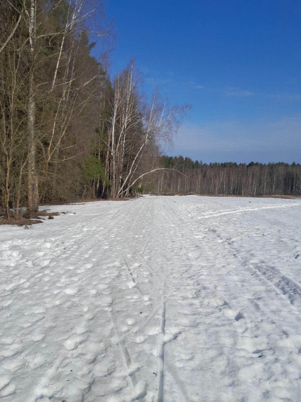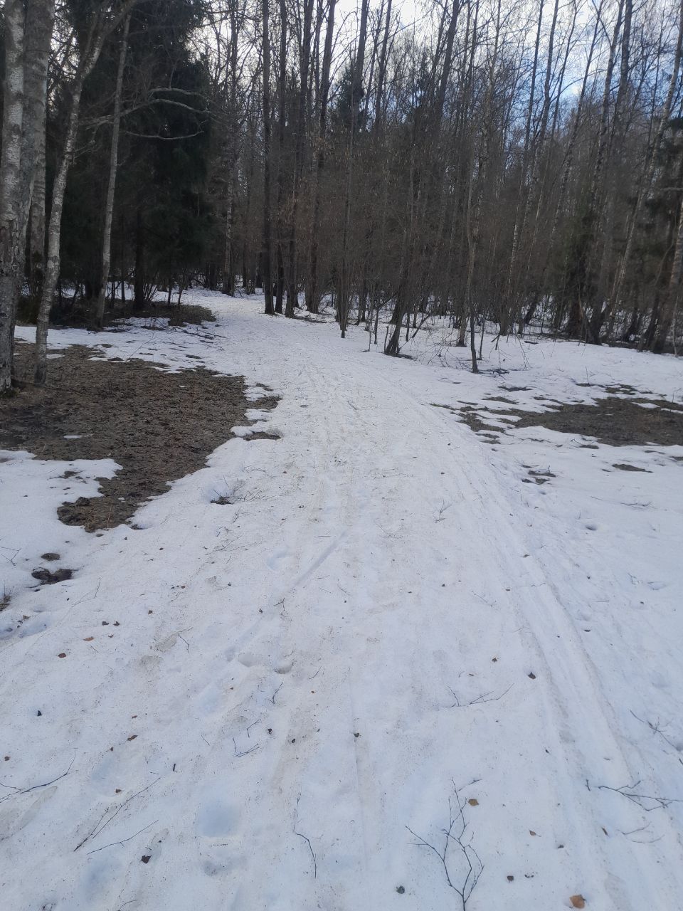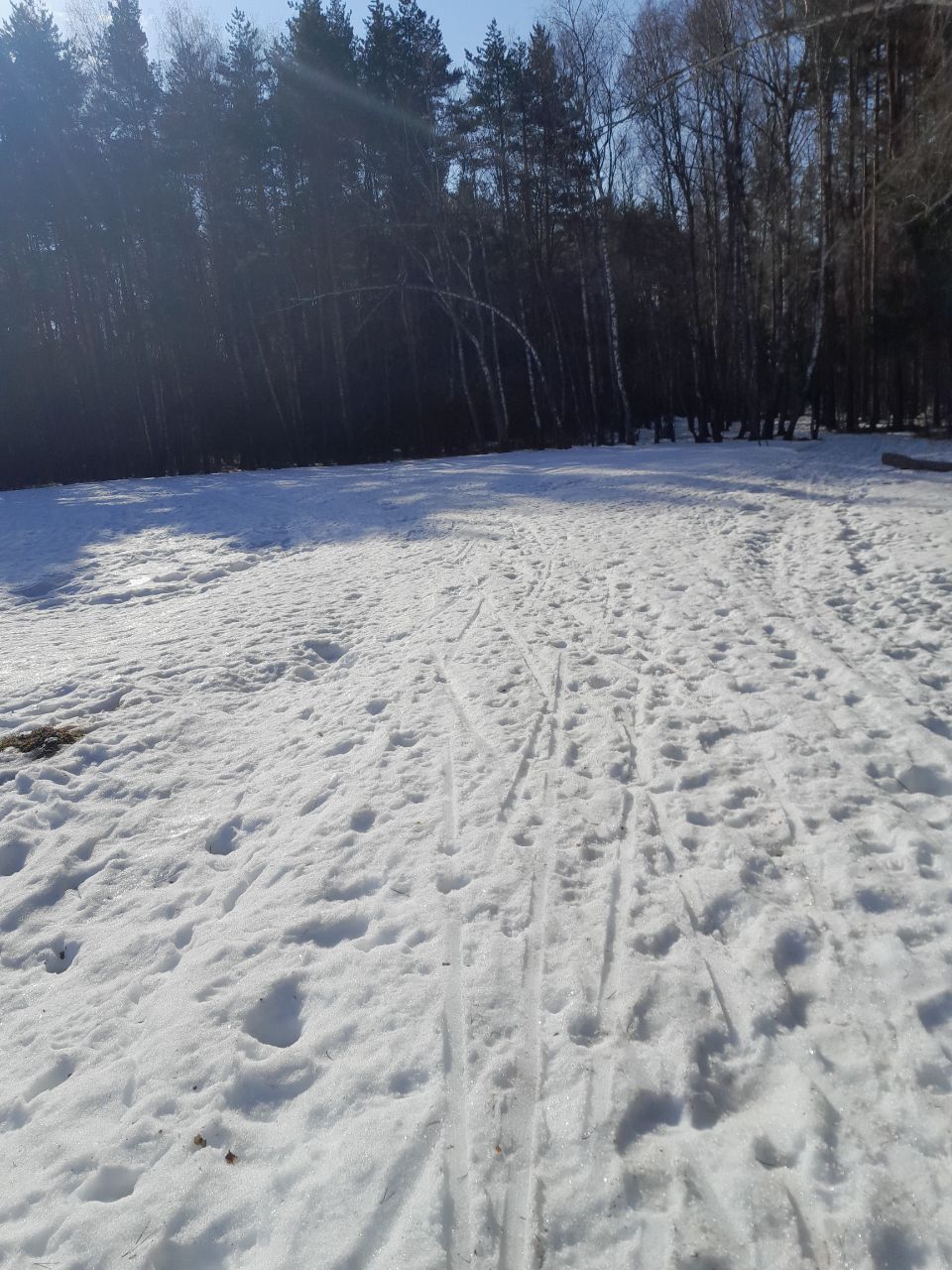 Хорошо покатался в Снегирях. Катался примерно с 12 до 14. Трасса для нынешней погоды в целом живая, но участками разная. На фото самые хорошие участки. Лесные хвойные участки совсем плохи, мягко, мусорно и лыжи не едут по хвое. Южная часть трассы со стороны ЖК и ниже пока проходимы, но быстро тает и вся протоптана, скоро протает участок у силосной ямы и есть разрыв и ручей в нижней части на опушке. Хорошо можно кататься вдоль всего северного поля, там местами даже и не думает таить. Есть участки прям ледовые. Поле, прокатыннае учаски примерно 50 на 50, гдето держат гдето нет, всё зависит от времени и солнечный участок или нет. Начинал кататься ещё держало более менее, потом всё хуже и хуже. Утром думаю и по полю-целине можно будет, сегодня в 12 заехал, проваливался. Думаю ещё покатаемся.