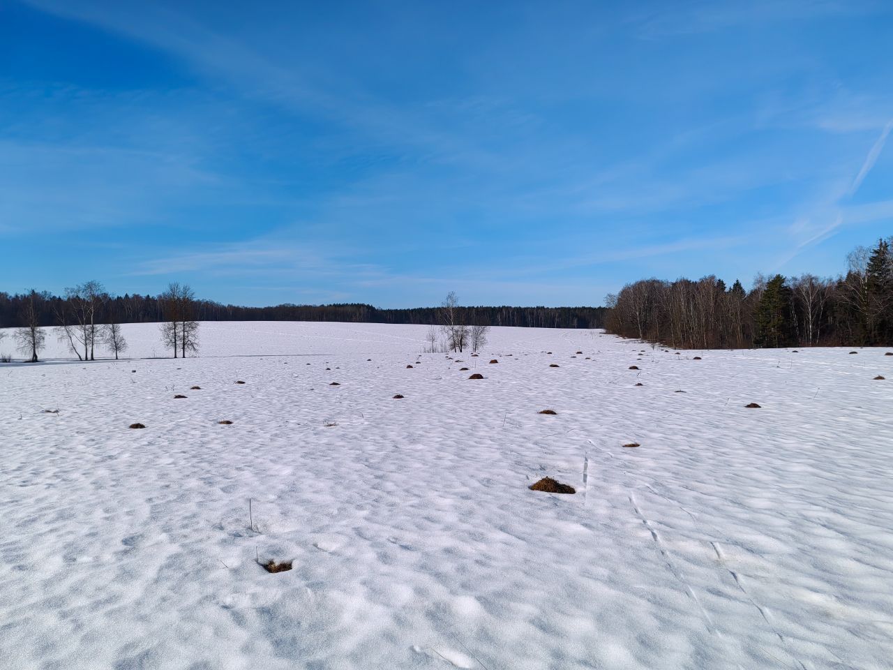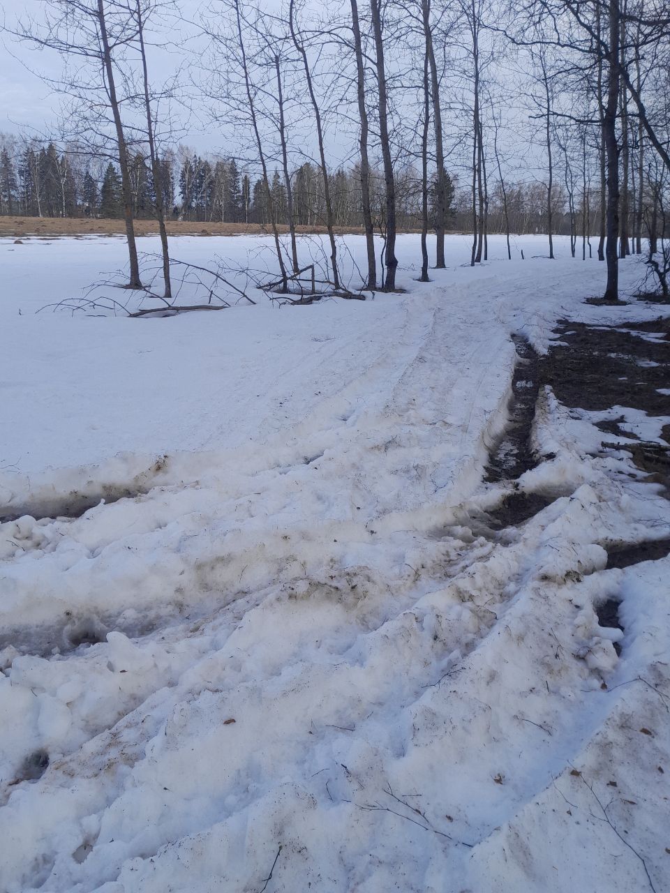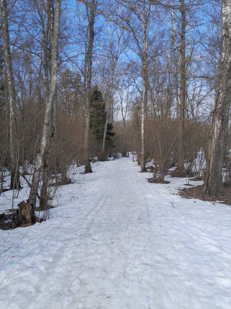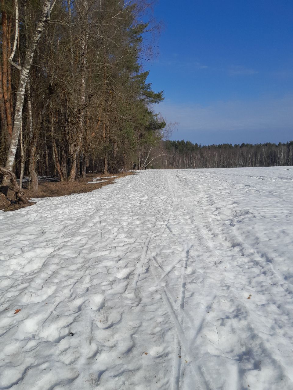 Хорошо покатался в Снегирях. Катался примерно с 12 до 14. Трасса для нынешней погоды в целом живая, но участками разная. На фото самые хорошие участки. Лесные хвойные участки совсем плохи, мягко, мусорно и лыжи не едут по хвое. Южная часть трассы со стороны ЖК и ниже пока проходимы, но быстро тает и вся протоптана, скоро протает участок у силосной ямы и есть разрыв и ручей в нижней части на опушке. Хорошо можно кататься вдоль всего северного поля, там местами даже и не думает таить. Есть участки прям ледовые. Поле, прокатыннае учаски примерно 50 на 50, гдето держат гдето нет, всё зависит от времени и солнечный участок или нет. Начинал кататься ещё держало более менее, потом всё хуже и хуже. Утром думаю и по полю-целине можно будет, сегодня в 12 заехал, проваливался. Думаю ещё покатаемся.