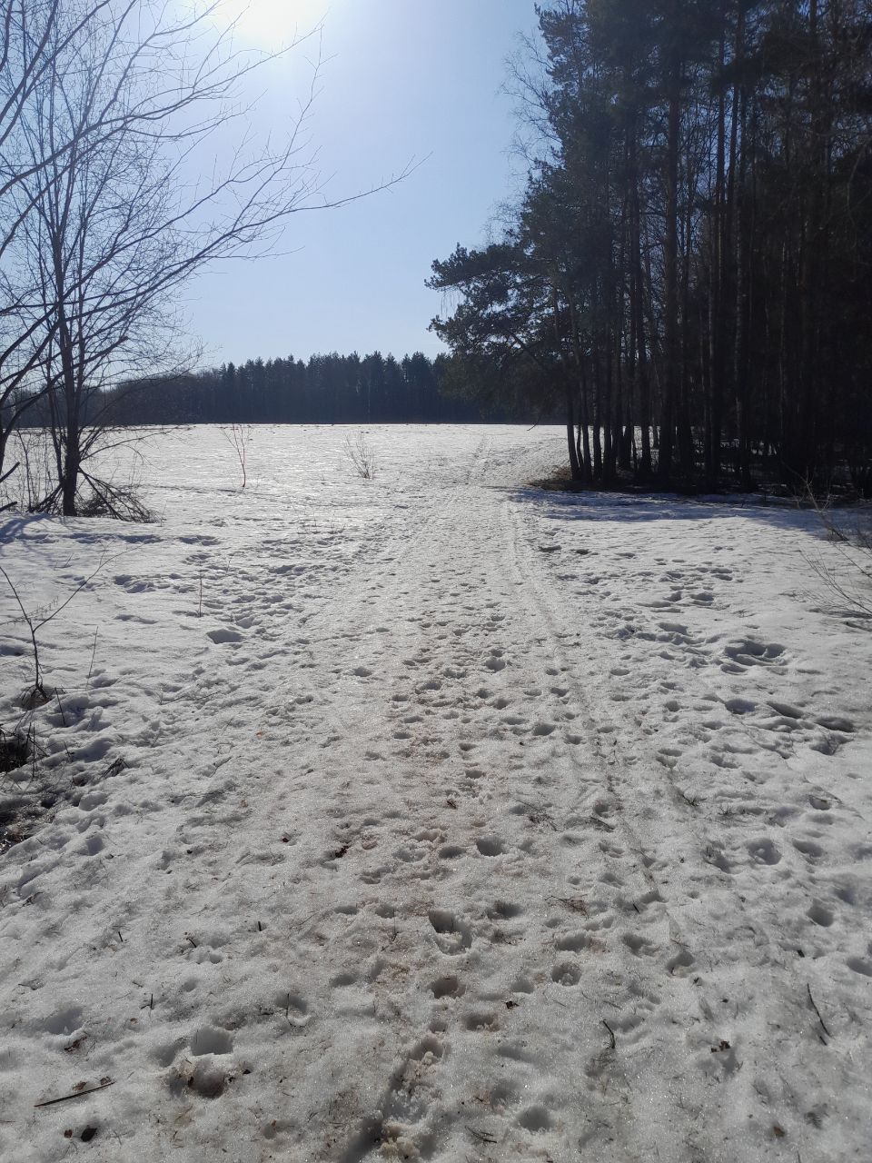 На поле есть следы снегохода, в некоторых местах по ним проглядывает лыжня. Вдоль леса сделана, засыпана и утоптана лыжниками и пешеходами широкая дорога. И снова засыпана. Ехать можно, гнать — нет.