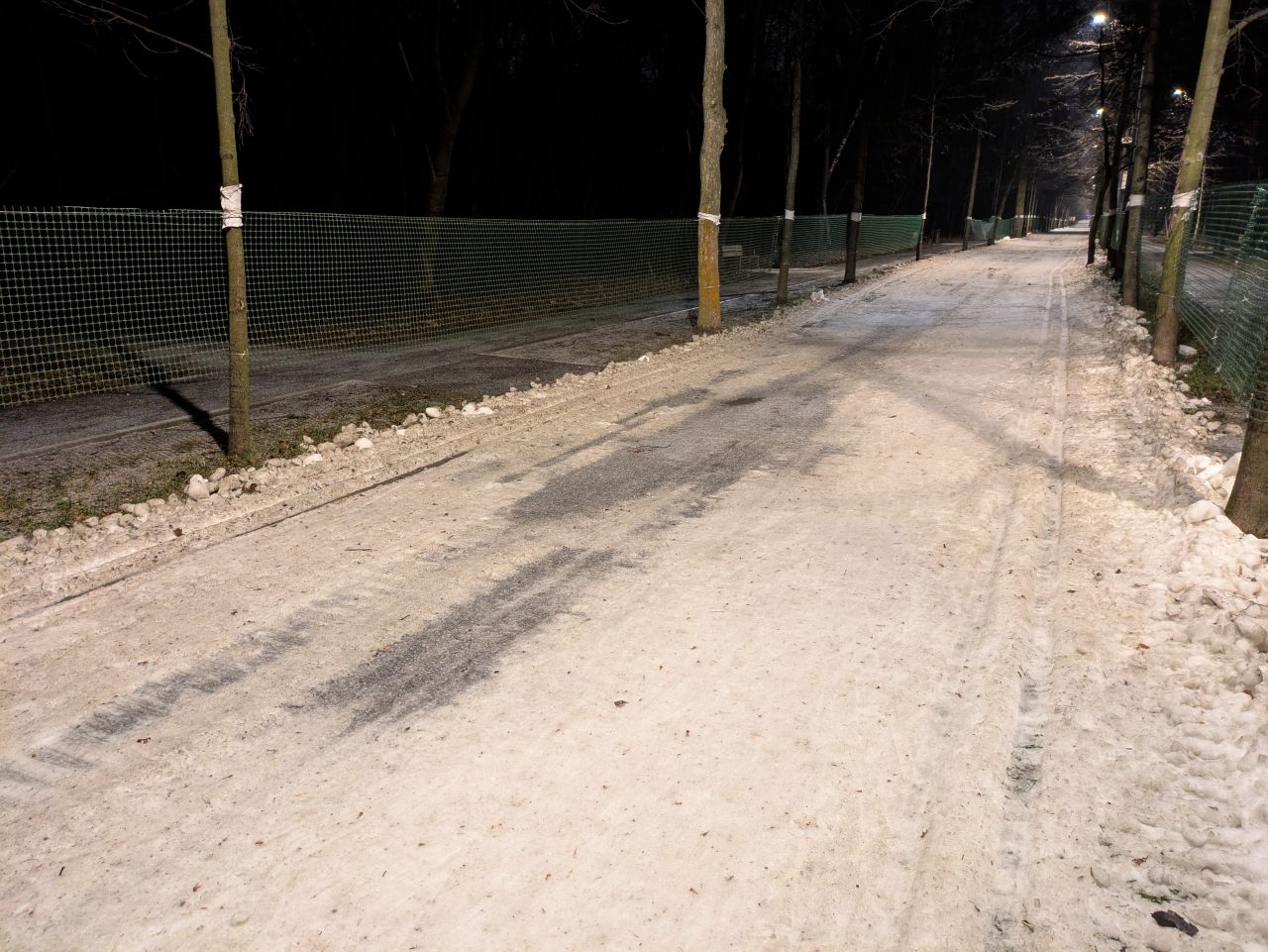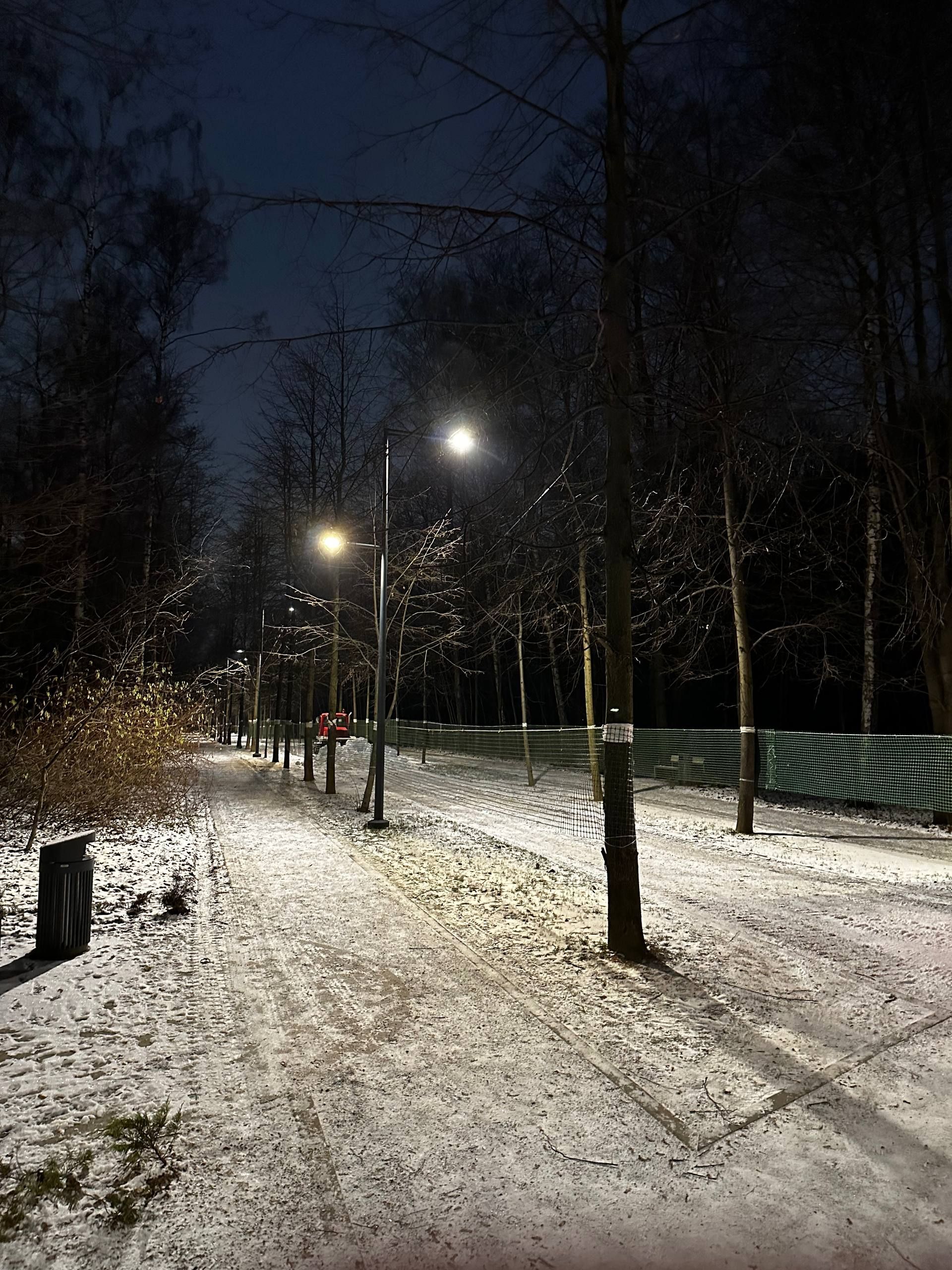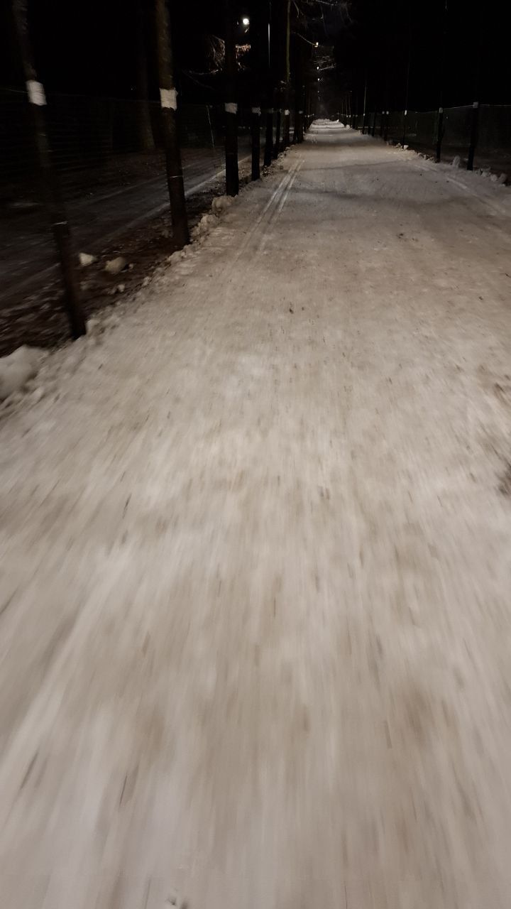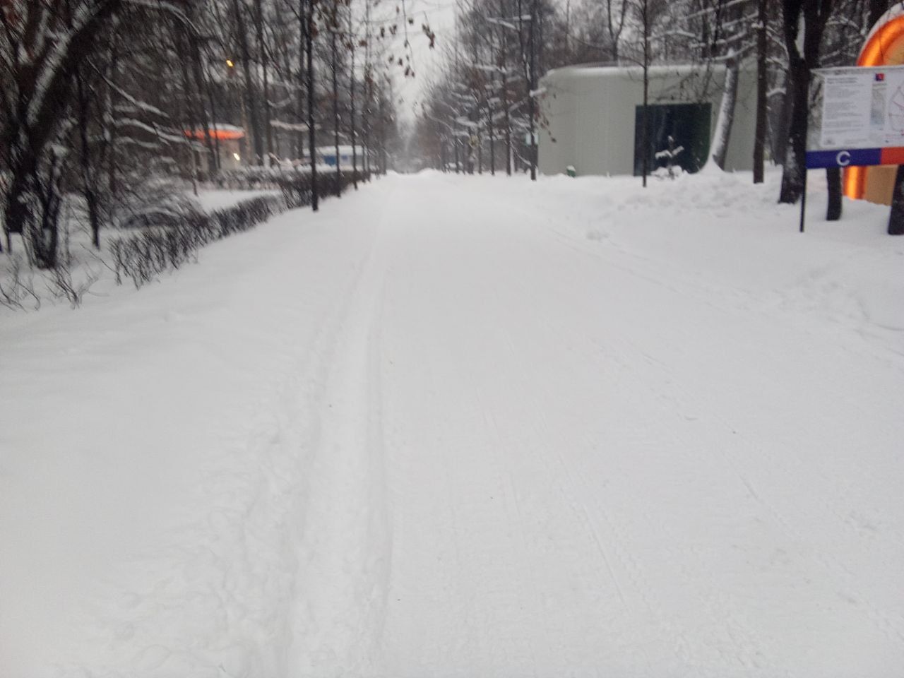 Утро 16 декабря. Трассу усиленно готовят, возят снег, стараются. Уже сделано метров 200 - можно катать на асфальтовых/тренировочных, т.к. местами ветки и листья. Ещё оставили незакрытыми много пересечений с пешеходными дорожками, что плохо, будут затаптывать