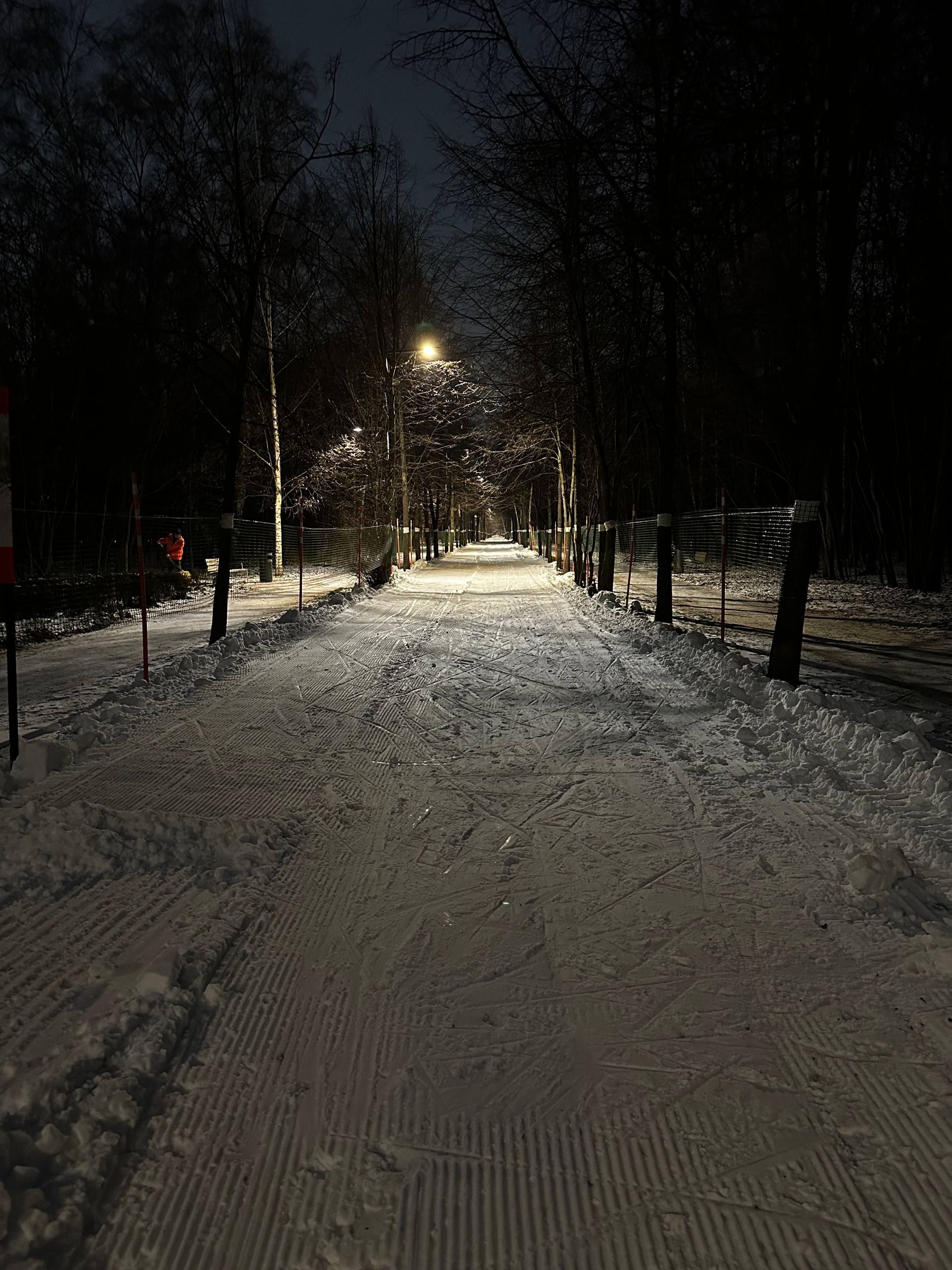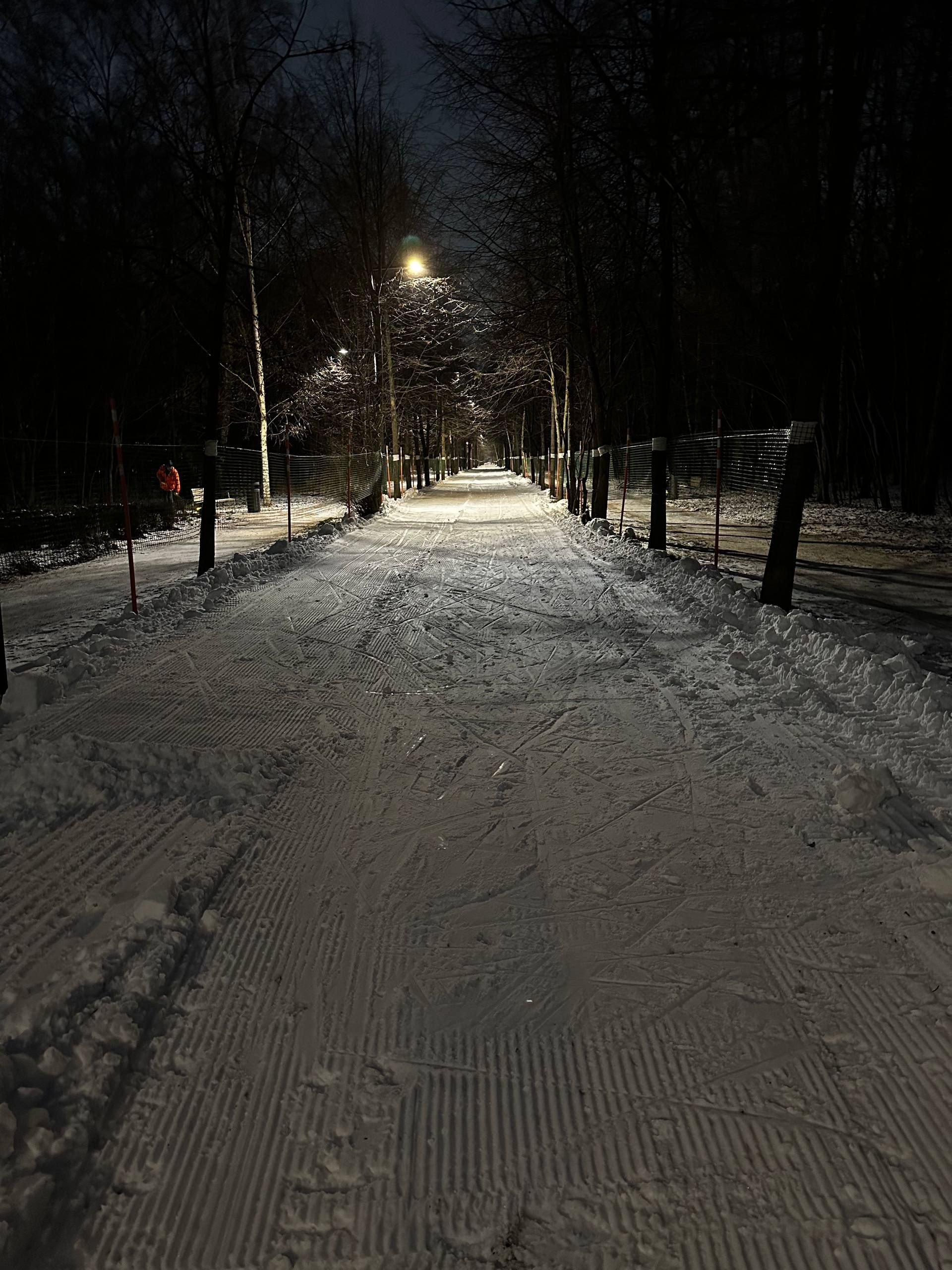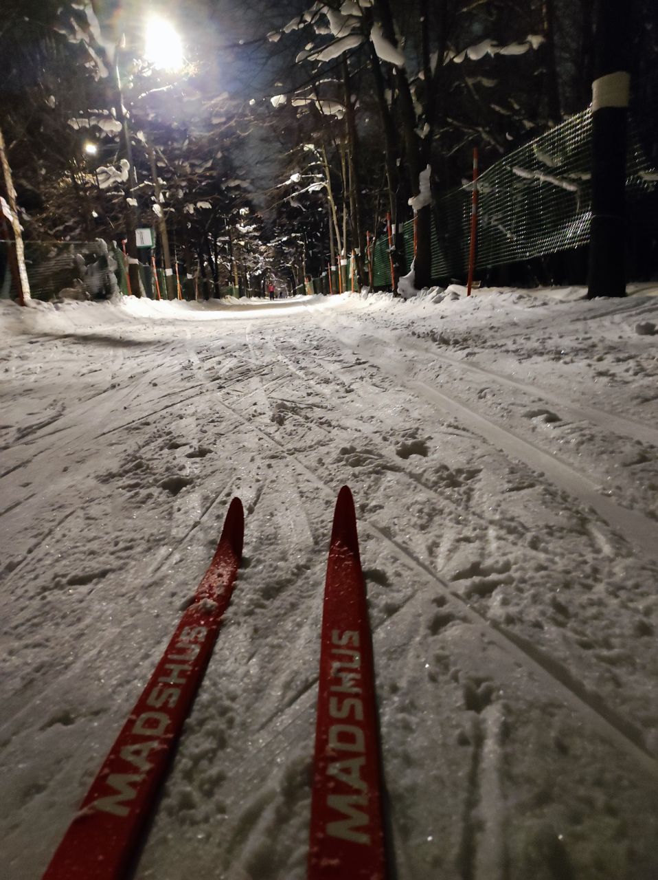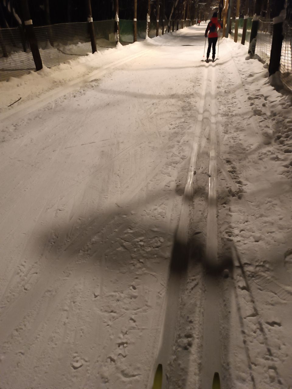 Сегодня вечером было очень неплохо. Трассу явно готовили после выпавшего воскресного снега. Местами был вельвет. Скольжение было хорошее