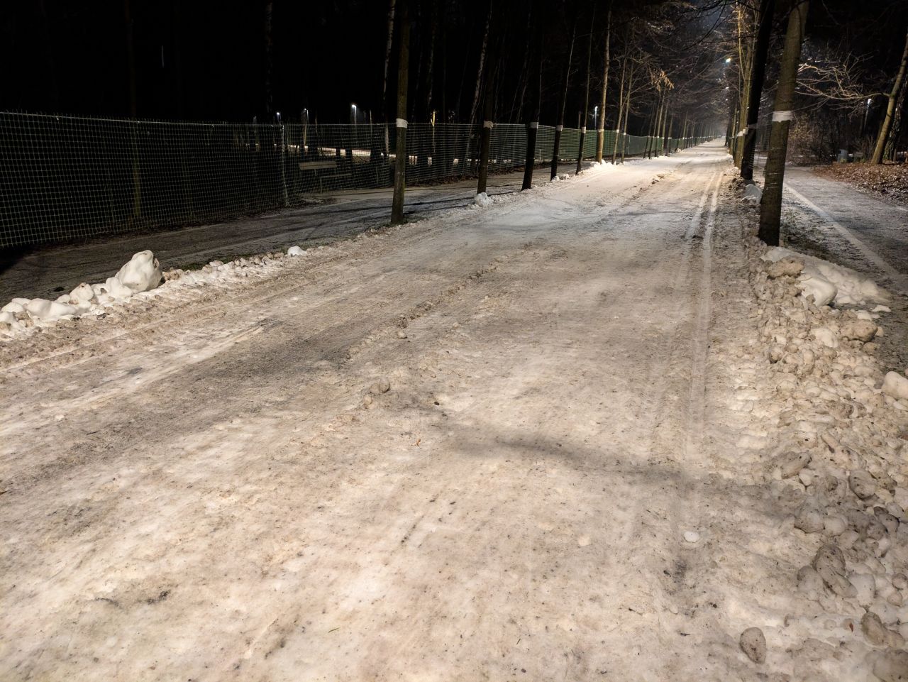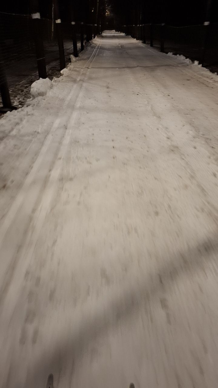 В 9-м часу был ратрак. Прикатал выпавший снег, но бугры как были, так и остались. Еще и ям добавилось. По мягкой лыжне еще более-менее коньком можно. Но если забетонируется, то будет тяжко.