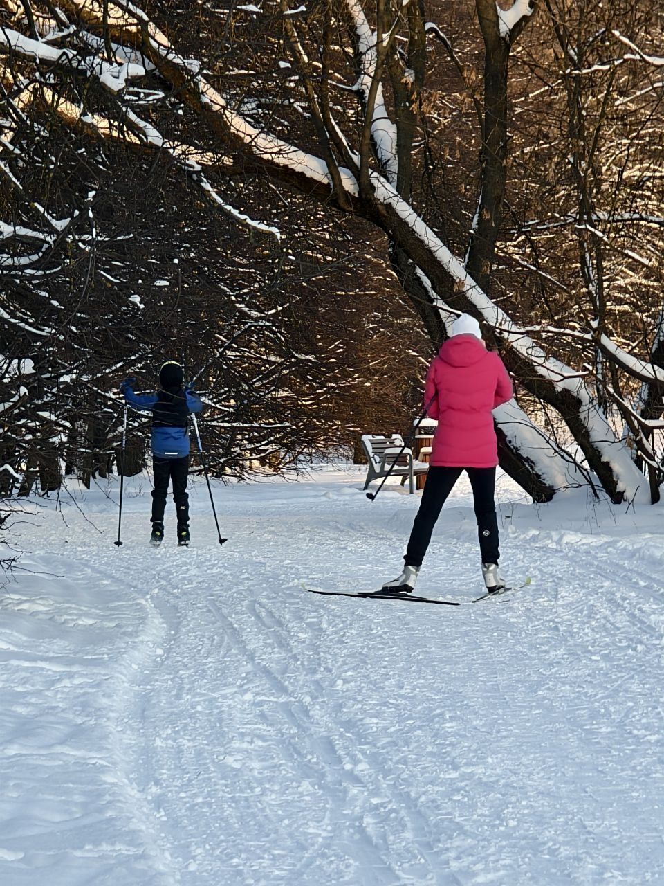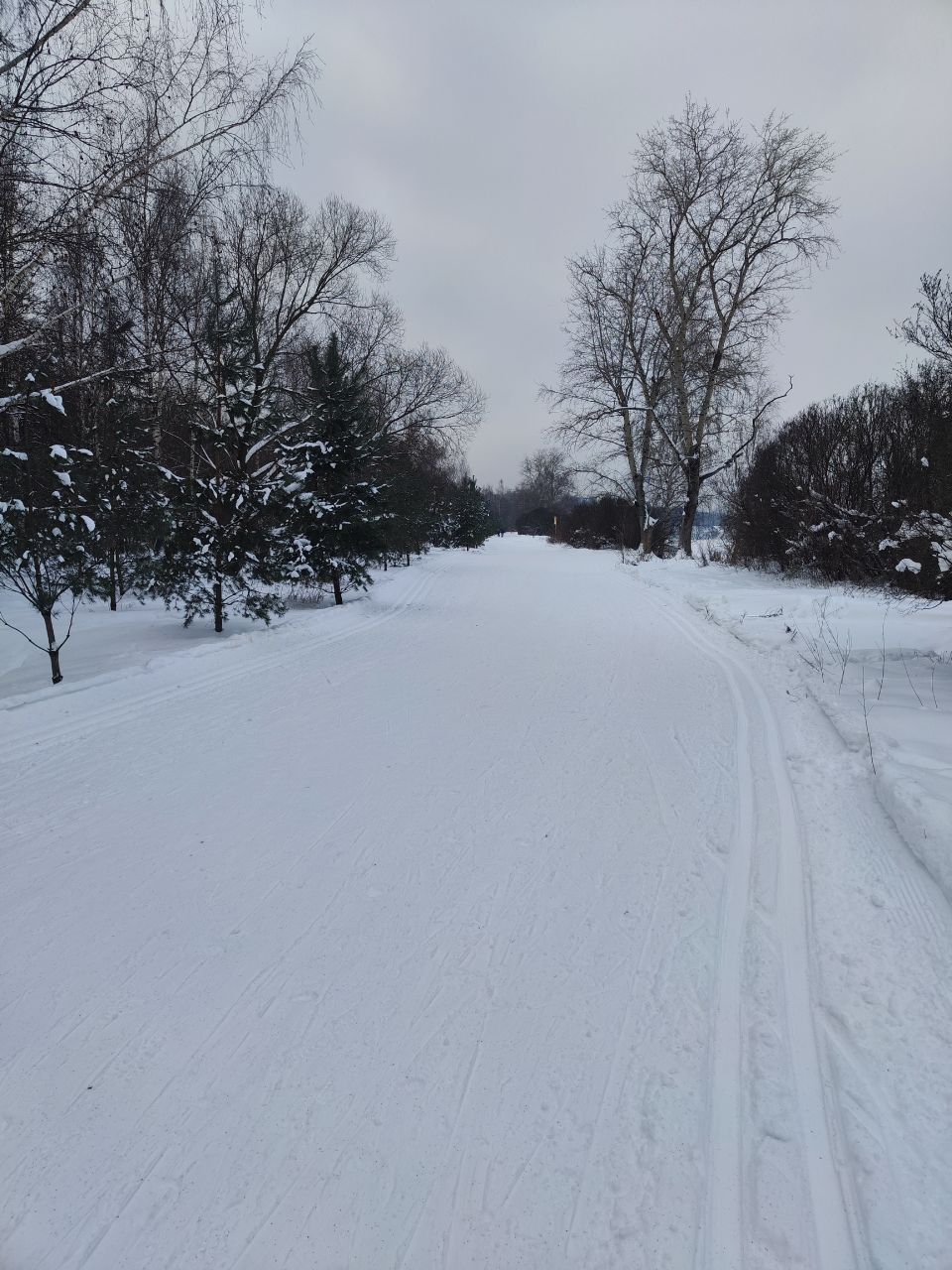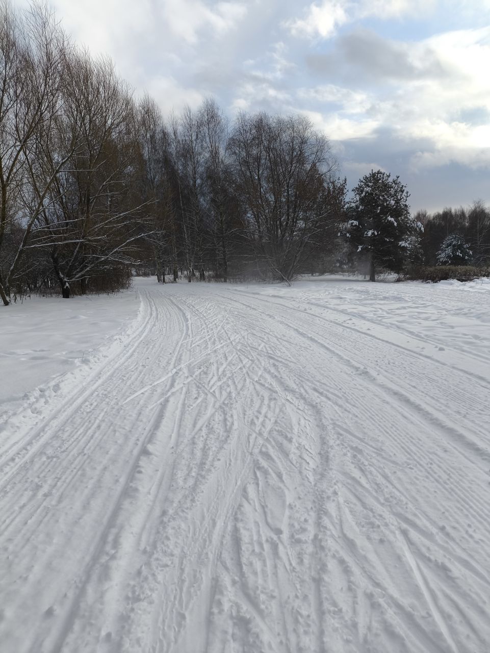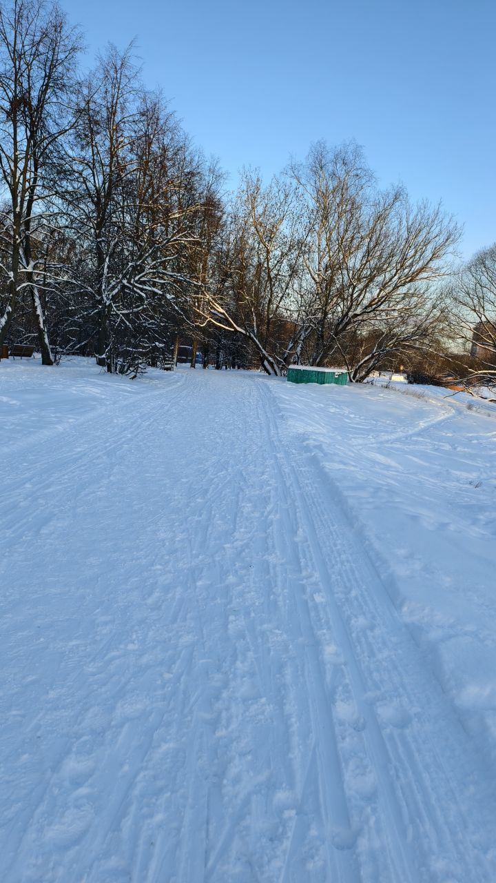 Очень даже неплохая парковая лыжня, качество подготовки приятно удивило. Местами даже широко, присутствует колея под классику. Правда по ходу движения есть несколько смычек, где достаточно узко: пешеходная тропа, детская горка, аккуратнее надо. Собачники и прочие гуляющие везде в наличии, объезжаемые, пусть и не всегда без мата. Освещения на самой лыжне нет, но в целом можно и без фонаря. Не помешало бы в будущем, конечно, добавить навигацию, но в целом после 2 круга всё и так понятно, куда и что. Парковок рядом с трассой нет, ближайшая на улице Исаковского во дворах, минут 5-7 пешком.