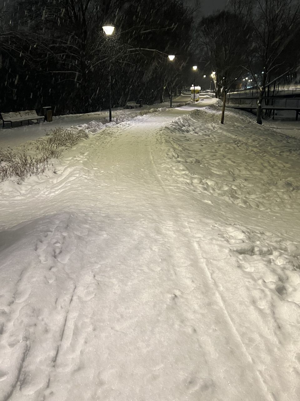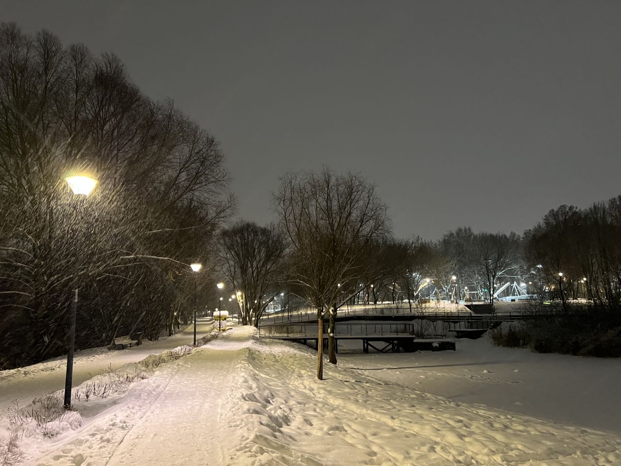 Ратраком нарезаны 2 классические лыжни по велодорожкам немного более 1 км в сторону Свиблово. В нескольких местах есть пересечения с пешеходными дорожками, но не критично, т.к. снег чистый. Жаль, что не сделали под конек