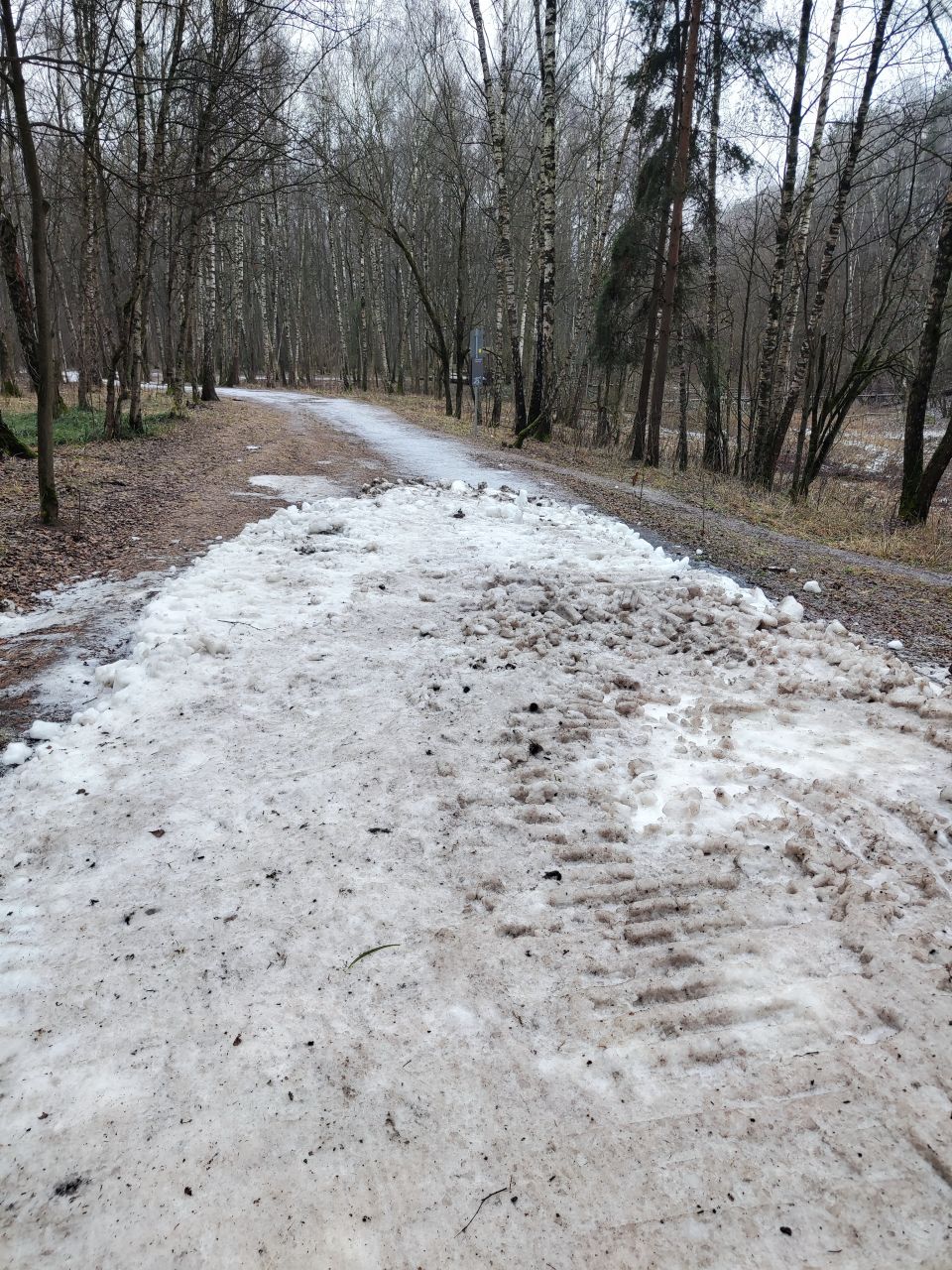 На данный момент лежит ок 1,2 км подушки. Трасса просела под оттепелью стала грязной , критически неровной, кое где её разворотили техникой, и стала непригодна для катания ( Кататься на такой трассе опасно для здоровья и лыж), требует ремонта и регулярного использования ратрака.
