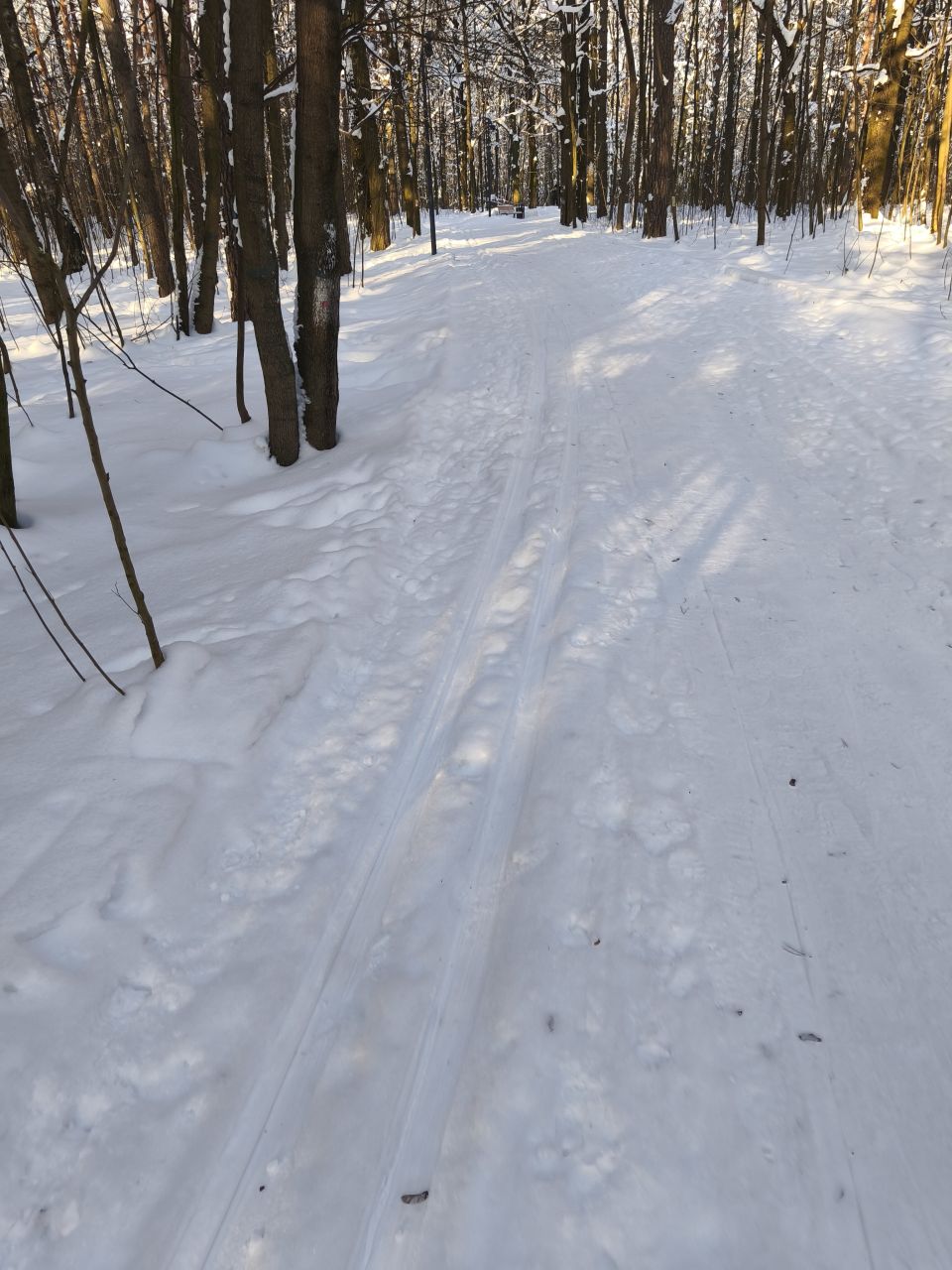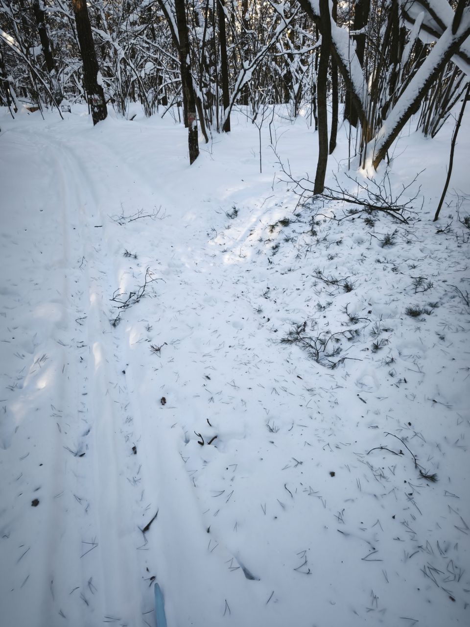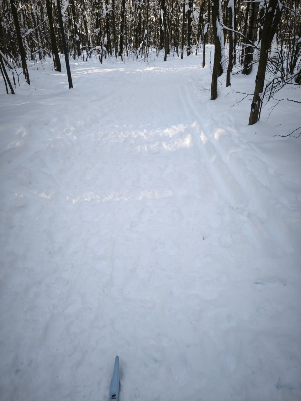 Теперь по трассе: есть классика и совмещенная с пешеходными тропинками накатка под конёк. По той части, где я смог прогуляться классика хорошо, а вот коньковая часть: асфальт. Со слов работника парка трасса готовится снегоходом и в дальней части парка качество намного лучше, чем то, что на фото; а здесь затоптали гуляющие. Проверять не стал: придется верить.