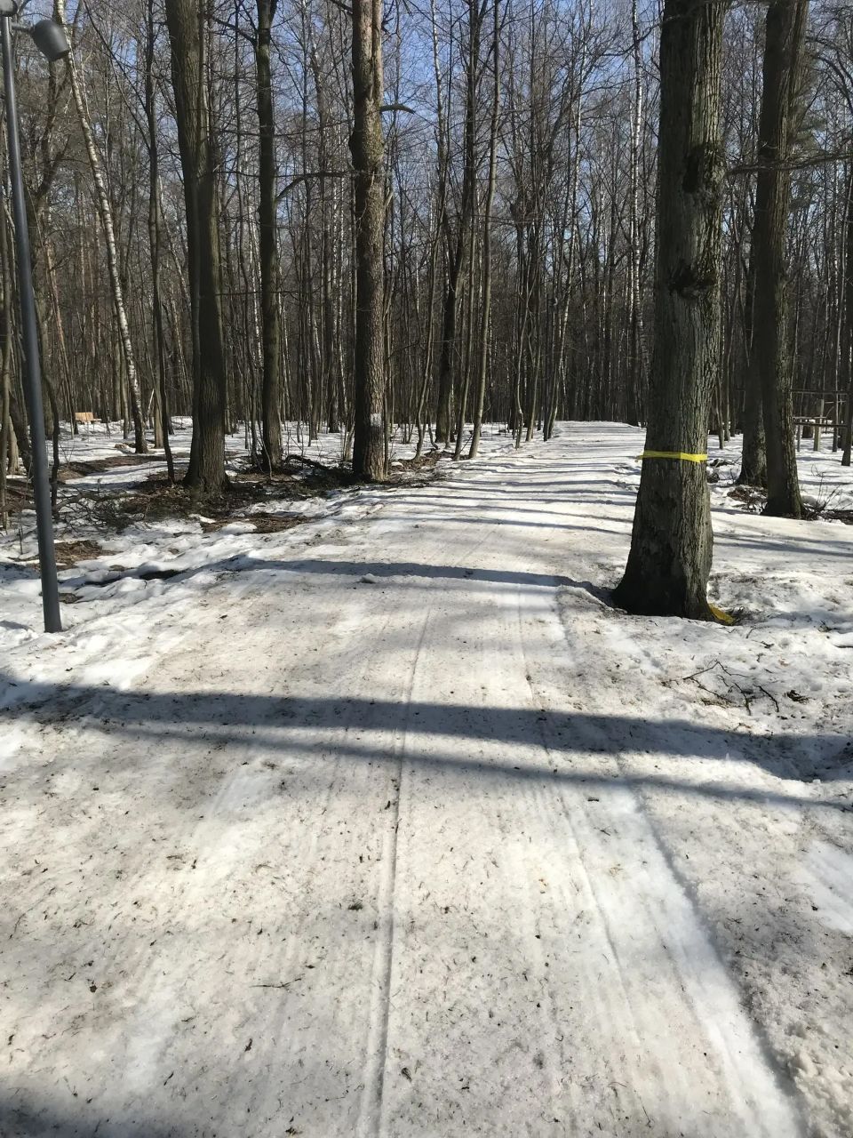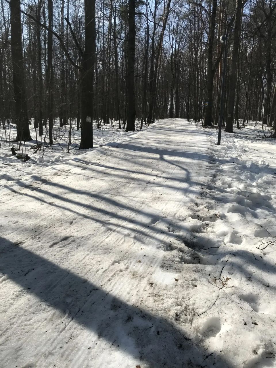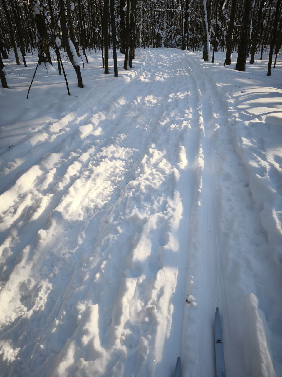 Теперь по трассе: есть классика и совмещенная с пешеходными тропинками накатка под конёк. По той части, где я смог прогуляться классика хорошо, а вот коньковая часть: асфальт. Со слов работника парка трасса готовится снегоходом и в дальней части парка качество намного лучше, чем то, что на фото; а здесь затоптали гуляющие. Проверять не стал: придется верить.