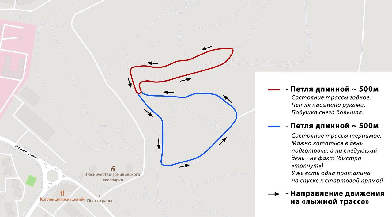 Организовали трассу в созданном этим летом-осенью парке Чемпион. Конфигурация трассы несколько отличается от накатываемой до реконструкции. По состоянию воскресенье была нарезана классика и накатана под конёк снегоходом. Присутствует освещение. Минус в том, что трасса находится в парковой зоне активно используемой для прогулок местными жителями в том числе с детьми и собаками со всеми вытекающими последствиями