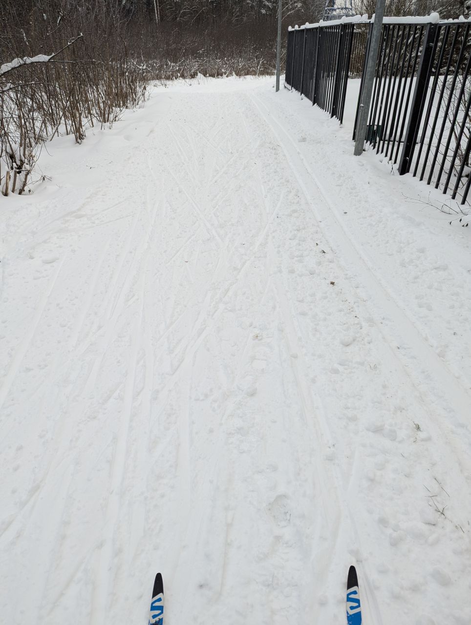 Очень много веток, крупных и мелких. Два дня назад был обильный снегопад, но коньковая трасса по большей части вытоптанный бетон, будто по ней полк солдат прогнали.