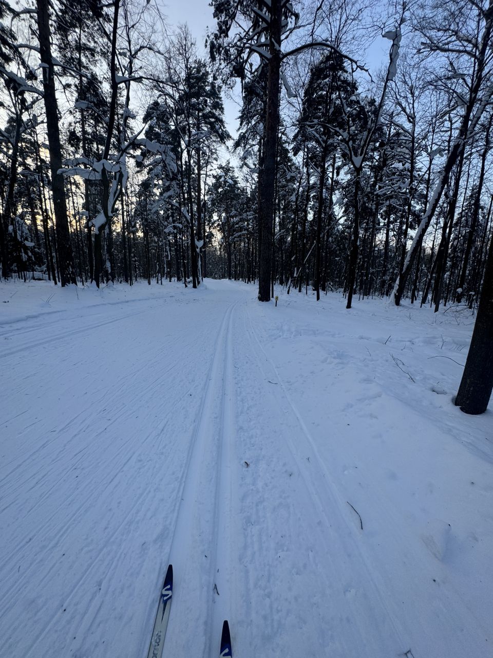 Трасса отлично подготовлена, ровная, но скольжение тугое и холодно.