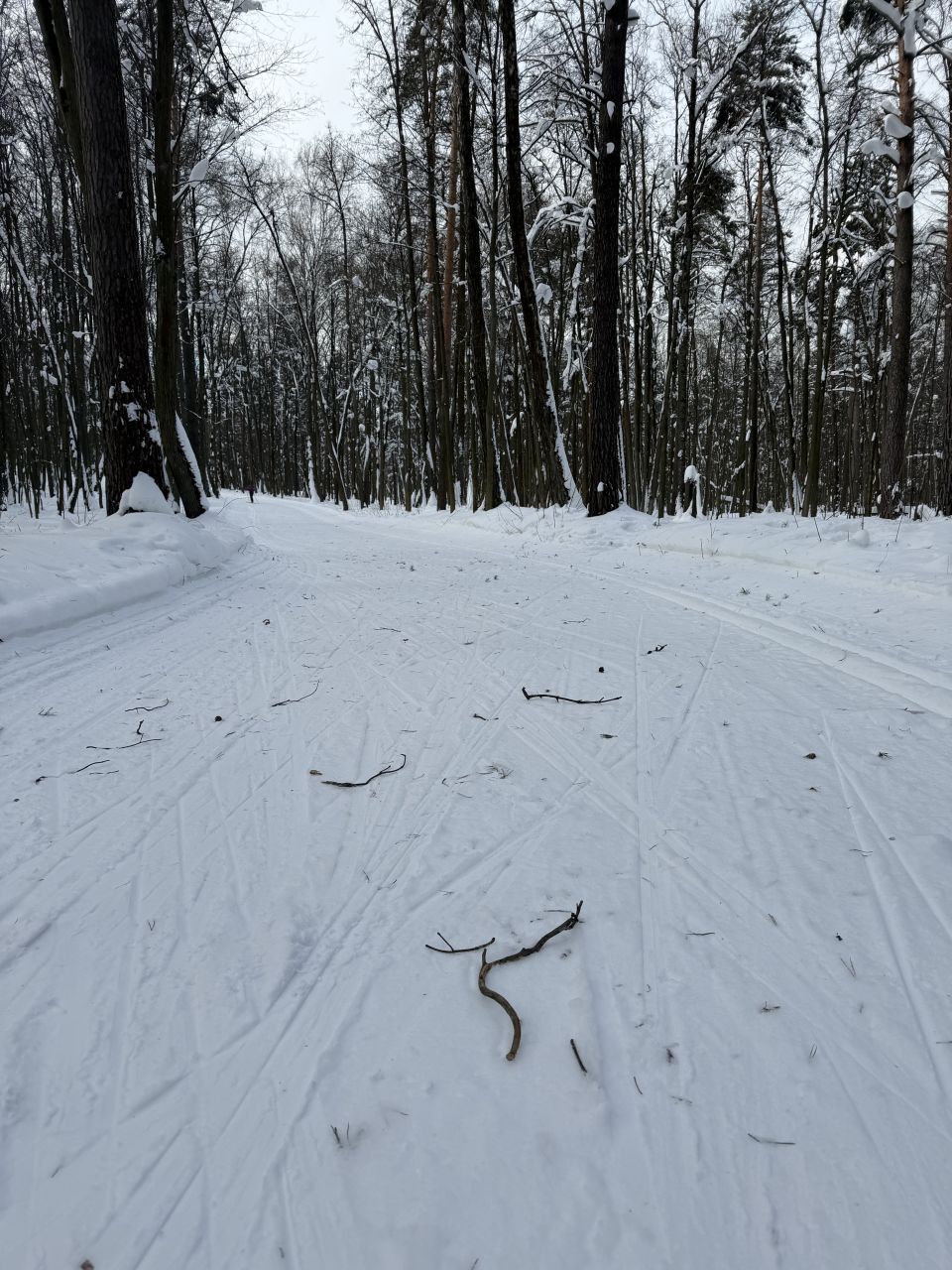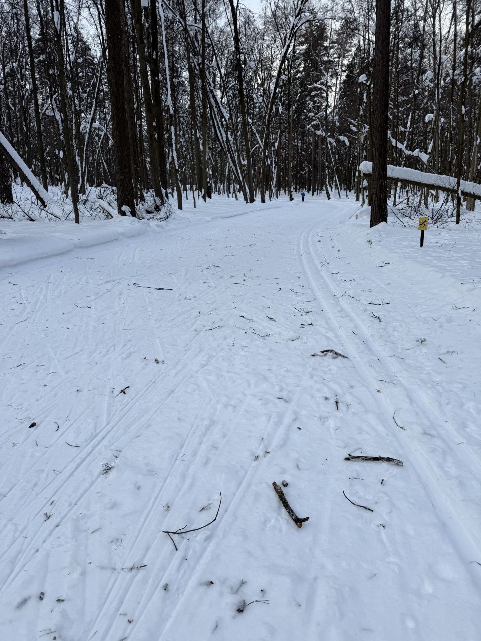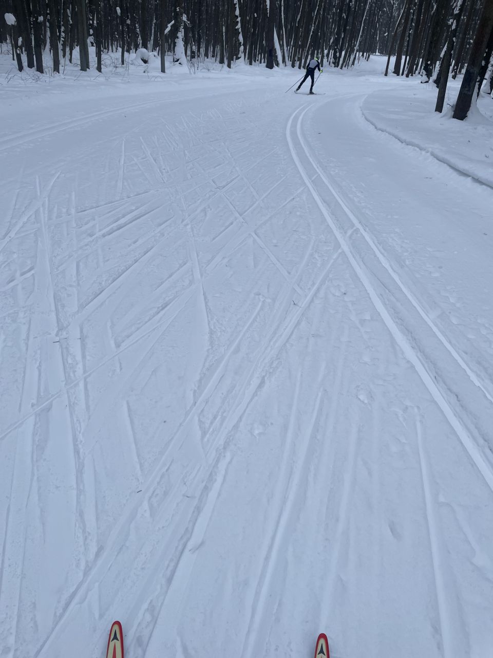 Каталась 11 февраля с 16:30 до 18:30. Все ветки, шишки и хвоя, которые были в понедельник, то ли подмели, то ли снегом засыпало, остатки совсем не мешали. Трасса очень приятная, мягкая, но катилось хорошо. Лыжня есть на всём протяжении, местами даже по обеим сторонам трассы, по виду хорошая. В горках, если съезжать не в лыжне, можно неожиданно угодить на бугры, которые образовались из снега, нападавшего кучками с деревьев.