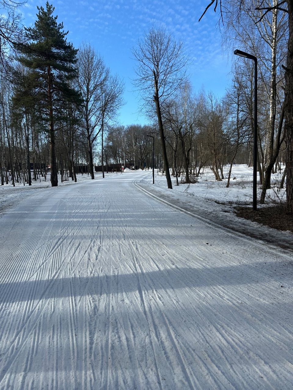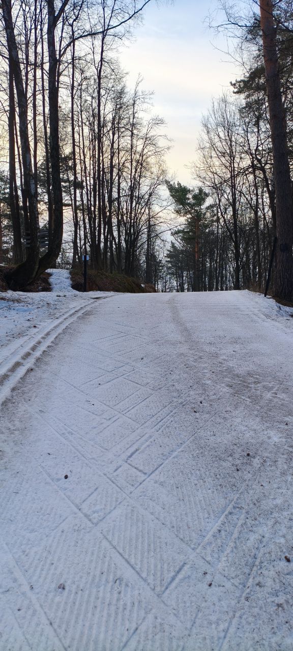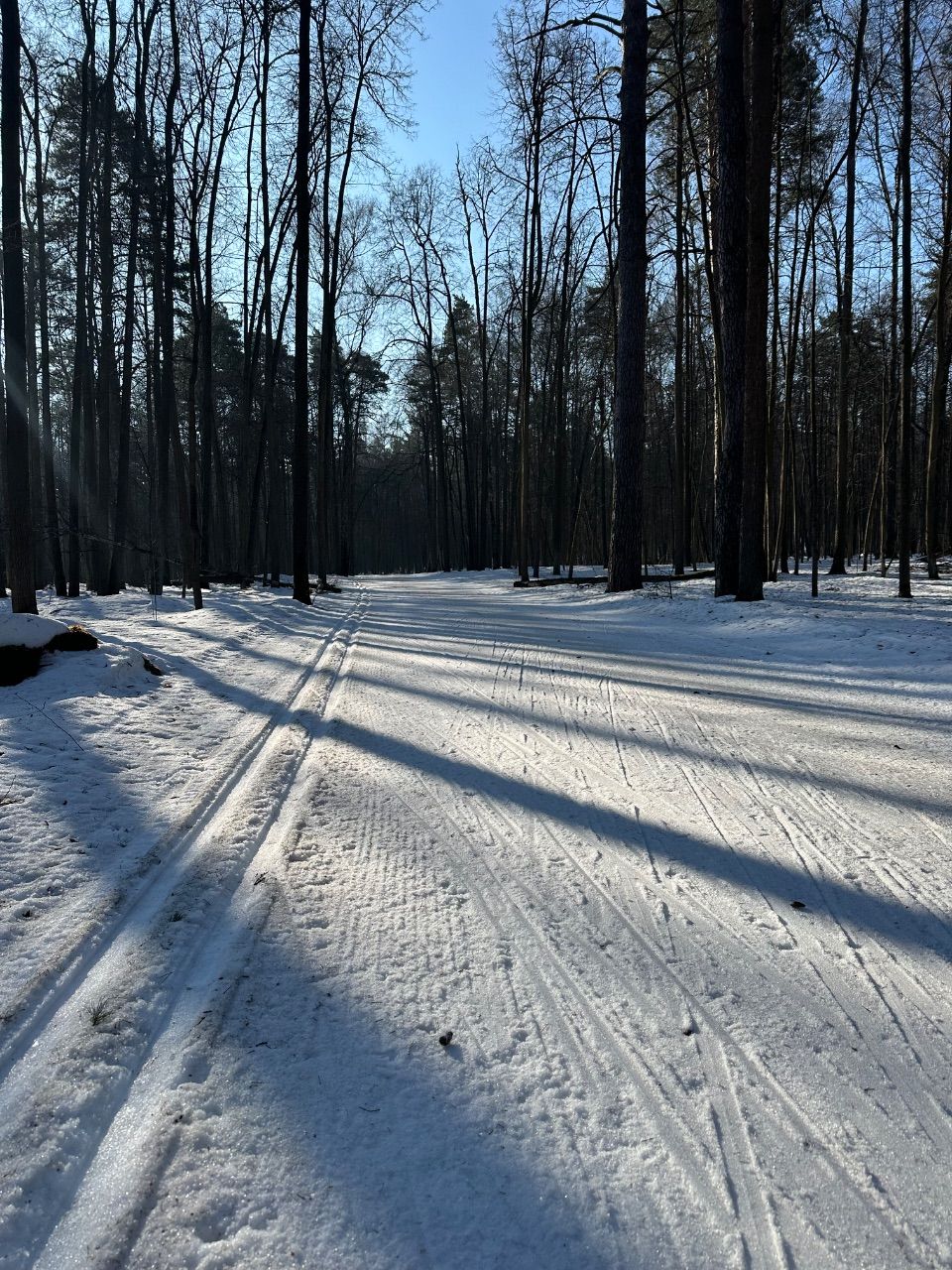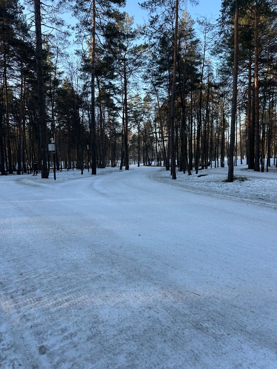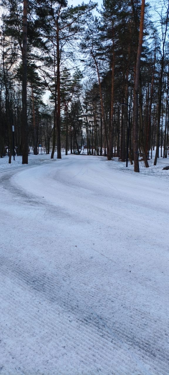 С 7:30 до 9:00 на градуснике было -3С, подготовлен круг с классикой 9 км (по garmin’ам). Трасса в хорошем состоянии, ровная, леденистая с Фирном. Снег чистый белый или бурый от иголок, из мусора только шишки попадаются. Пару проблемных участков на верху подъемов, проезжаемы.