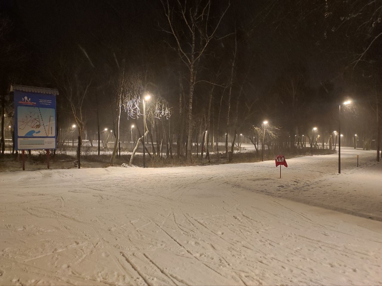 Трасса в прекрасном состоянии на вечер 15 января, спасибо лыжному клубу, который её готовит. Платная парковка тоже. На бесплатной никаких 40 машиномест, заявленных администрацией Лыткарино, даже близко нет. Вся завалена снегом, под колёсами каша местами выше дна обычного седана. Кое-как на Логане залезла на сугроб недалеко от въезда, выехать без использования лопаты не получилось.