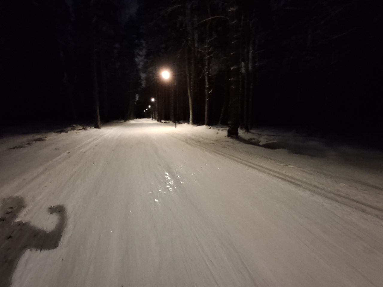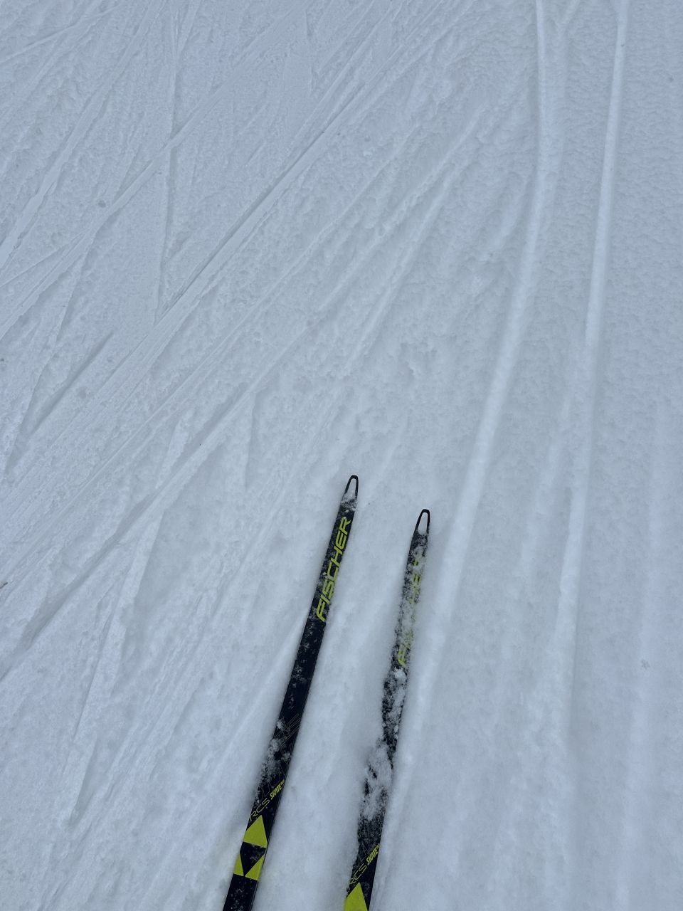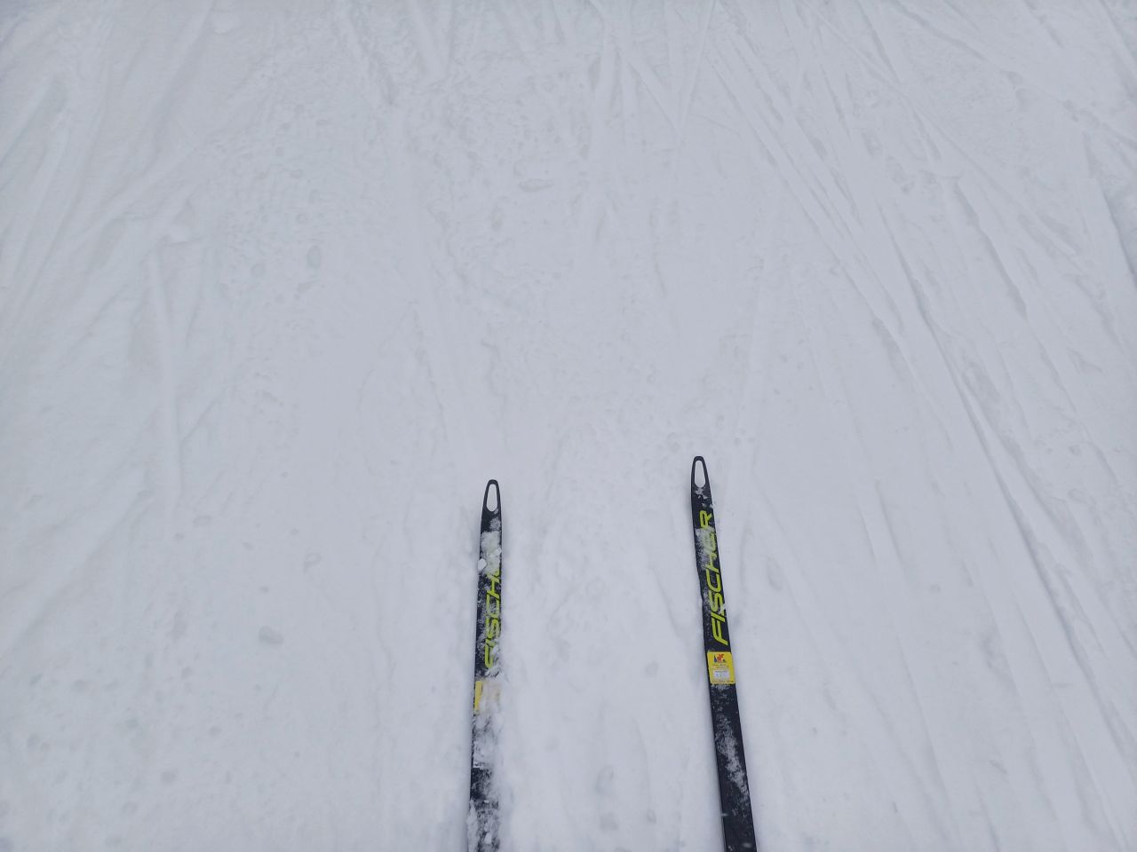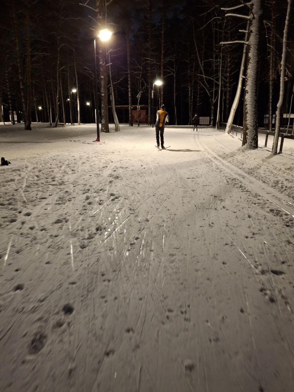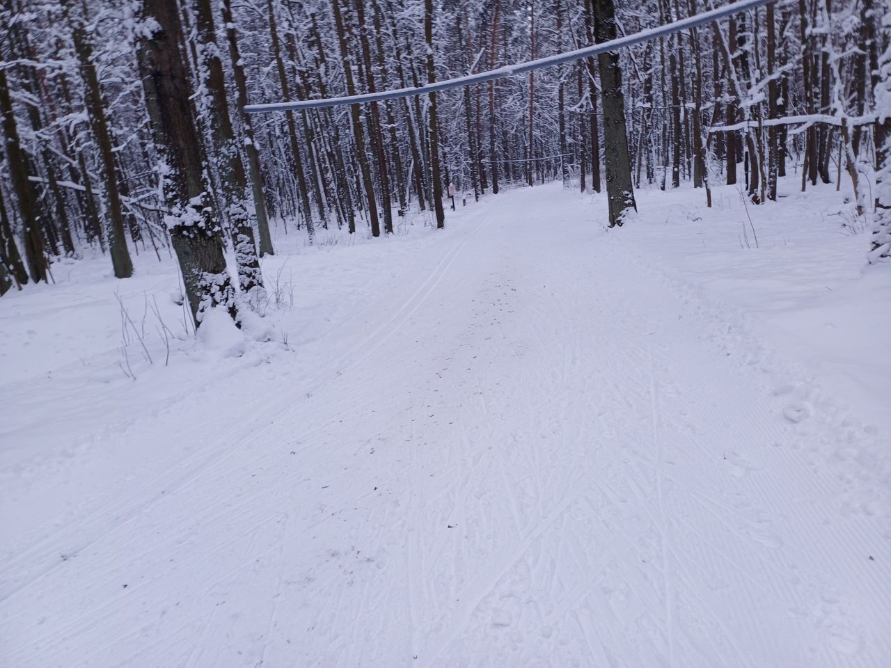 Сегодня отличная трасса. На болоте уже все ровно. Вся трасса плотная. Чуть присыпало легким снежком, скольжение показалось тяжеловатым.