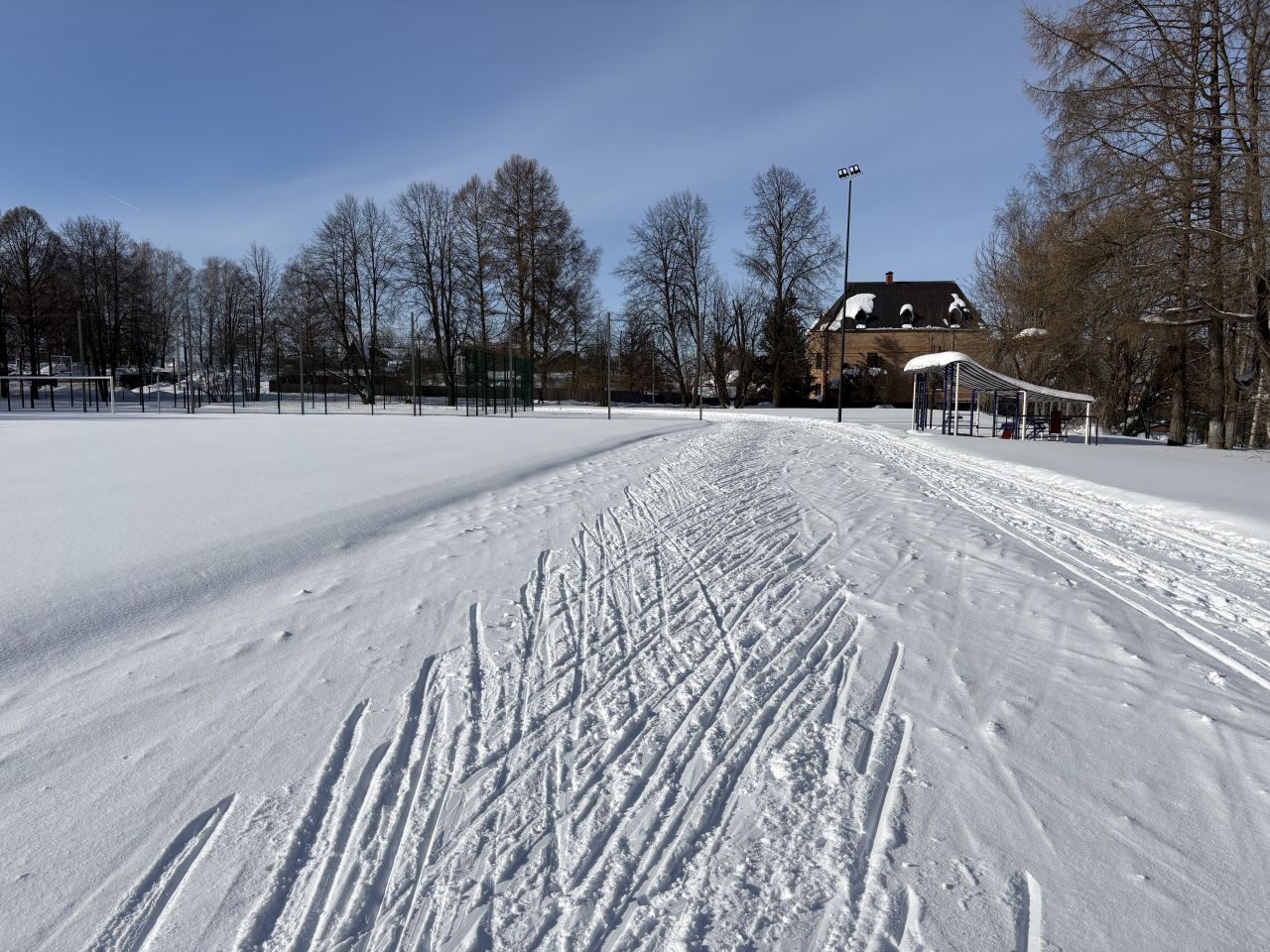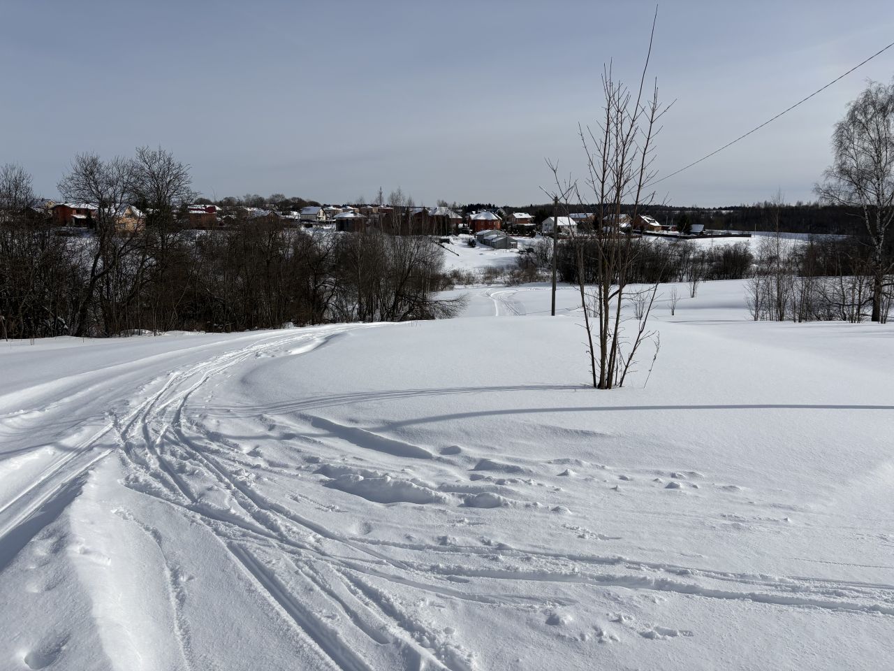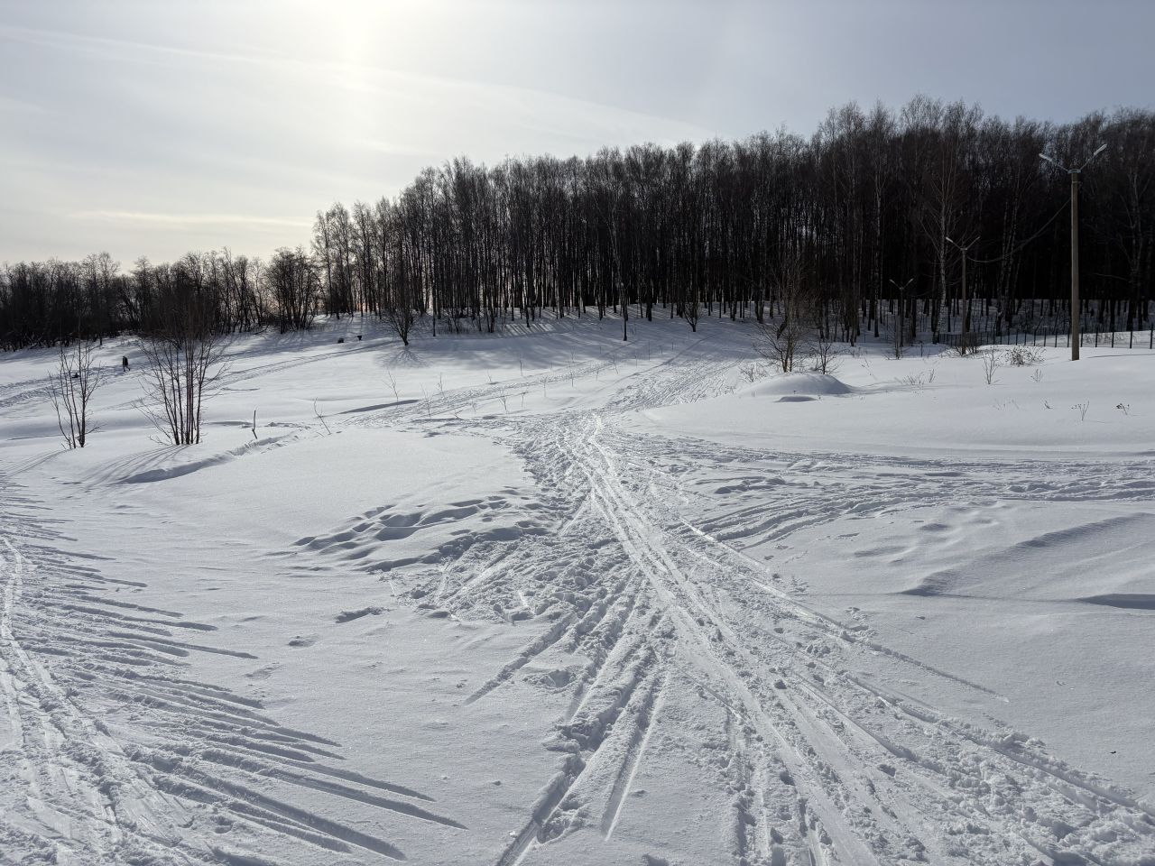Трасса в Волоколамском городском парке. Снег чуть тормозит под солнцем. Основной круг рыхлый, но потихоньку прикатывается.