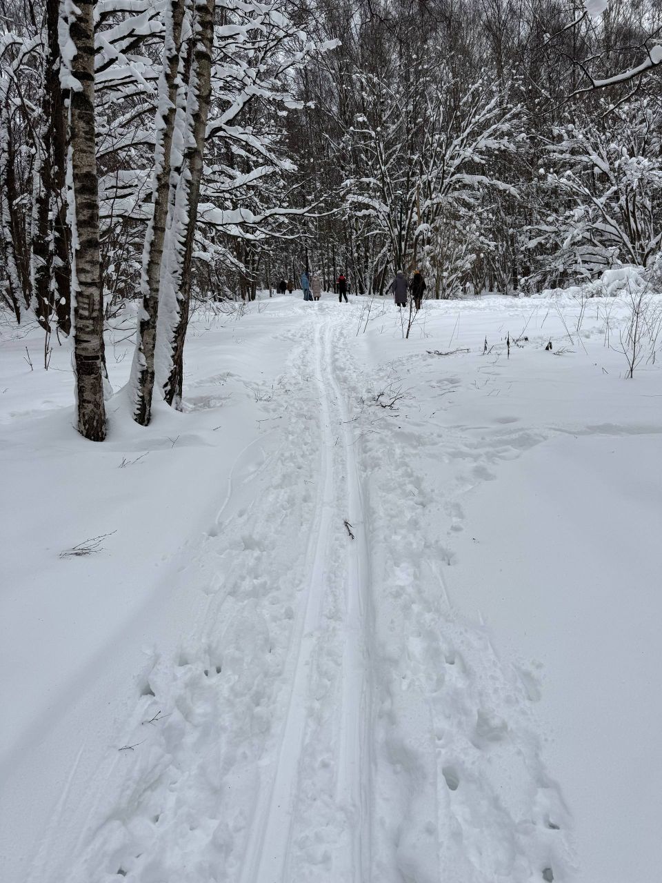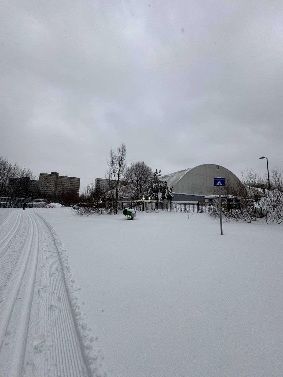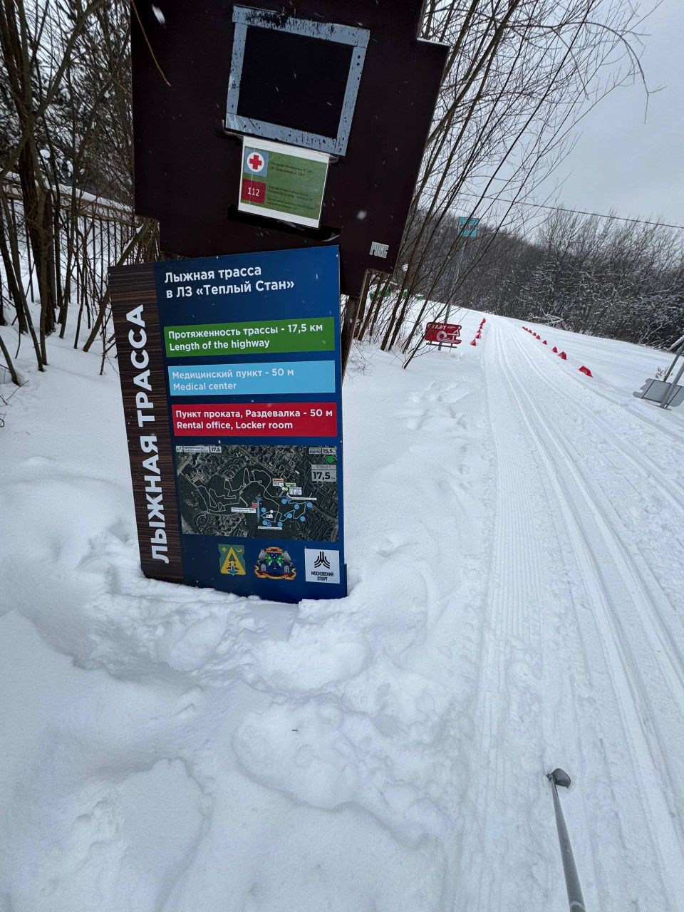 Стенд в начале лыжного маршрута, указанный на стенде километраж лыжни не имеет пока отношения ни к реальной разметке, ни к подготавливаемой лыжне. Участок около 1-2 км начали периодически подготавливать ратраком. Также замечена снежная пушка.