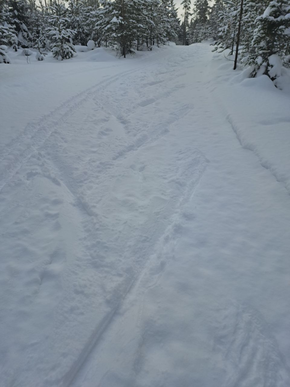 Большой круг засыпало снегом (примерно по щиколотку), но он лёгкий, а основа плотная и ровная, поэтому в принципе коньком неплохо. Лыжню протоптали (по старой колее, на вид ровно).