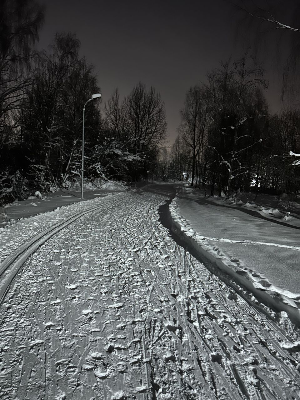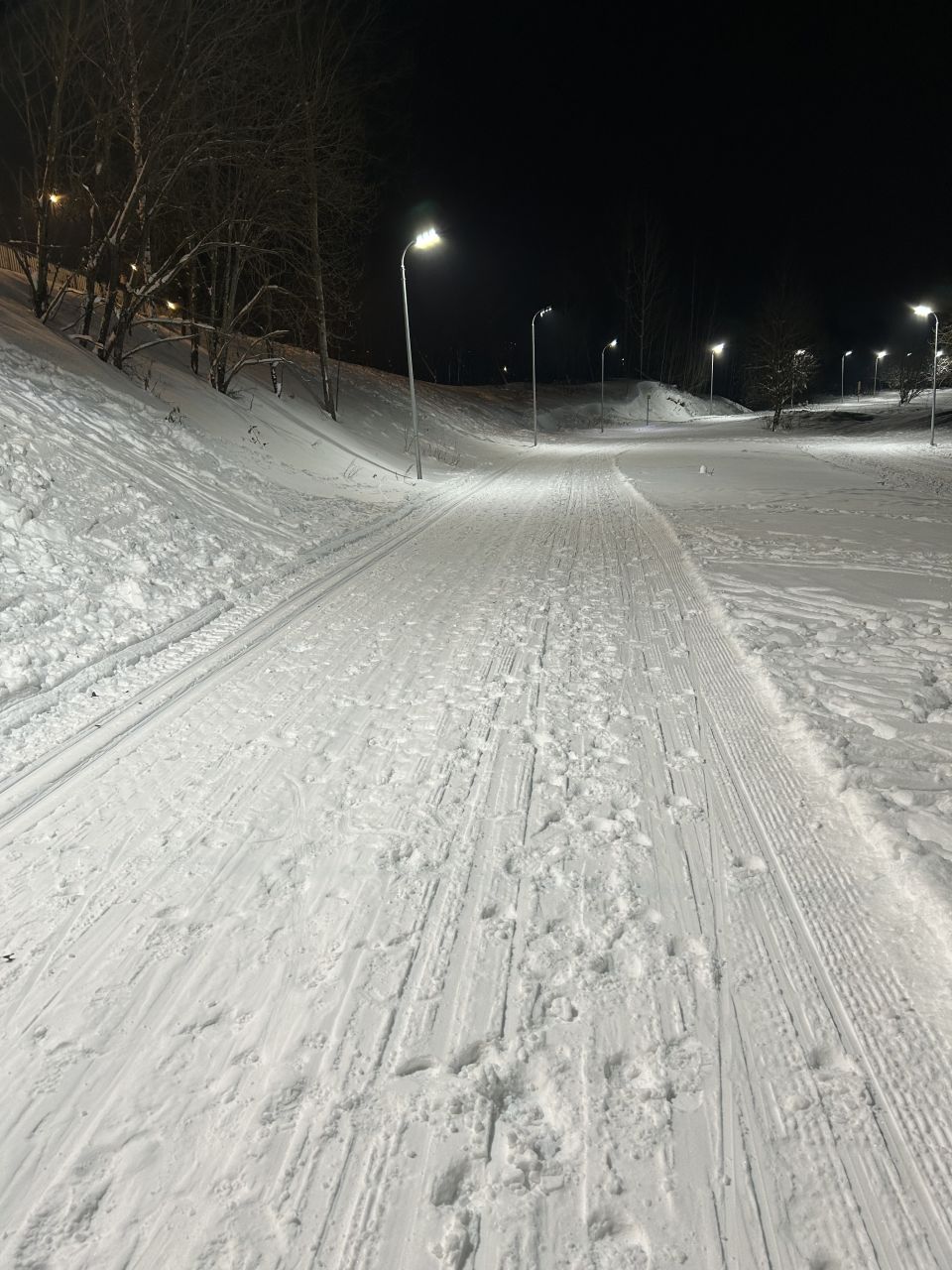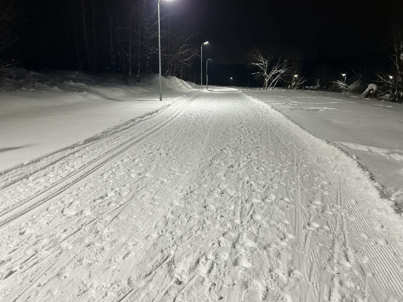 Под классику лыжня есть на всем протяжении круга, для конька все затоптано довольно сильно, с 1400 до 1800м освещение не работает, но пока снег трассу видно.
