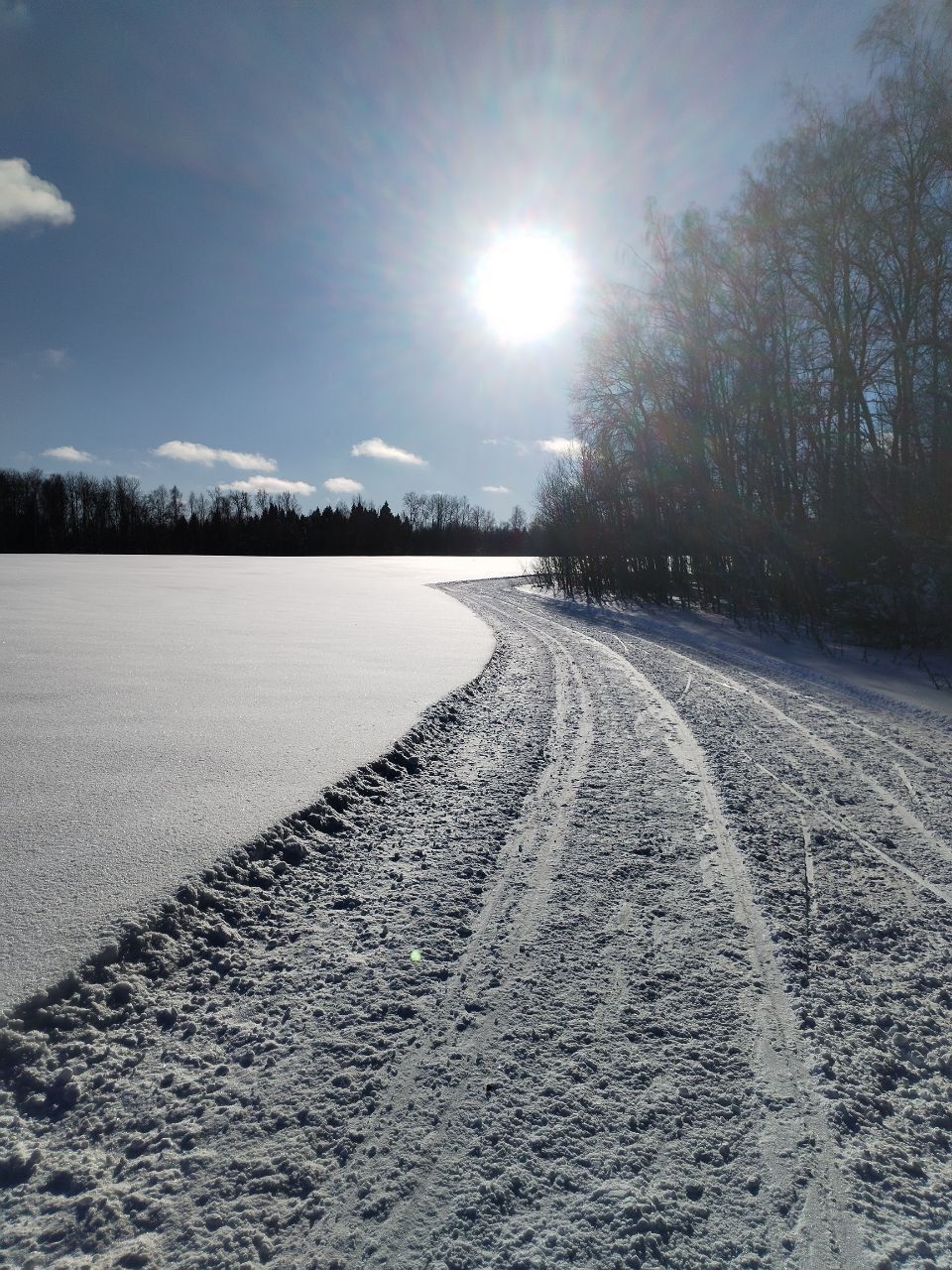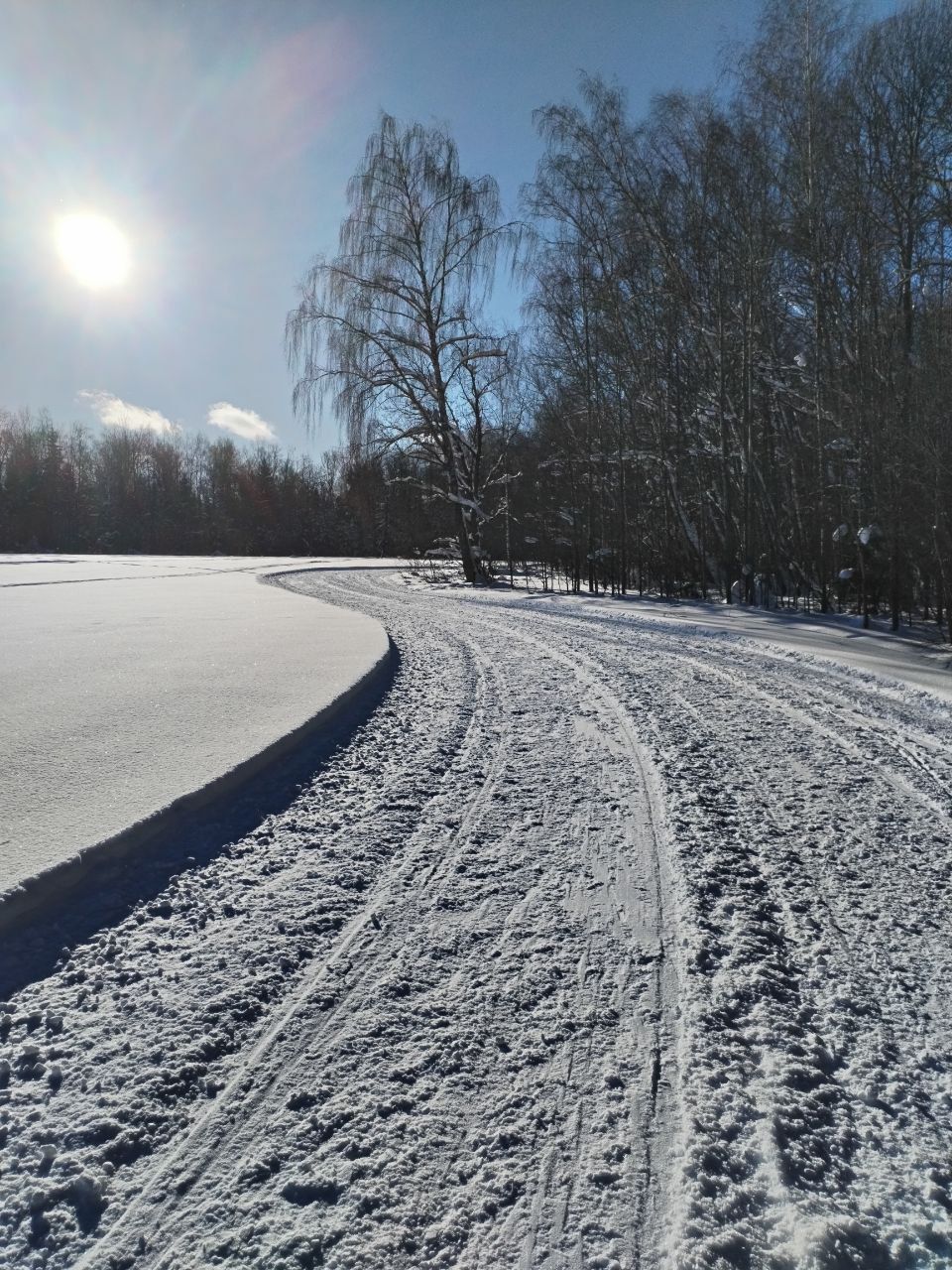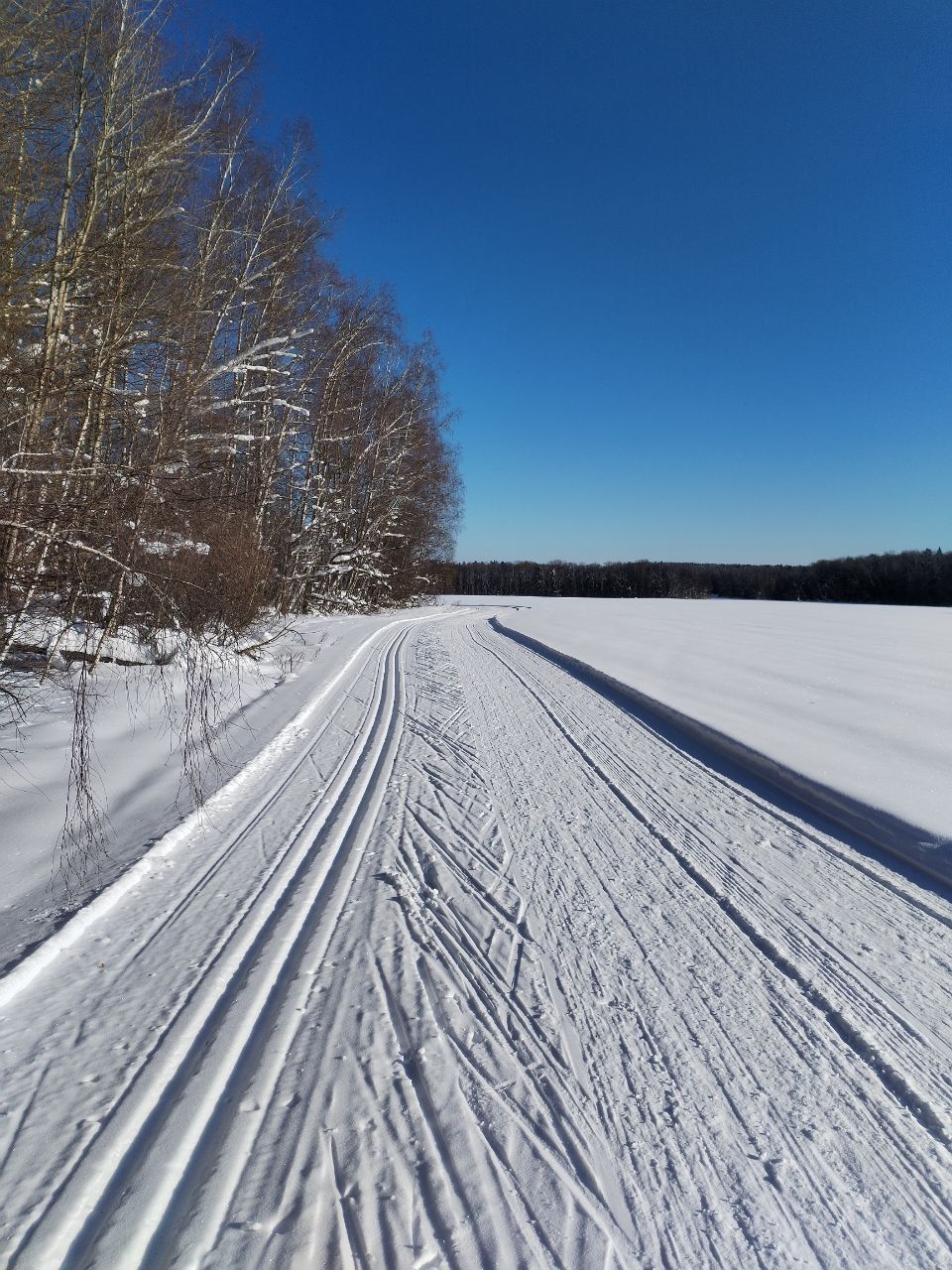 Утром с 9:30 и до полудня трасса леденистая, полотно в жестких следах от прокатов накануне, лыжня для классики/дабла постепенно становиться не глубокой. Можно поездить по полям, наст держит. Но поля не идеально ровные, волнистые, поэтому пойти коньком не получится качественно. Даблом опять же пожалуйста. Кстати, там где снопы травы на поле, видно что местами снежная подушка больше 50 см. Ближе к полудню подтягиваются лыжники, довольно много, все стараются докататься за зиму. В целом активный выезд на кардио, в основном даблом. Солнце и хорошее настроение обеспечены. Пока с лыжами не расстаёмся.