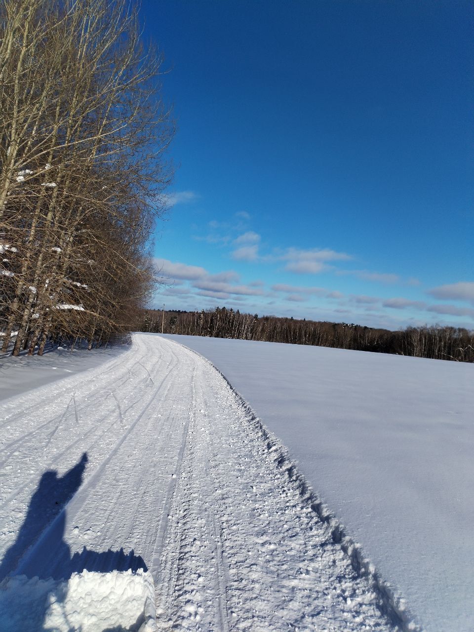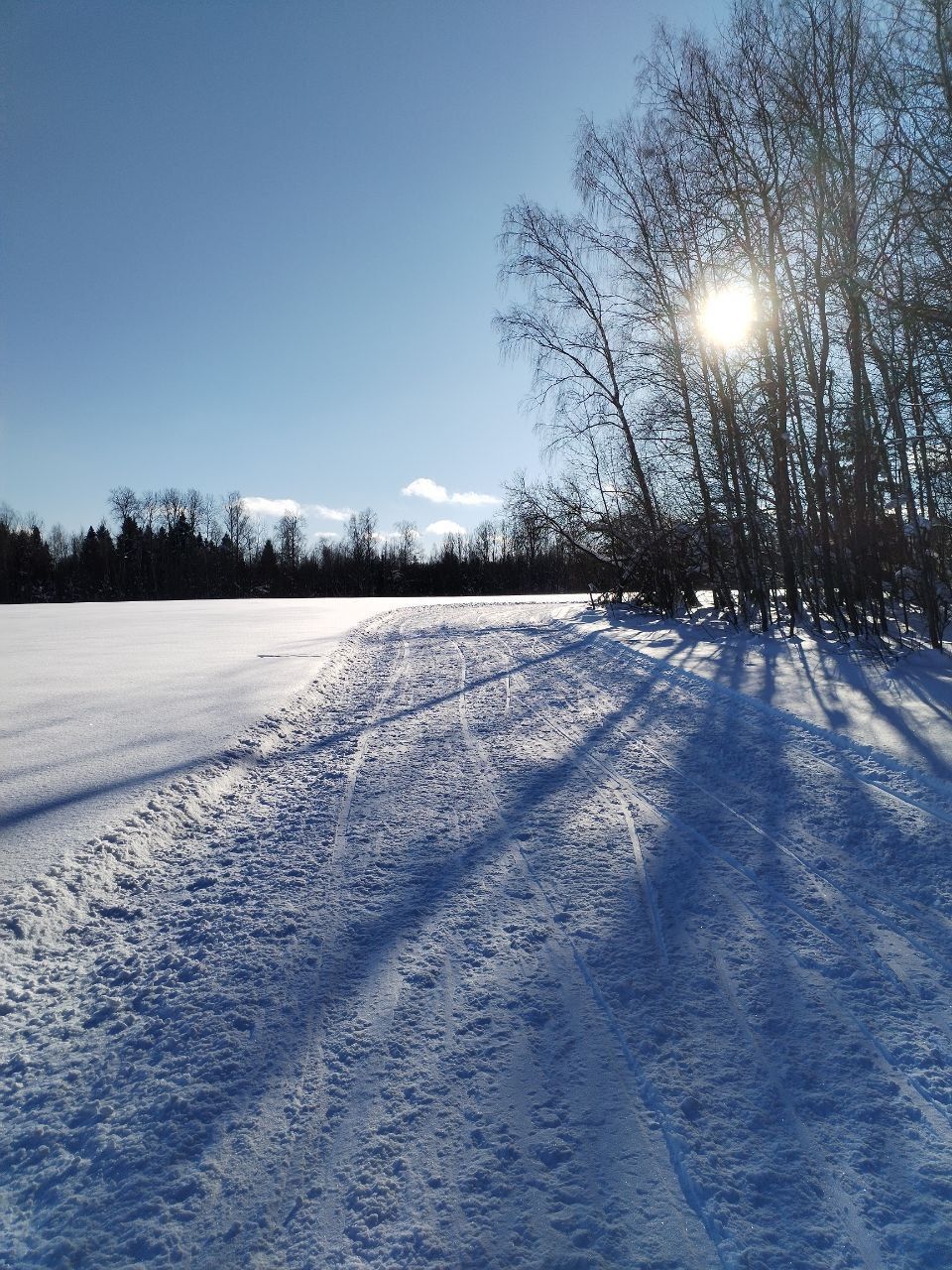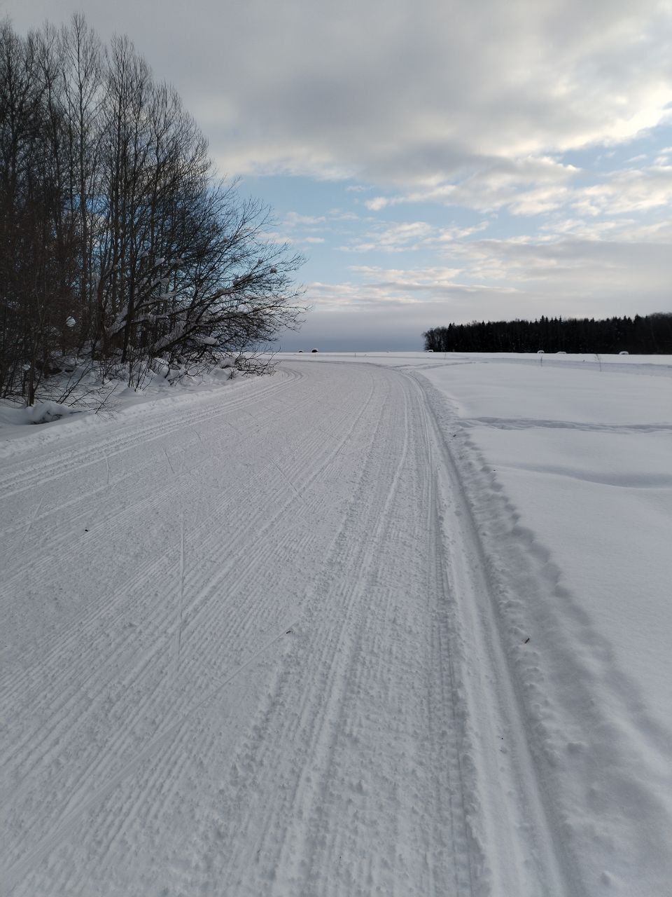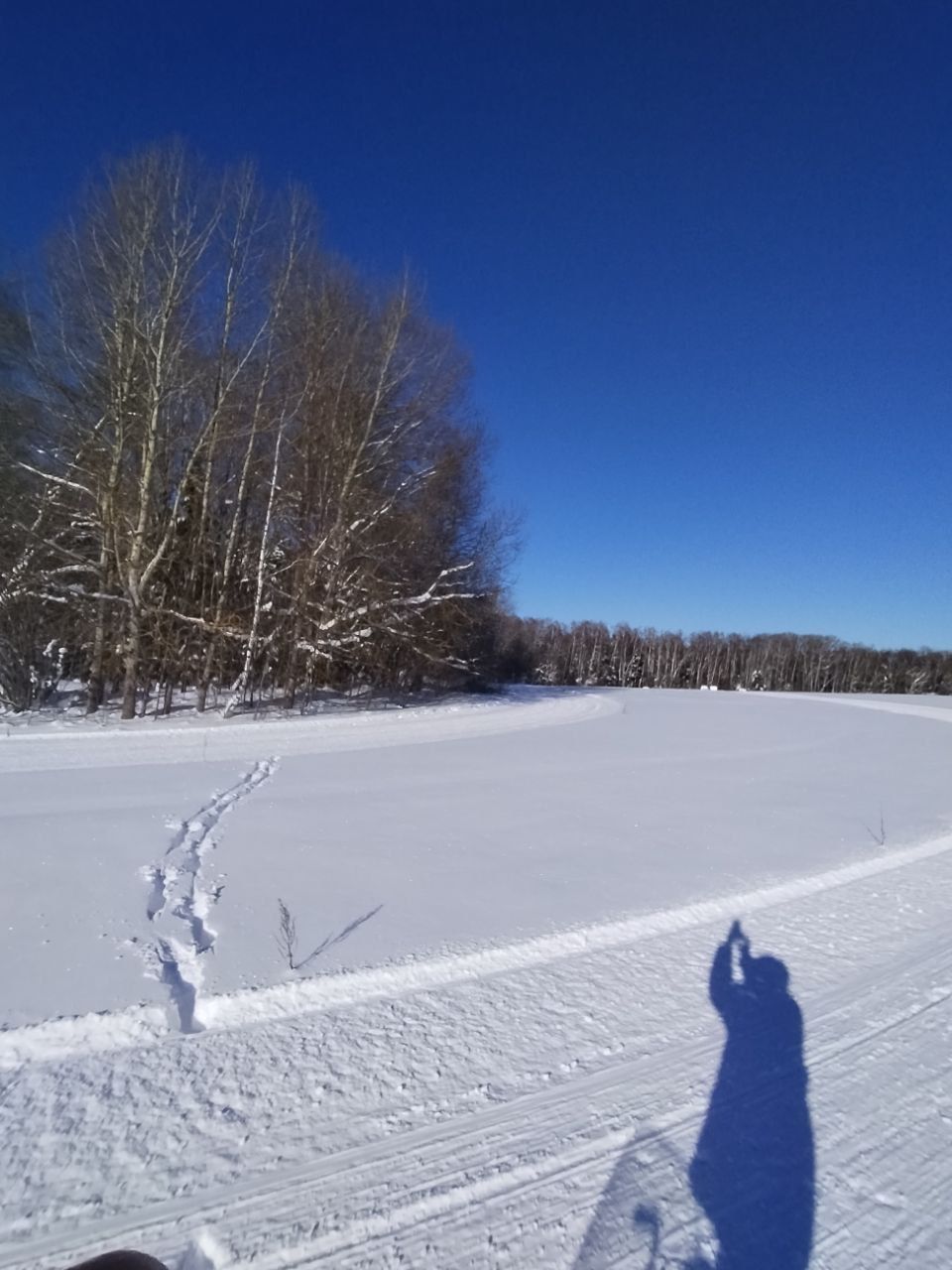 Утром с 9:30 и до полудня трасса леденистая, полотно в жестких следах от прокатов накануне, лыжня для классики/дабла постепенно становиться не глубокой. Можно поездить по полям, наст держит. Но поля не идеально ровные, волнистые, поэтому пойти коньком не получится качественно. Даблом опять же пожалуйста. Кстати, там где снопы травы на поле, видно что местами снежная подушка больше 50 см. Ближе к полудню подтягиваются лыжники, довольно много, все стараются докататься за зиму. В целом активный выезд на кардио, в основном даблом. Солнце и хорошее настроение обеспечены. Пока с лыжами не расстаёмся.