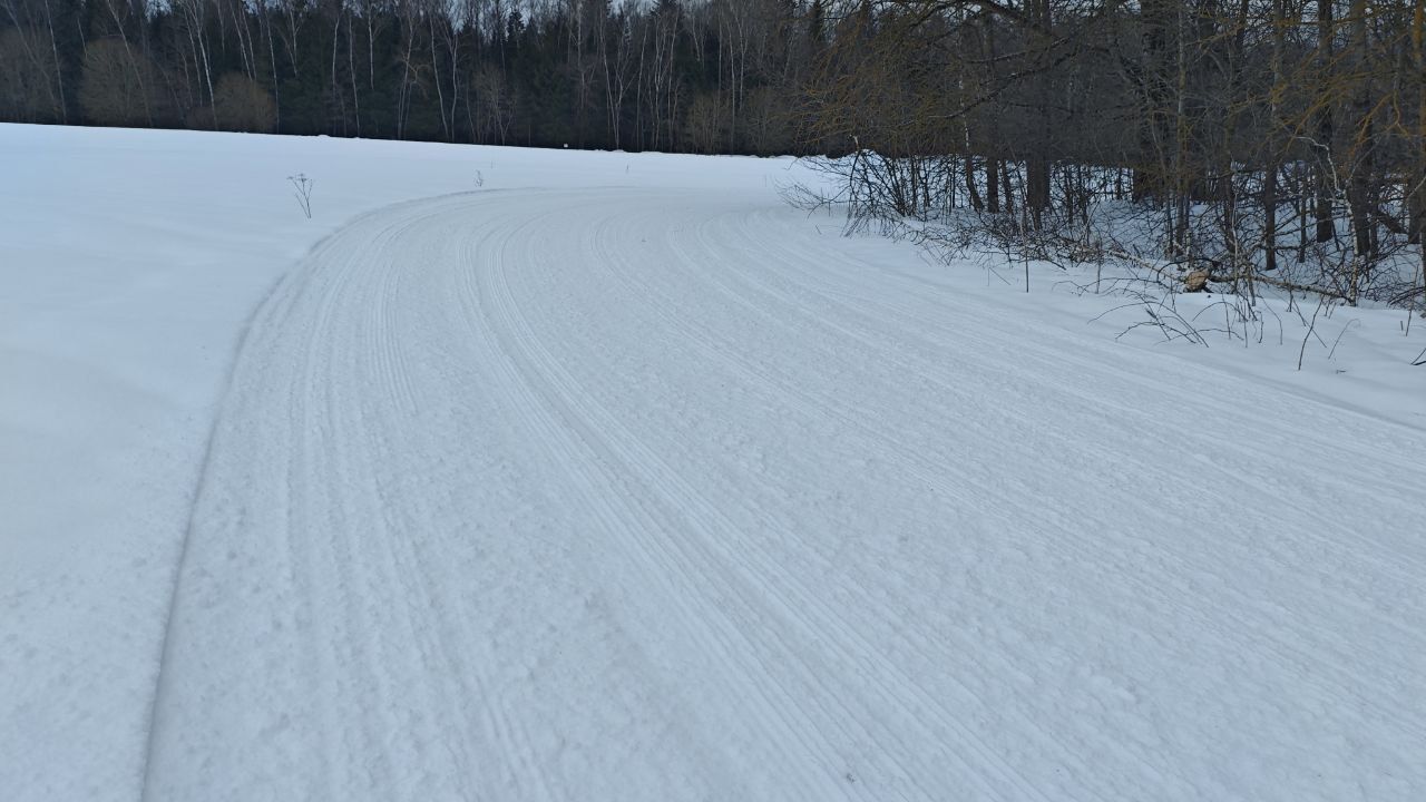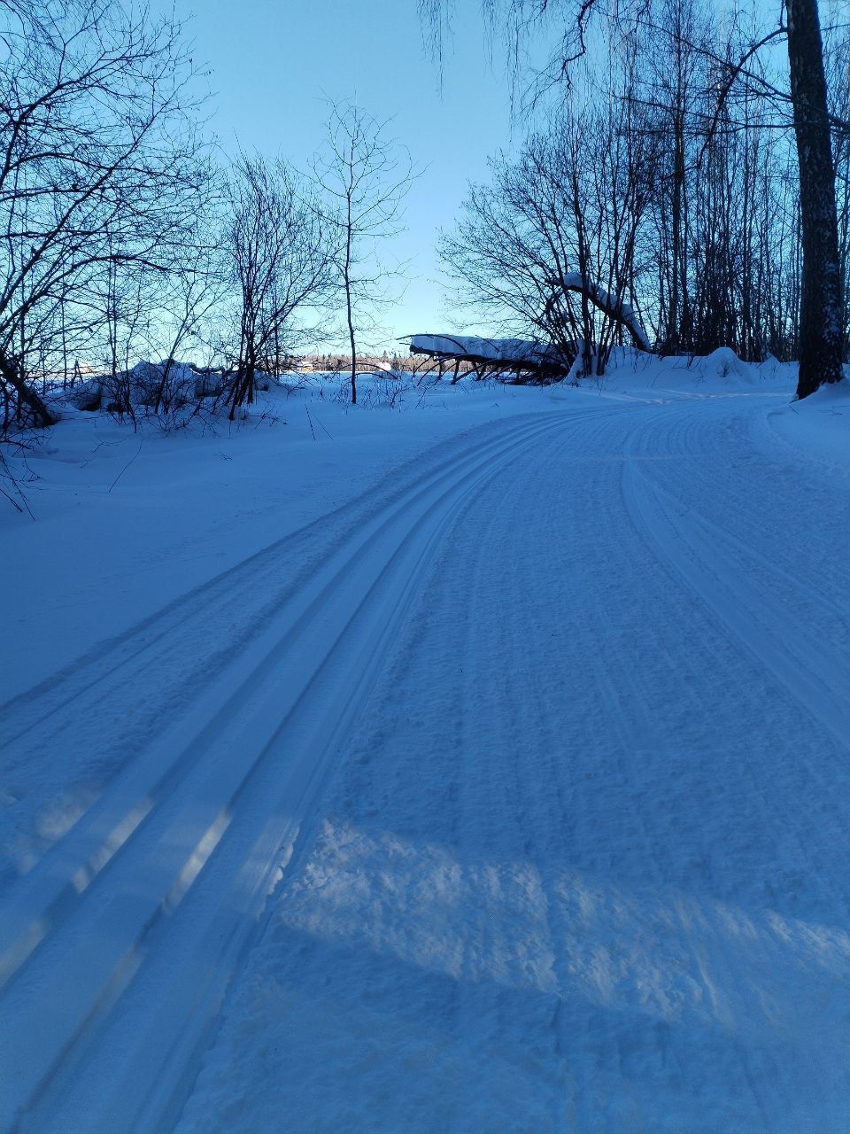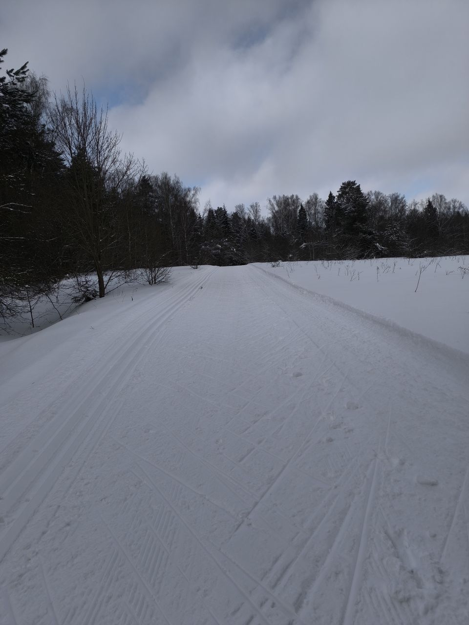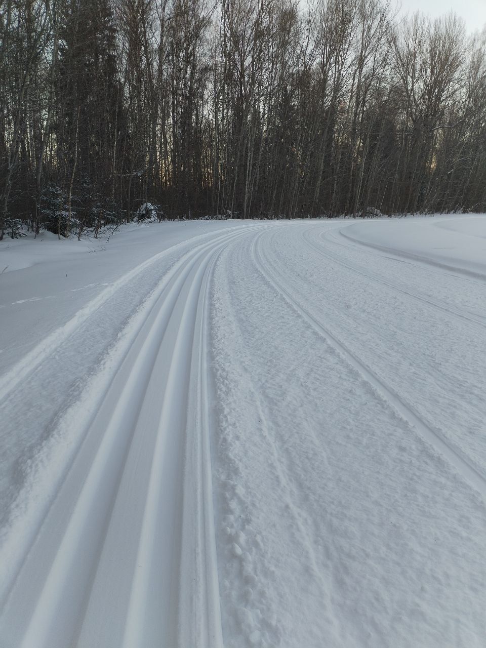 Отличная трасса. Никогда бы не поверил, что готовится энтузиастами. Кочек нет. Широко. На спусках снег плотный, не разбитый. Палки не проваливаются.